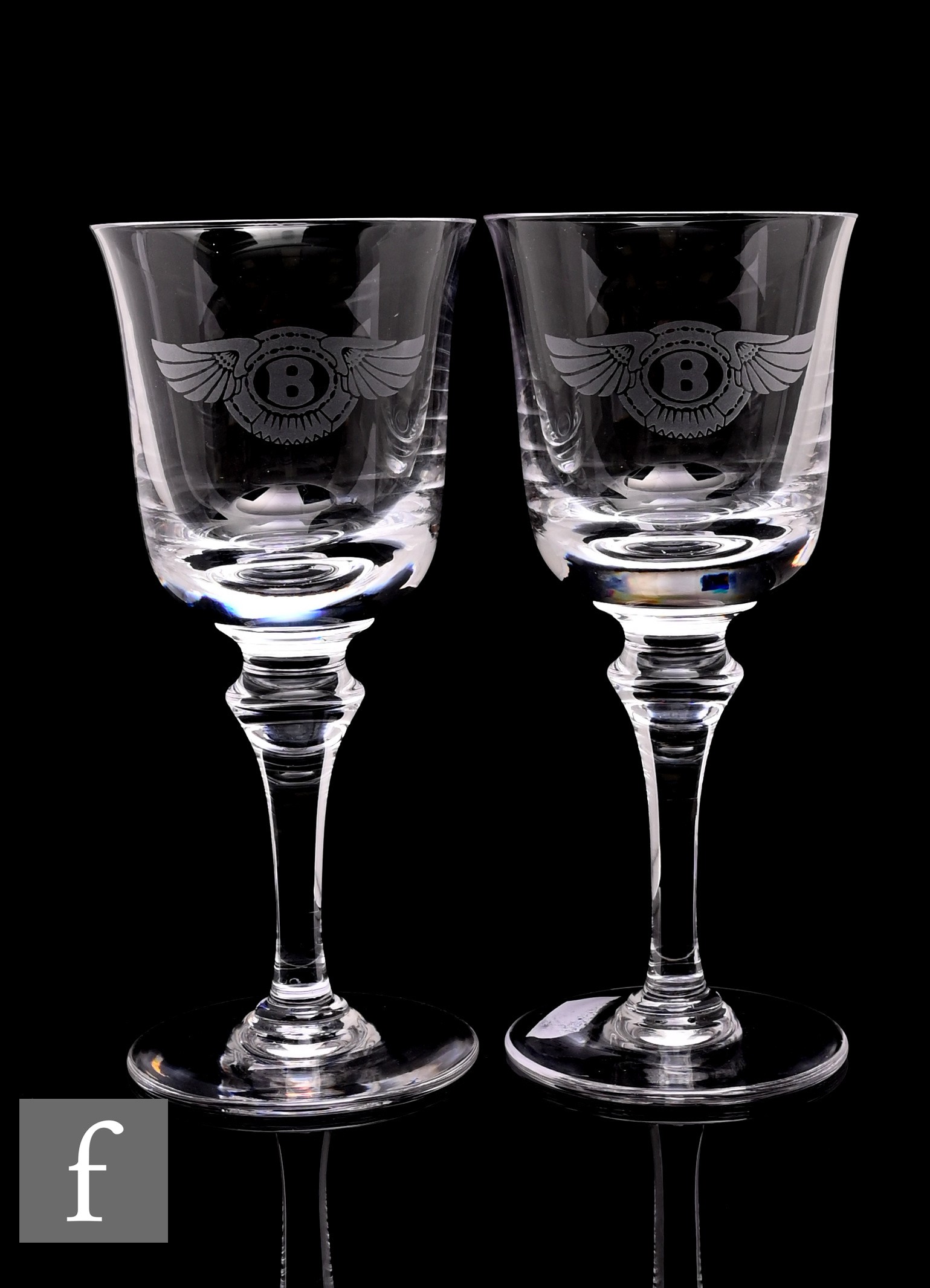 Whitefriars - A set of clear crystal wine glasses, the ovoid bowl above a baluster form stem and circular swept foot, each acid engraved with the Bentley logo with a winged B, height 16cm. (5)