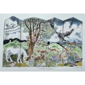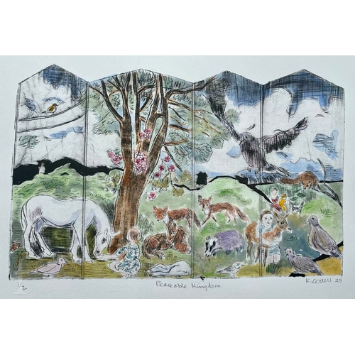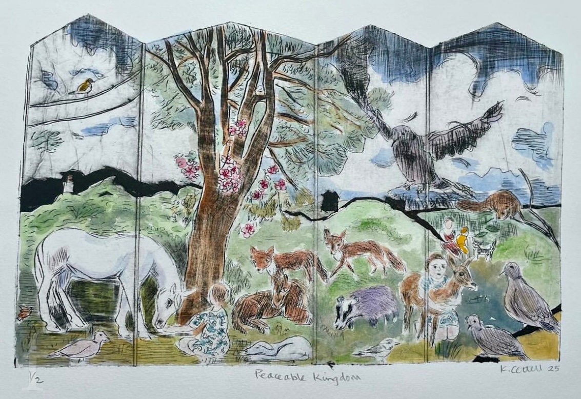 Kathleen Cottell (Printmaker and potter) - 'Peaceable Kingdom', tetrapak and watercolour, 18cm x 28cm, card mounted, 33cm x 45cm.