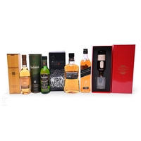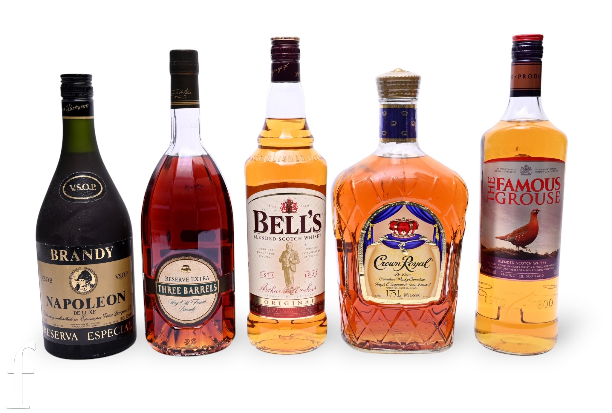 A collection of whiskies and cognacs, to include a 1.75L of Crown Royal Canadian Whisky, a 1L bottle of The Famous Grouse, a 1L bottle of Bell's, a 1L bottle of Three Barrels Reserve Extra Brandy and a 1L bottle of Napoleon Brandy. (5)