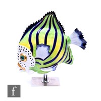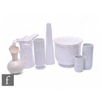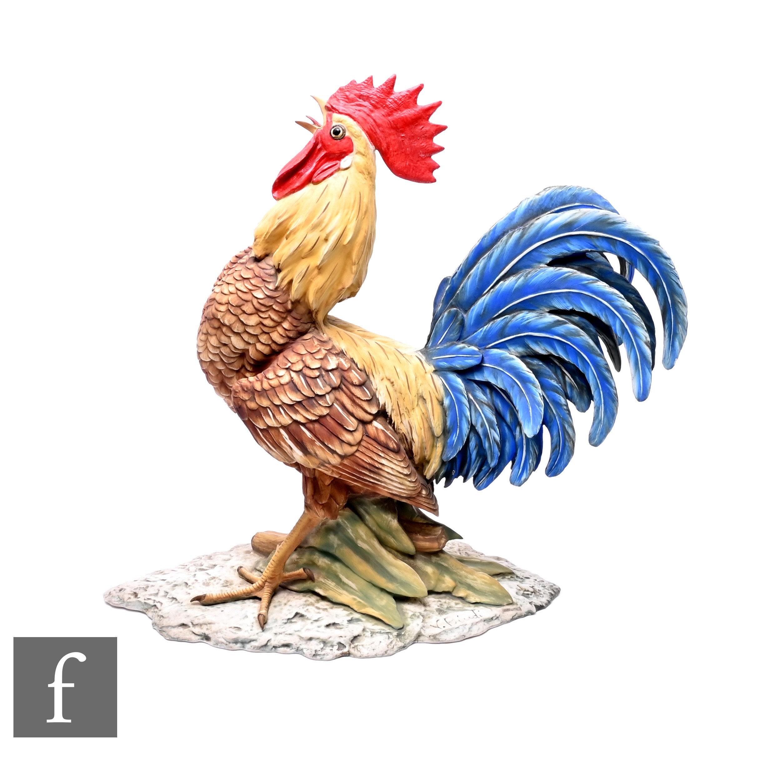 A Capodimonte bisque figure of a crowing cockerel, modelled standing with leafing branch on naturalistic rockwork base, signed V Bindi, height 44cm.
