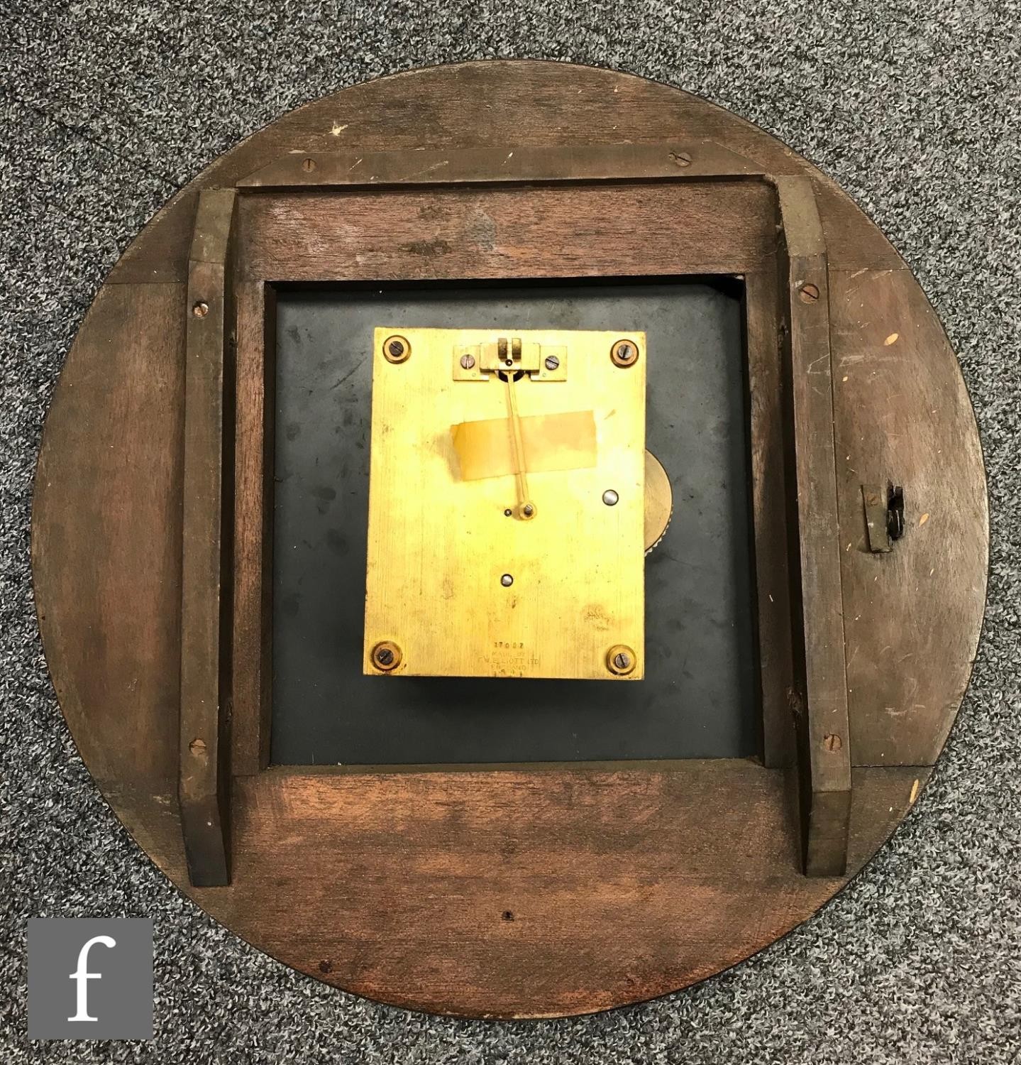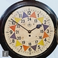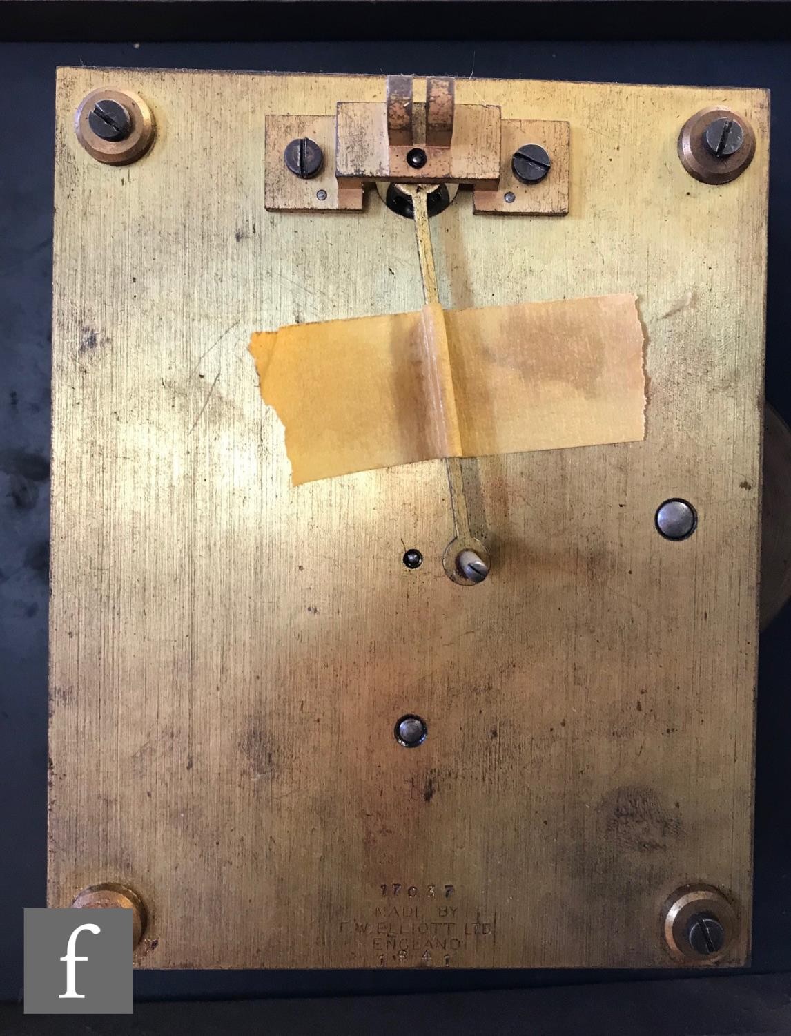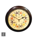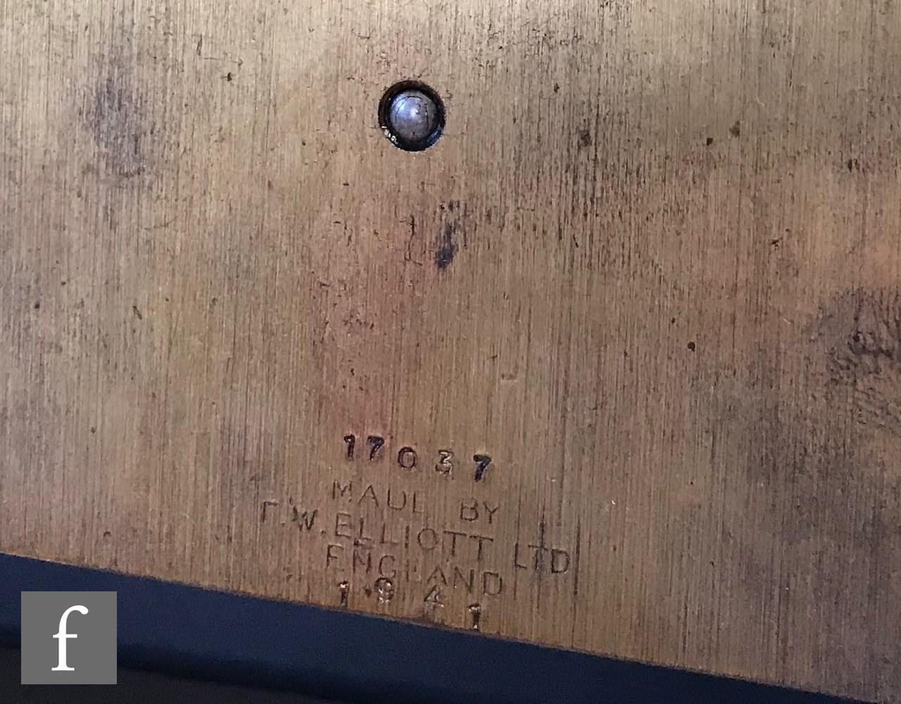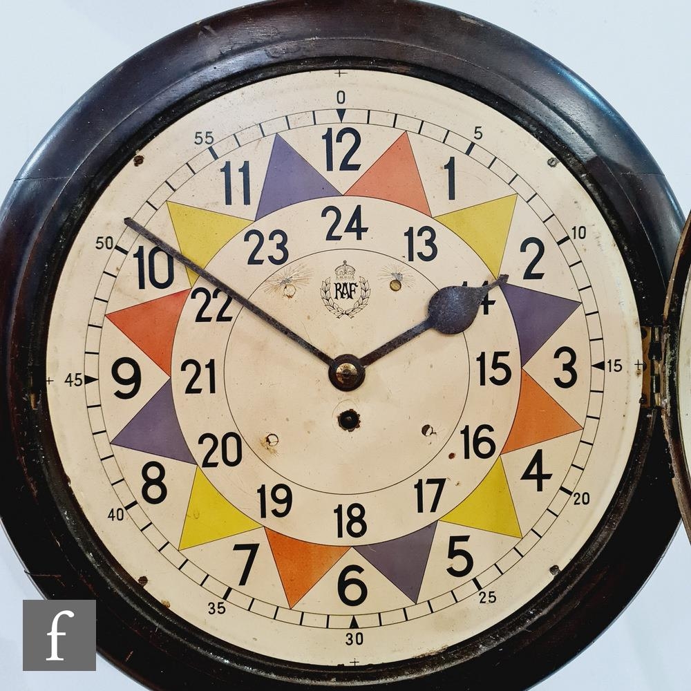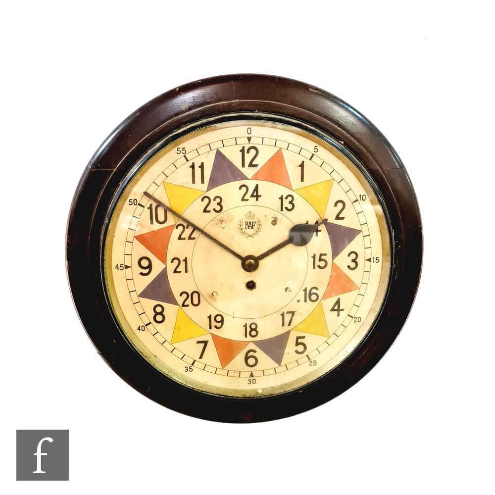 An RAF operations room sector wall clock, the single-fusee movement stamped to the backplate 17037, Made by F.W Elliot, 1941, the 14in dial with black Roman numerals with inner 24-hr chapter ring with alternate red, yellow and blue triangular sector markings, RAF ‘King’s Crown’ warrant officer’s insignia to the centre and shaped steel hands, all within a varnished mahogany case with black stained bezel, chalked to the inside 8/10/51, lacks pendulum.