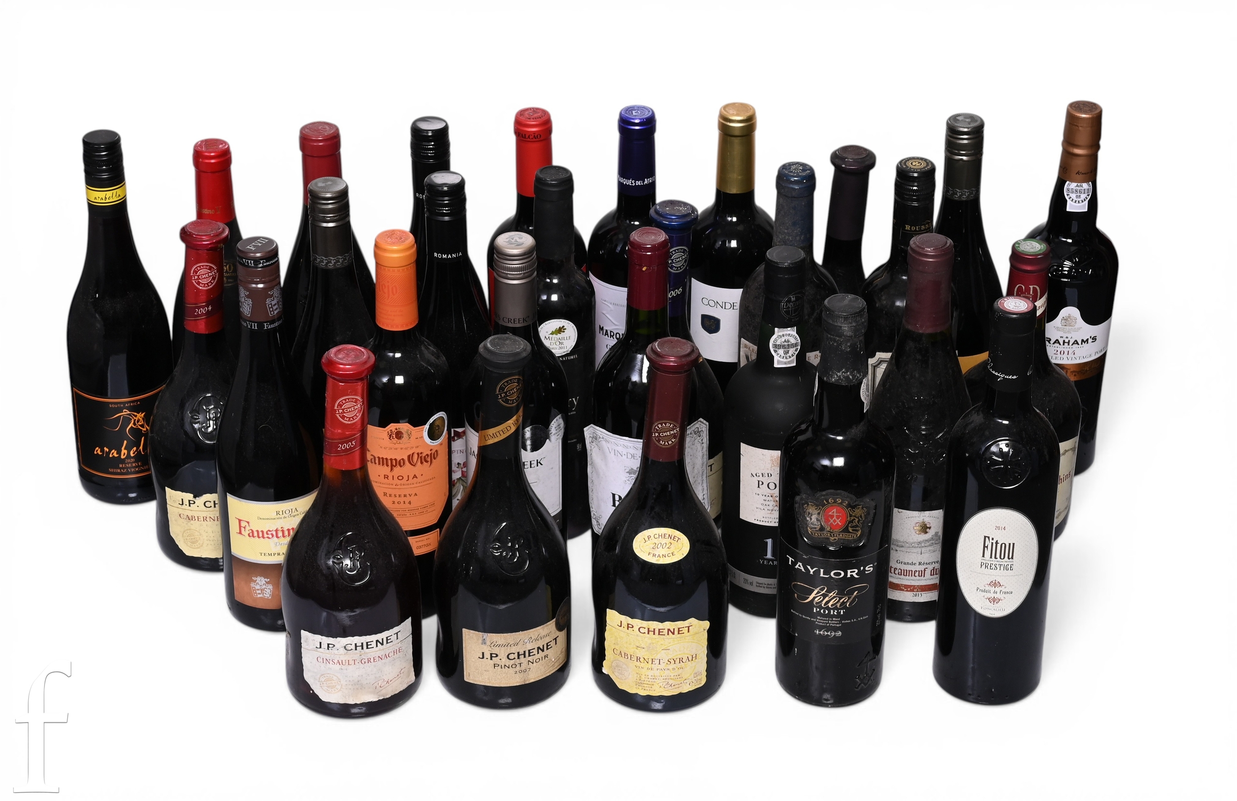 A collection of ports and red wines, to include a bottle of 2015 Graham's 2014 late bottled port with tube, a Taylor's Select port, a 10 year old aged Tawny port and twenty six various French, Spanish and Italian red wines. (29)