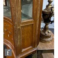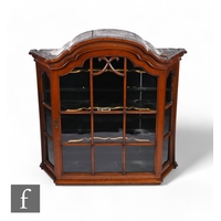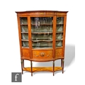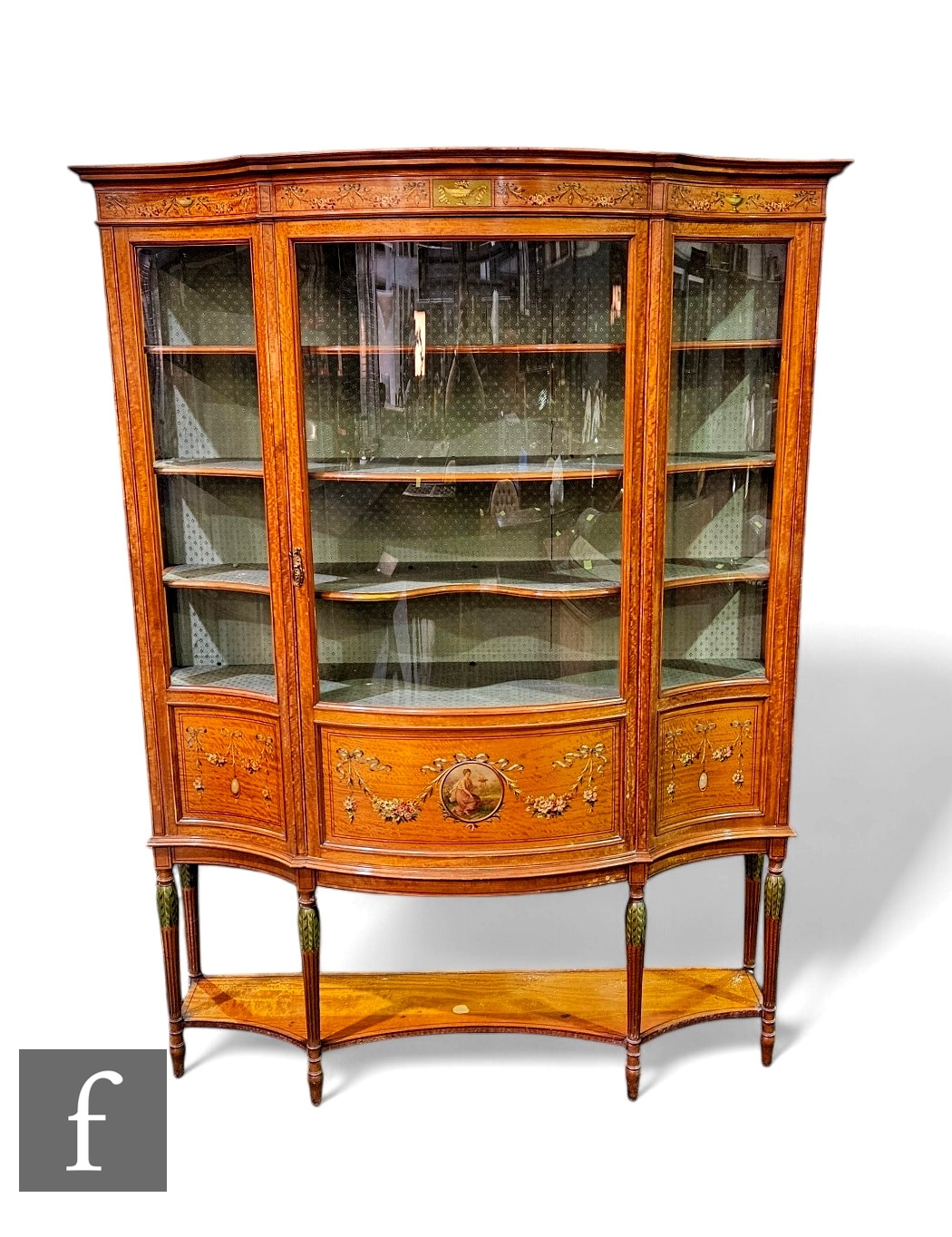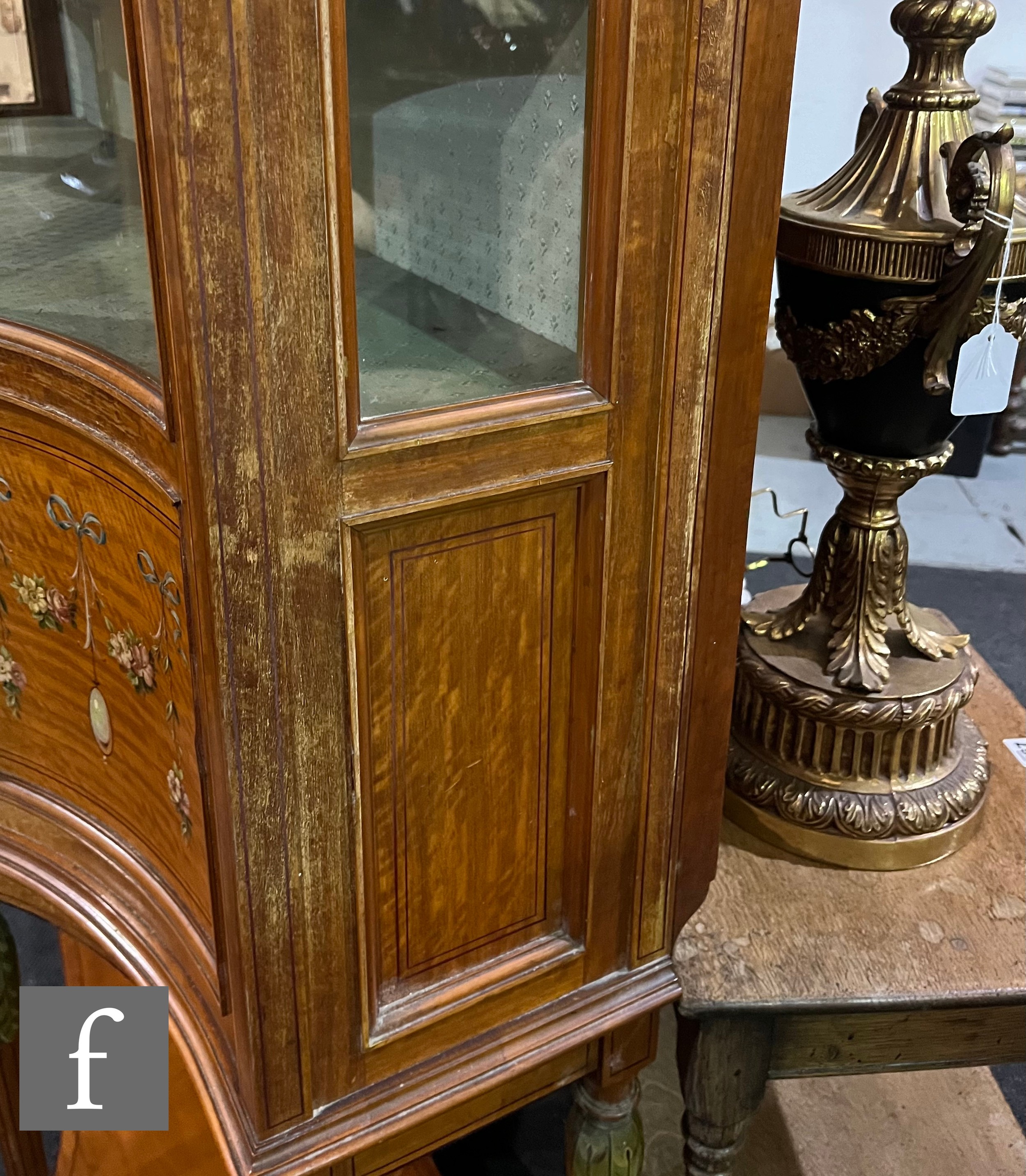 An Edwardian serpentine painted satinwood display cabinet, enclosed by a glazed door, below moulded edge fluted cornice detailed with sprays of flowers and centred by a classical urn flanked by concave sides and panels below painted with bows and garlands of flowers, on fluted legs and peg feet united by an undertier, height 192cm x depth 56cm x width 144cm.