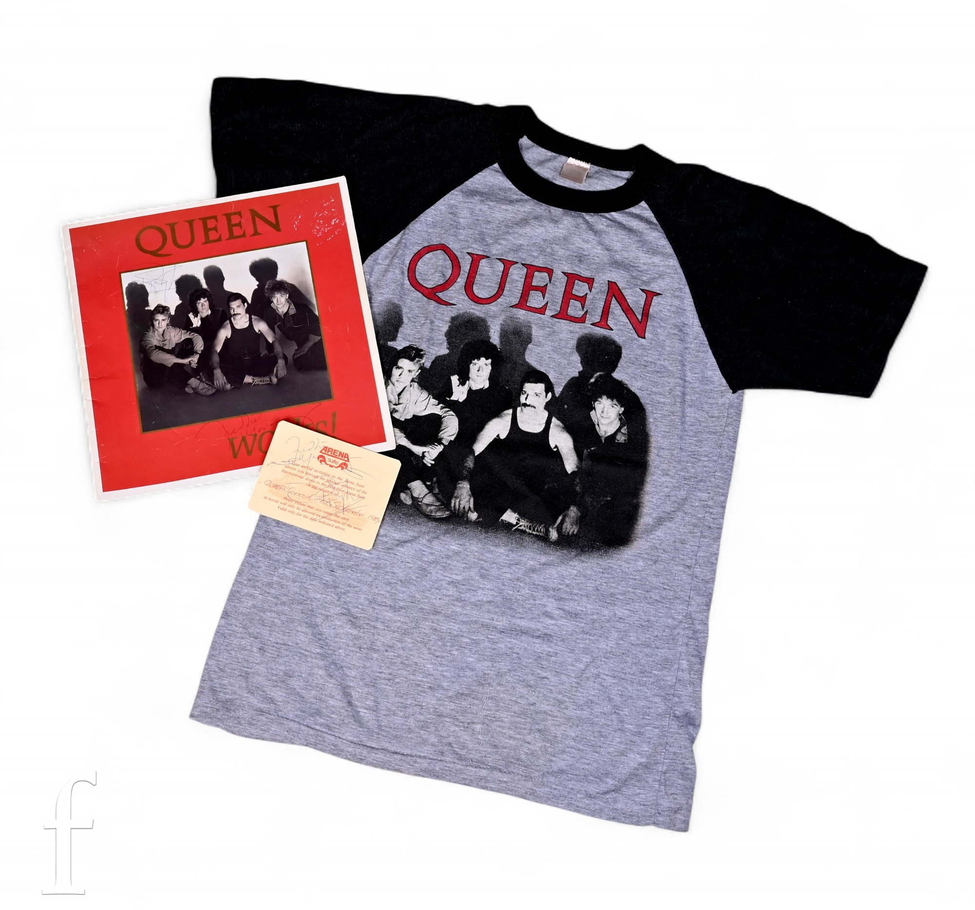 Queen - A collection of items to include a signed Works! tour programme signed by Freddie Mercury and Roger Taylor to the front and Brian May to the inside, indistinctly signed to the reverse, together with an Arena Suite special invitation card, signed by Freddie Mercury and Roger Taylor, together with Tour T Shirt.