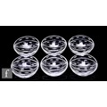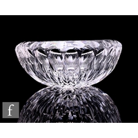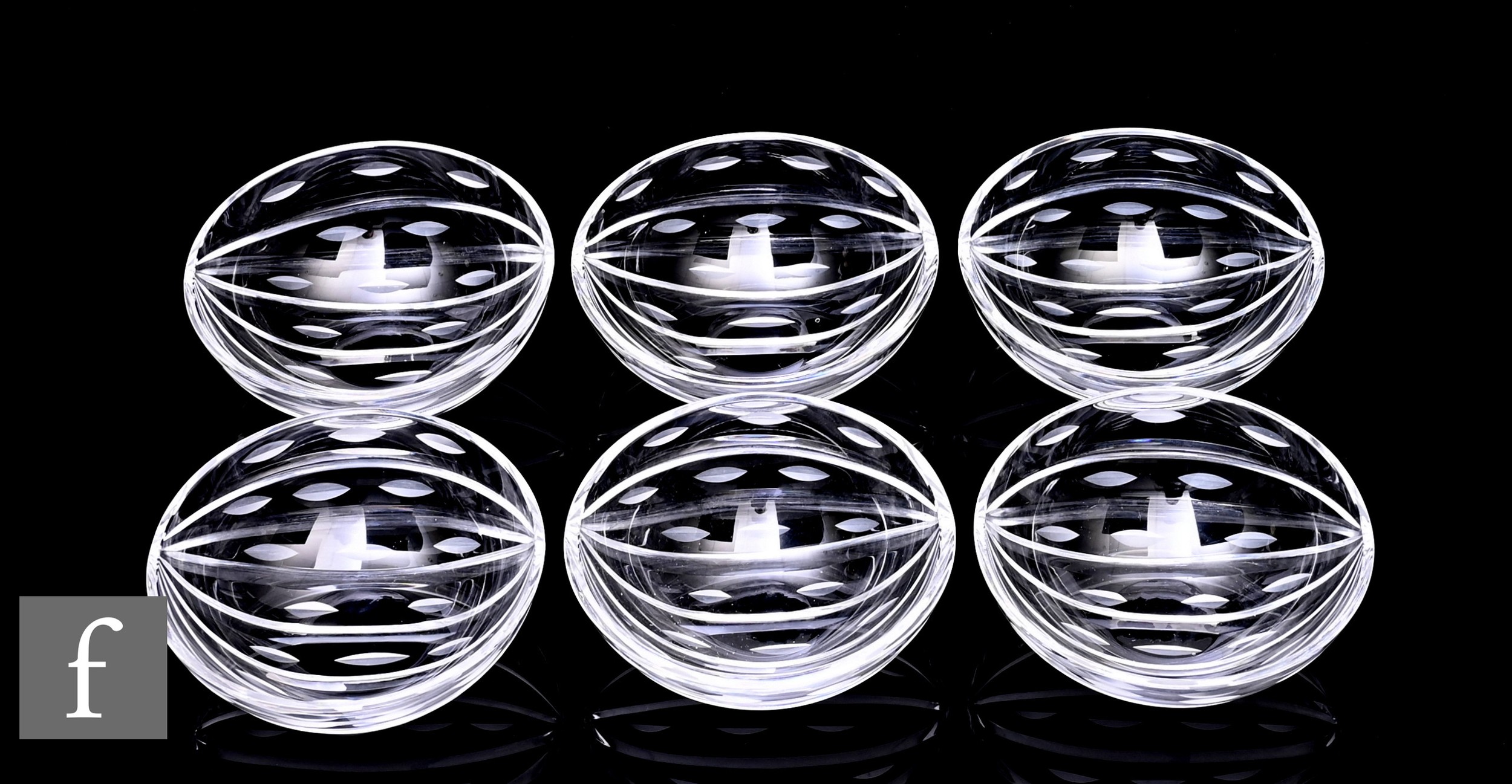 Geoffrey Baxter - Whitefriars - A set of six post war clear crystal glass desert bowls of hemispherical form cut as a stylised water melon, with mitre cuts and stylised seeds, width 12cm. (6)