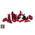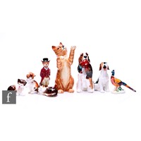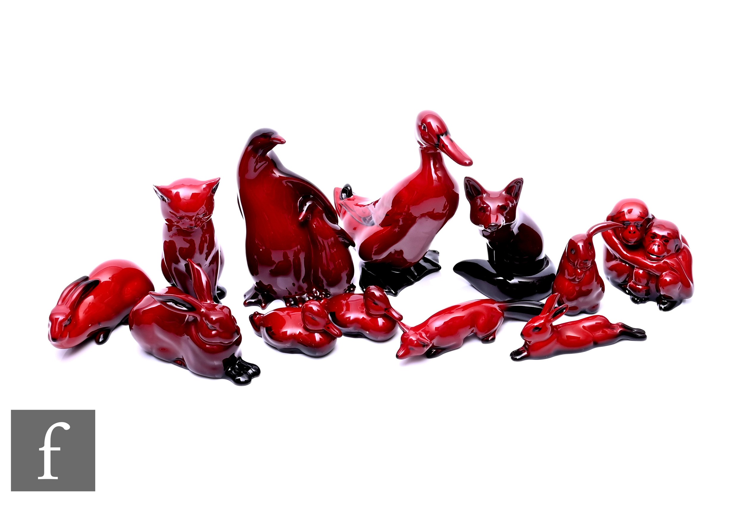 A collection of Doulton Flambe animal figures, including Eider Duck height 16cm, Fox, Double Penguin figure group, Fox, Rabbits, and Double Monkey group. (12)