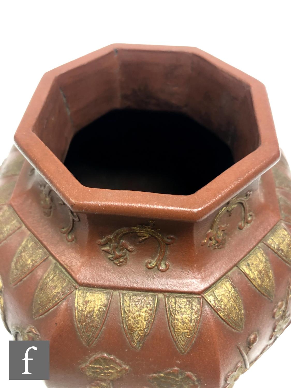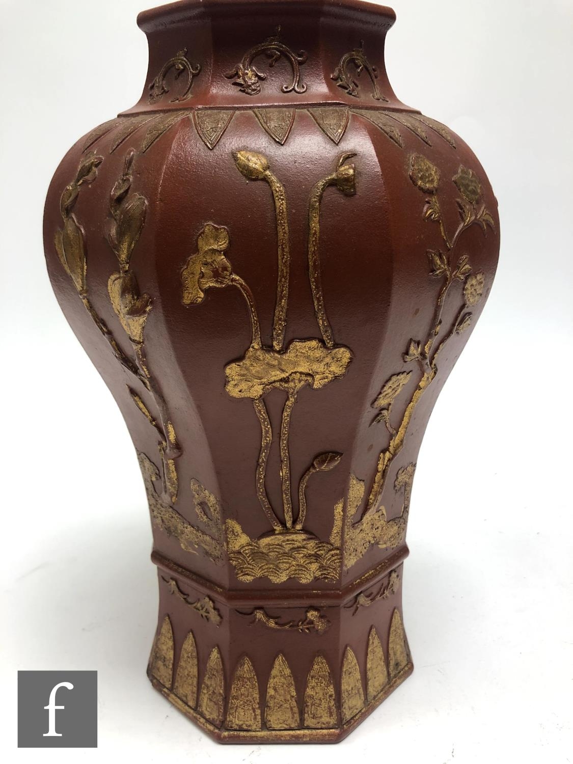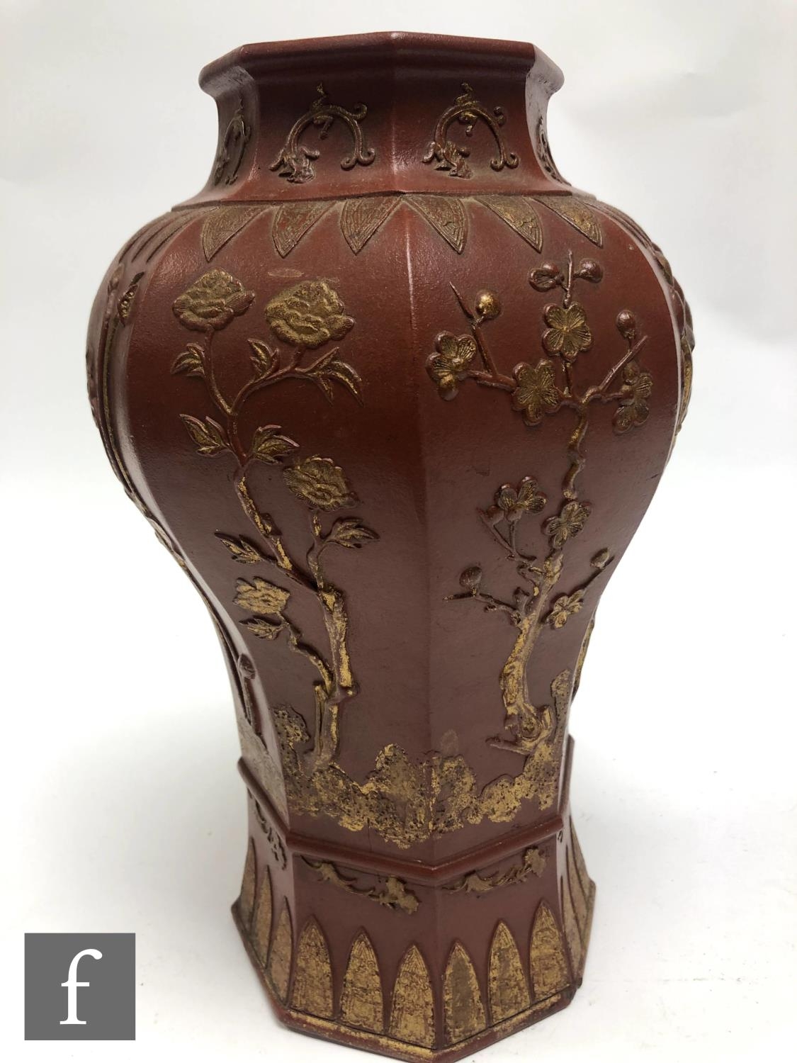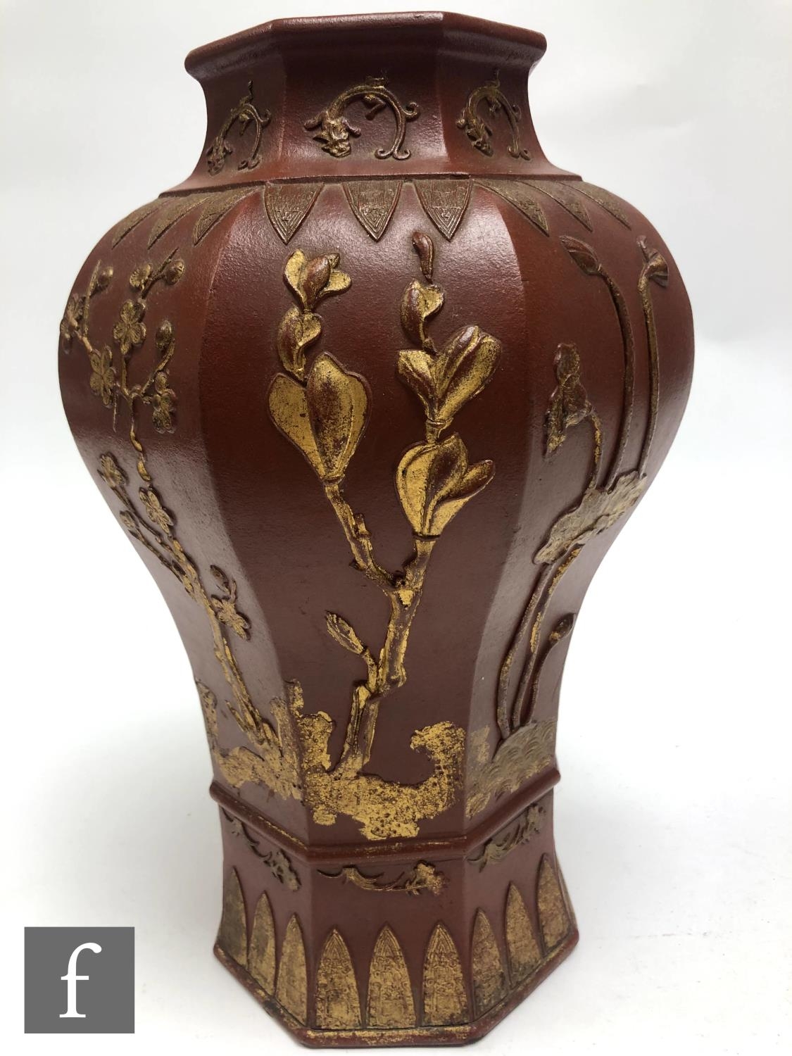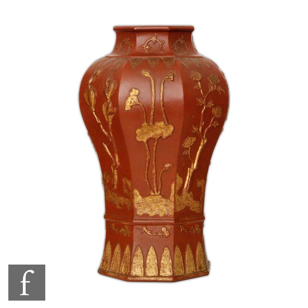 A Chinese late Qing Dynasty (1644-1912) Yixing vase, the octagonal meiping vase relief moulded to the exterior with flowering lotus and blossom branches before stiff lappet borders, heightened with gilt throughout, unmarked, height 28cm.