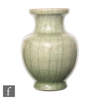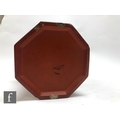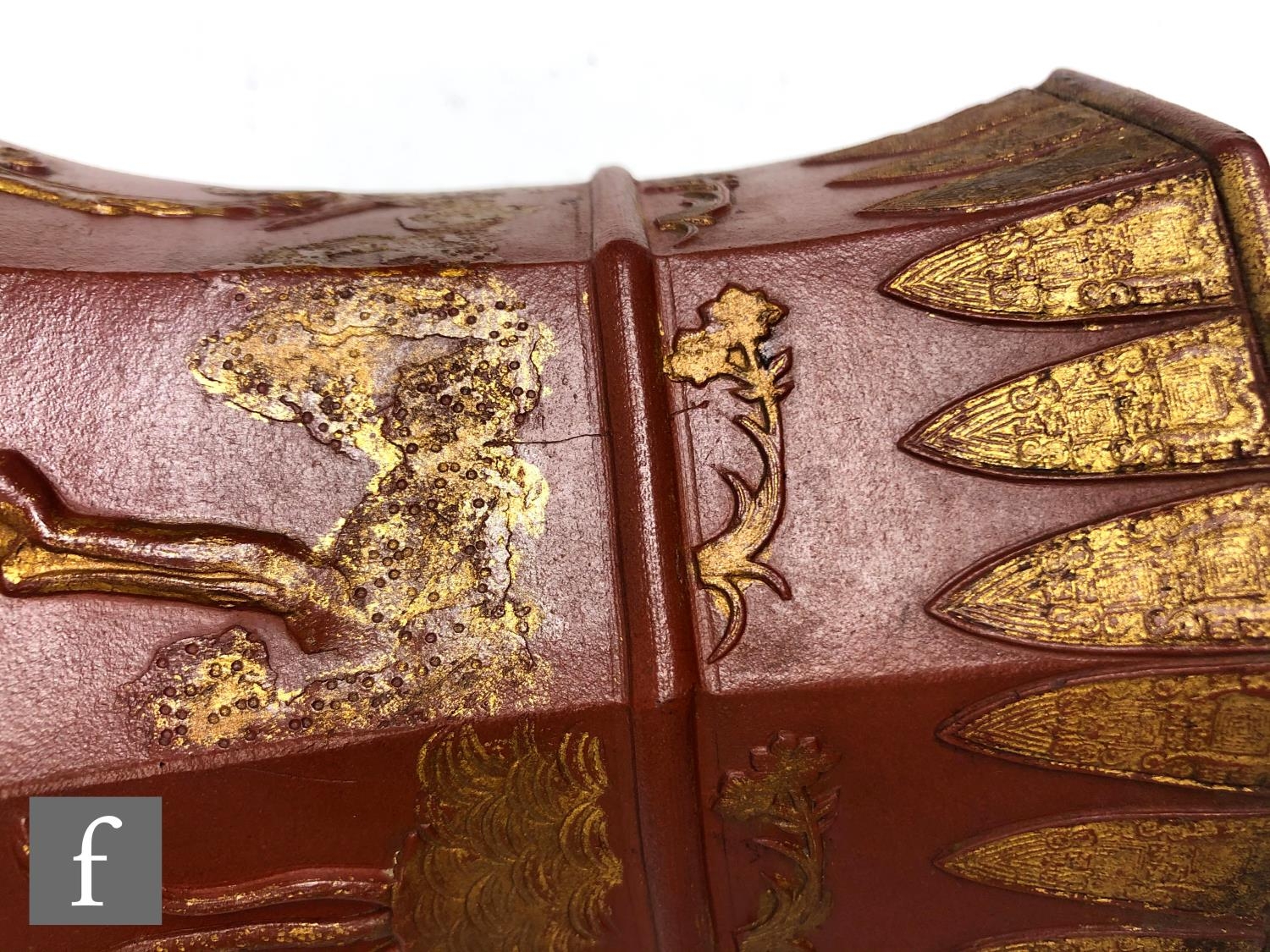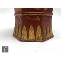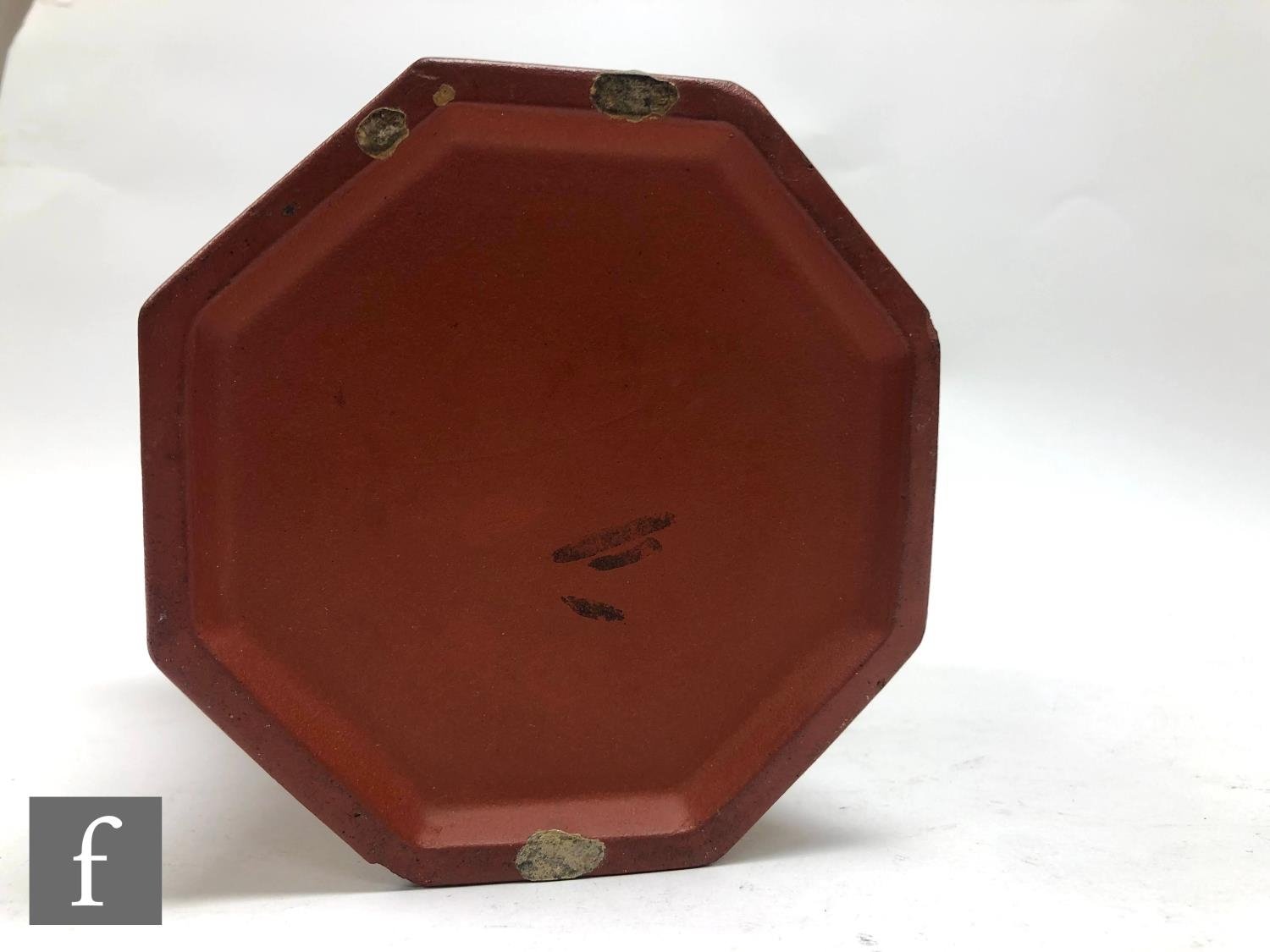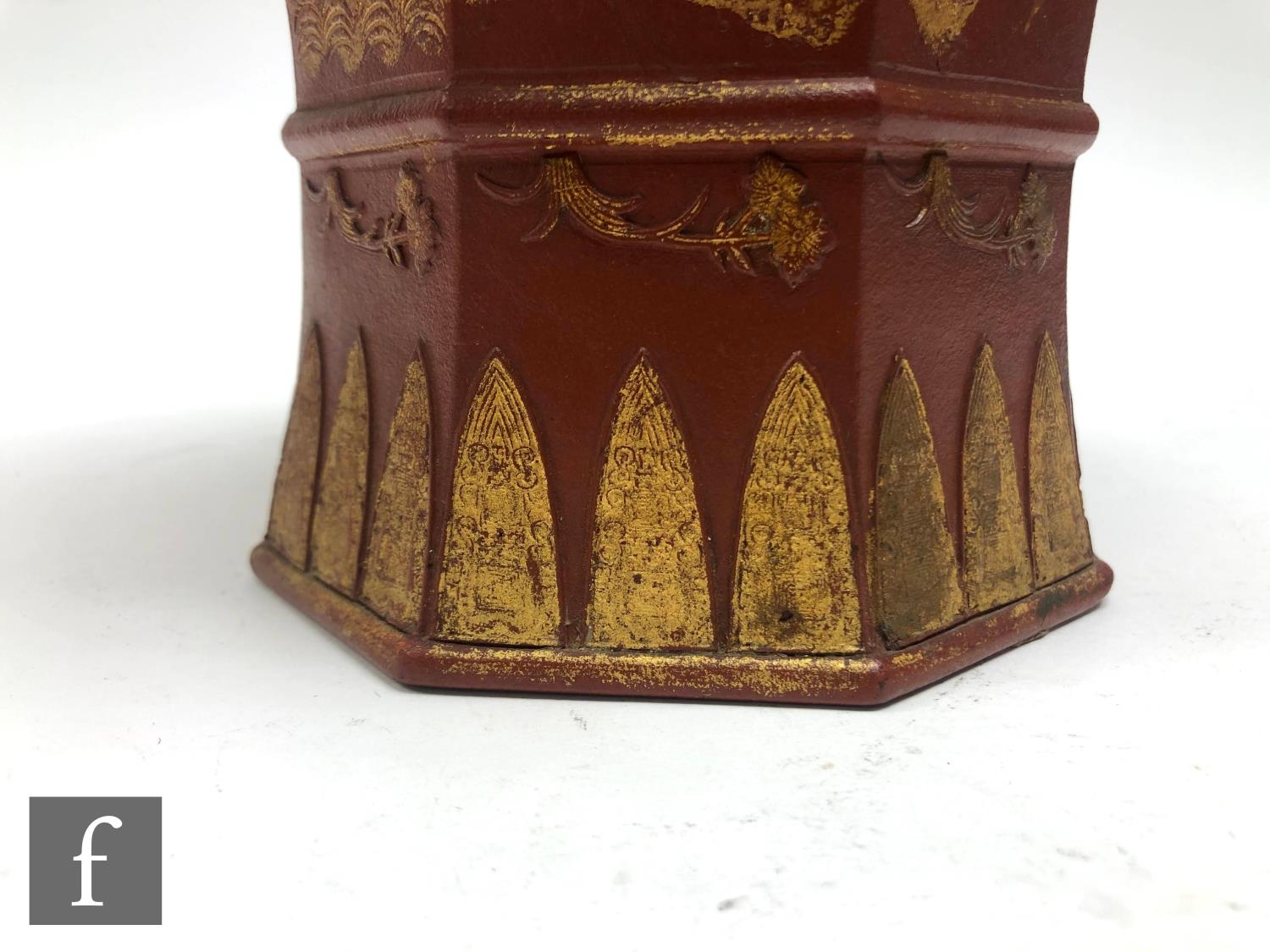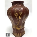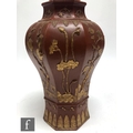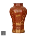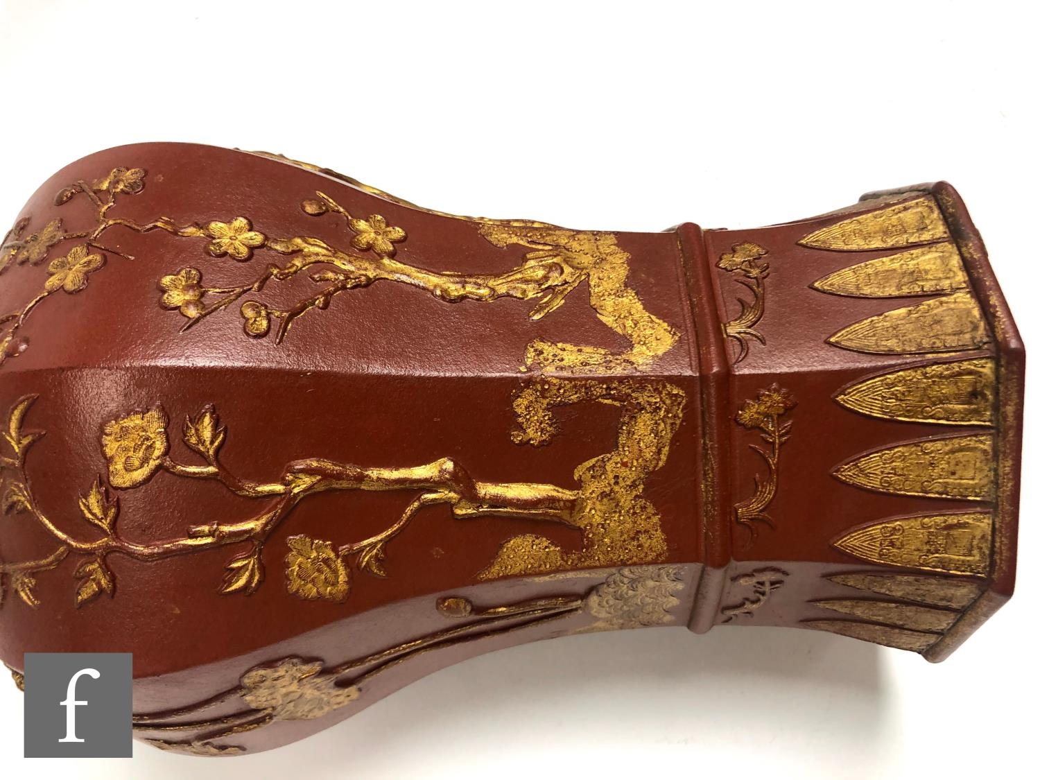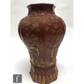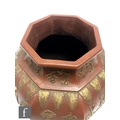 A Chinese late Qing Dynasty (1644-1912) Yixing vase, the octagonal meiping vase relief moulded to the exterior with flowering lotus and blossom branches before stiff lappet borders, heightened with gilt throughout, unmarked, height 28cm.