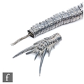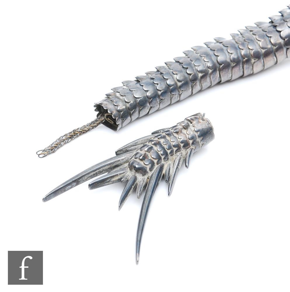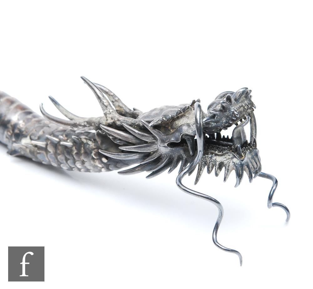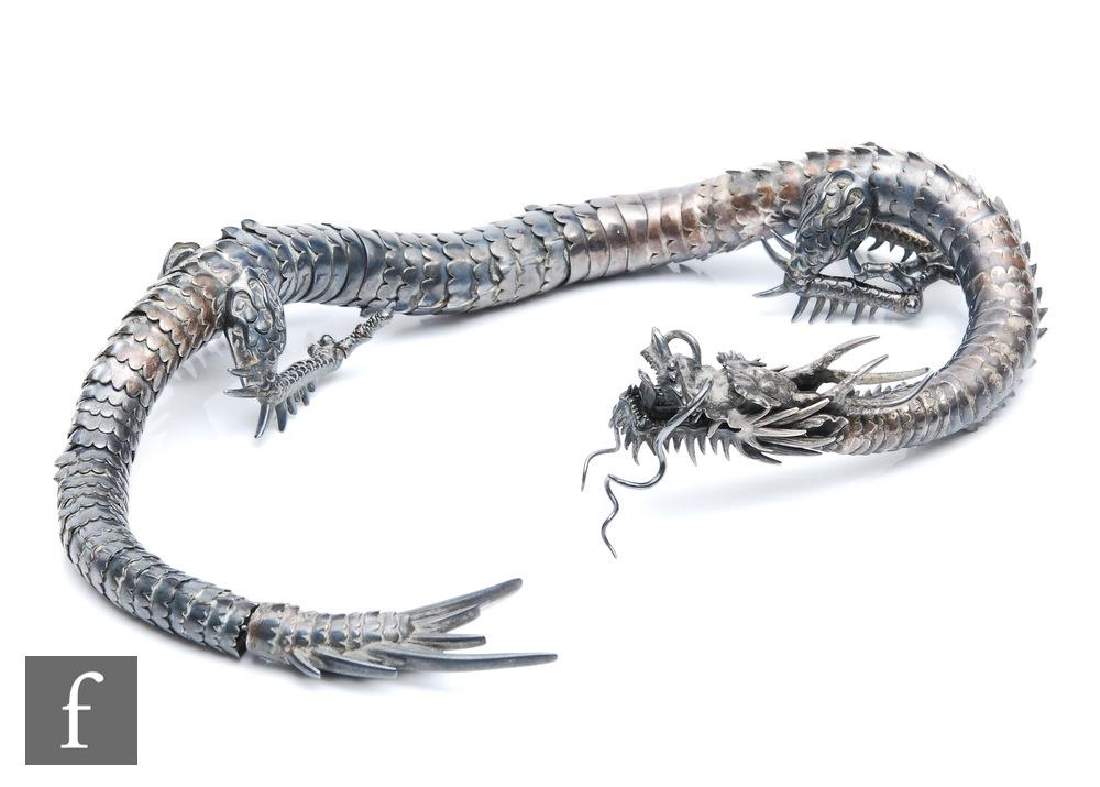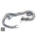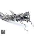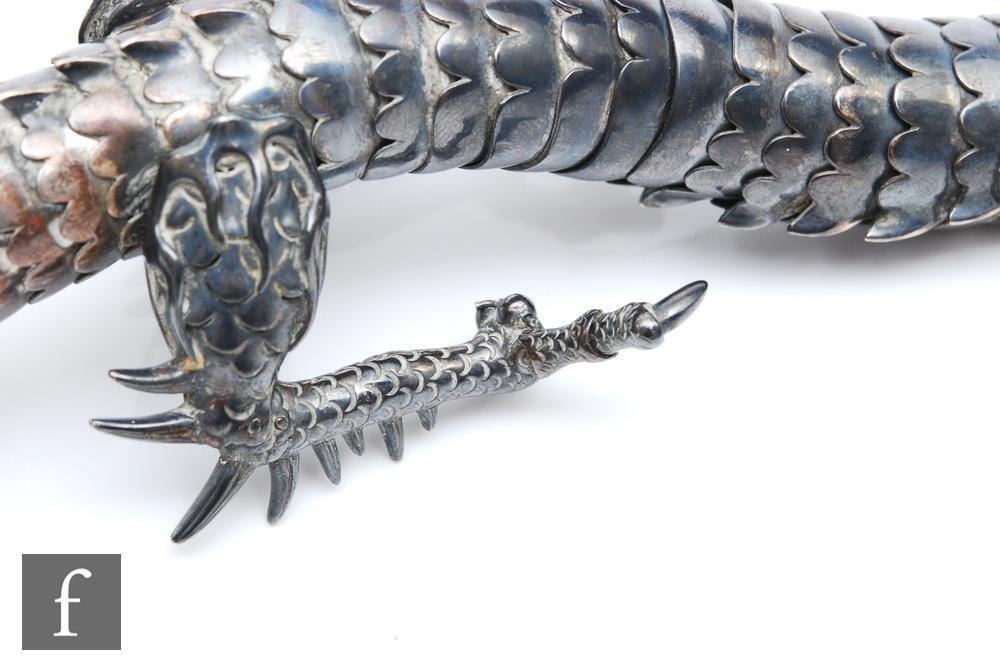 An early 20th Century white metal study of an articulated Japanese dragon with two claws to each foot, length approximately 56cm, unmarked, damaged.