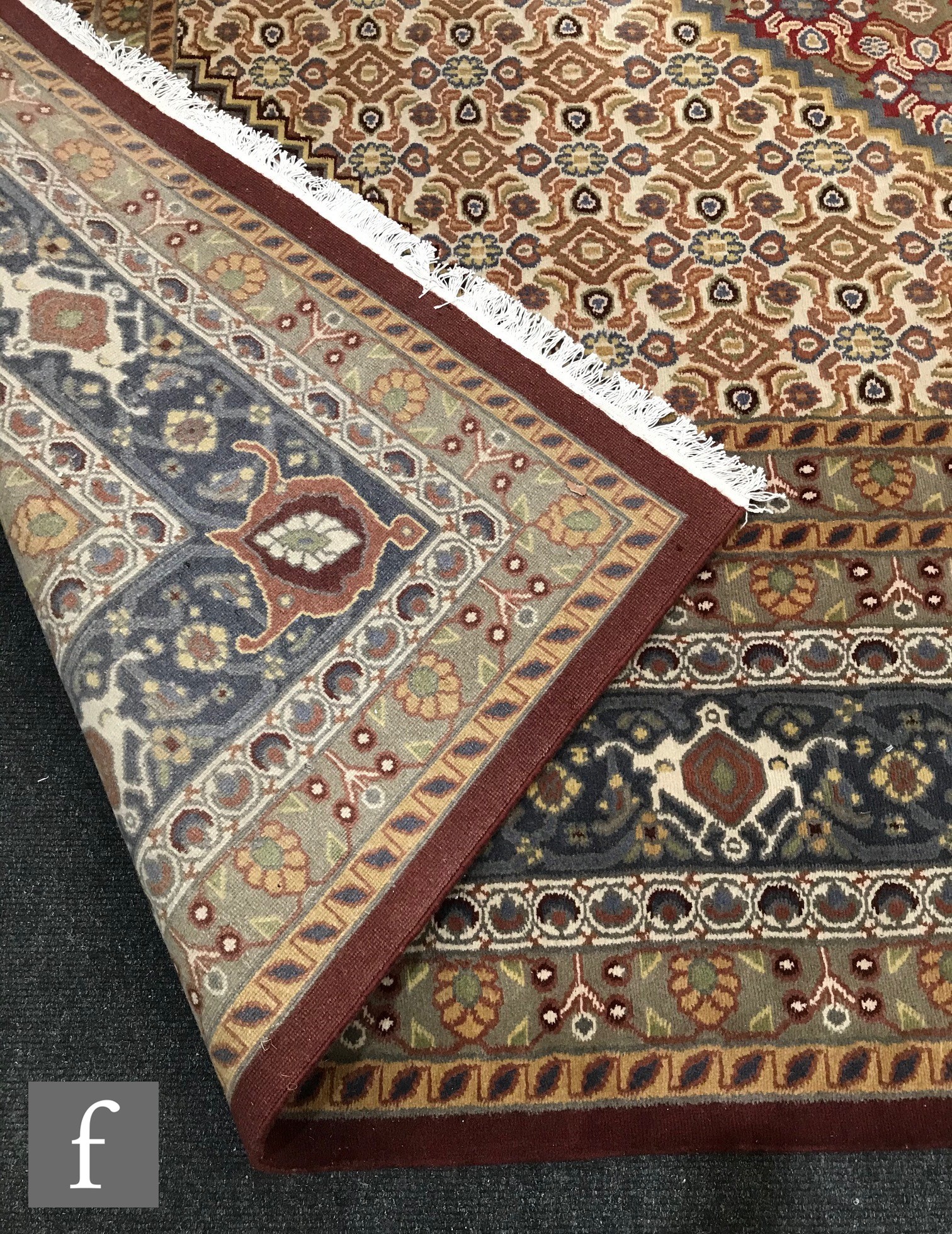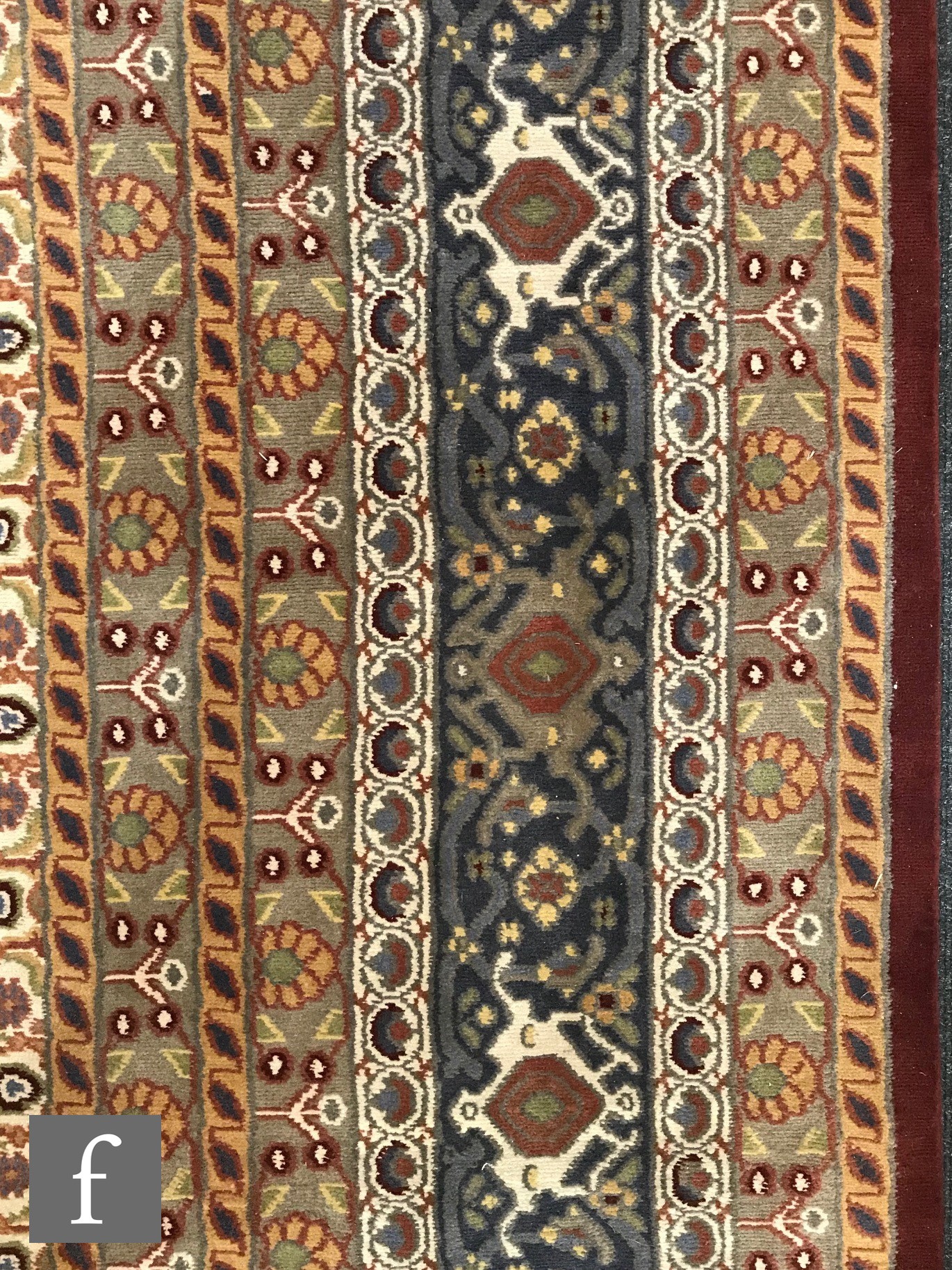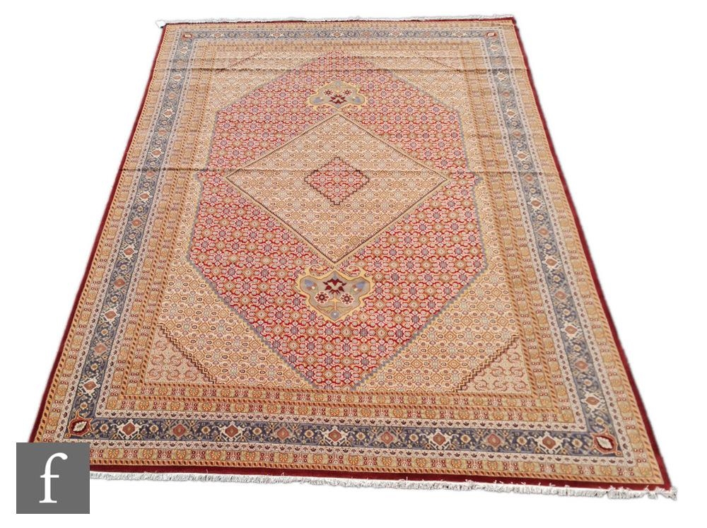An very large Bidjar carpet, the hand knotted wool rug with central diamond design, within a series of Arabesque borders before a red claret ground, 371cm x 536cm.