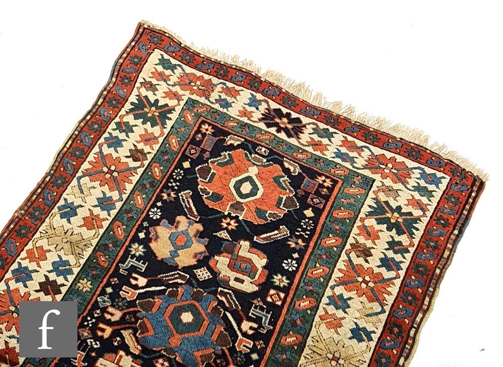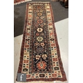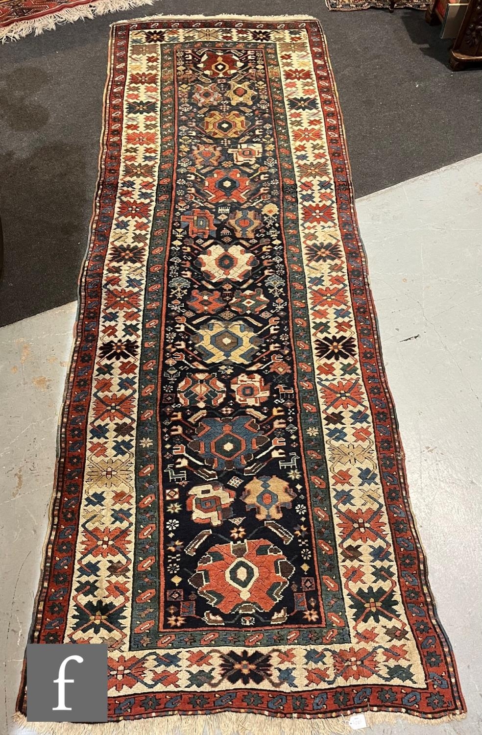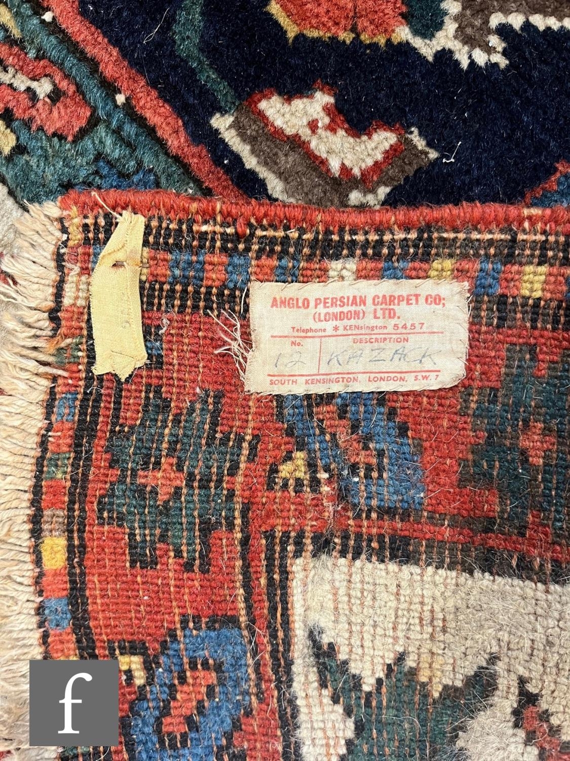 A mid 20th Century Kazak runner, the rug with repeat pattern medallions on a dark blue ground within oatmeal coloured geometric patterned borders, bears Anglo Persian Carpet Company label, 338cm x 118cm, some damage and repairs.