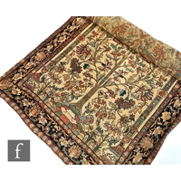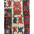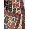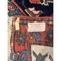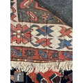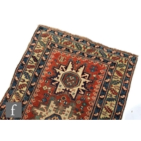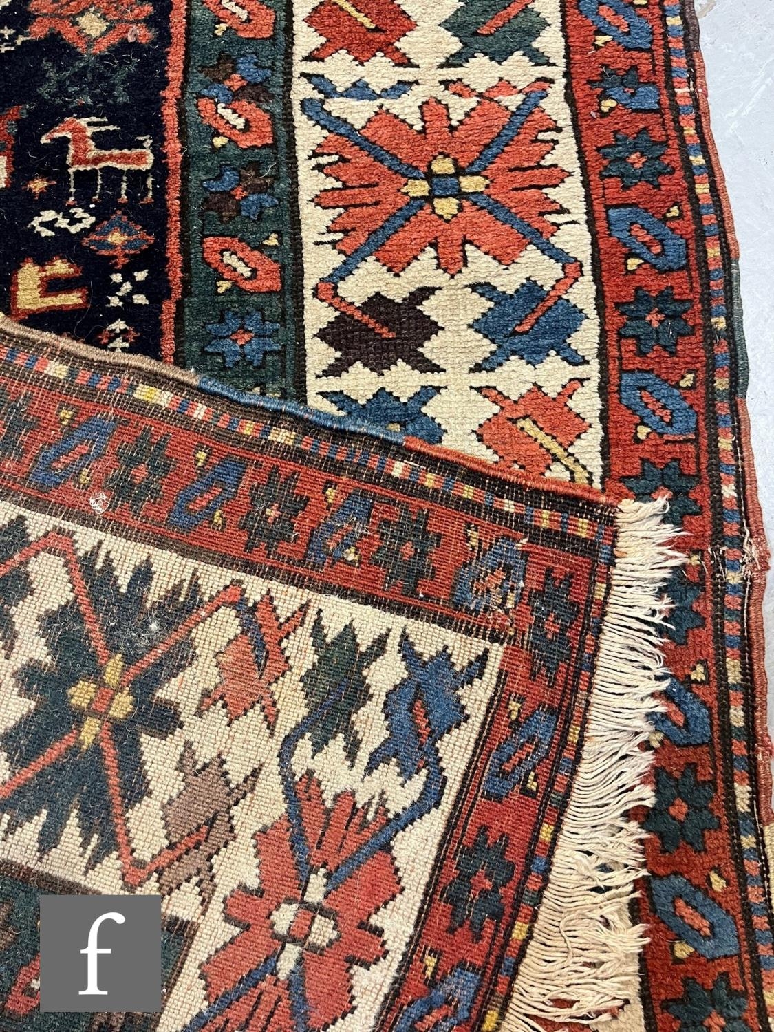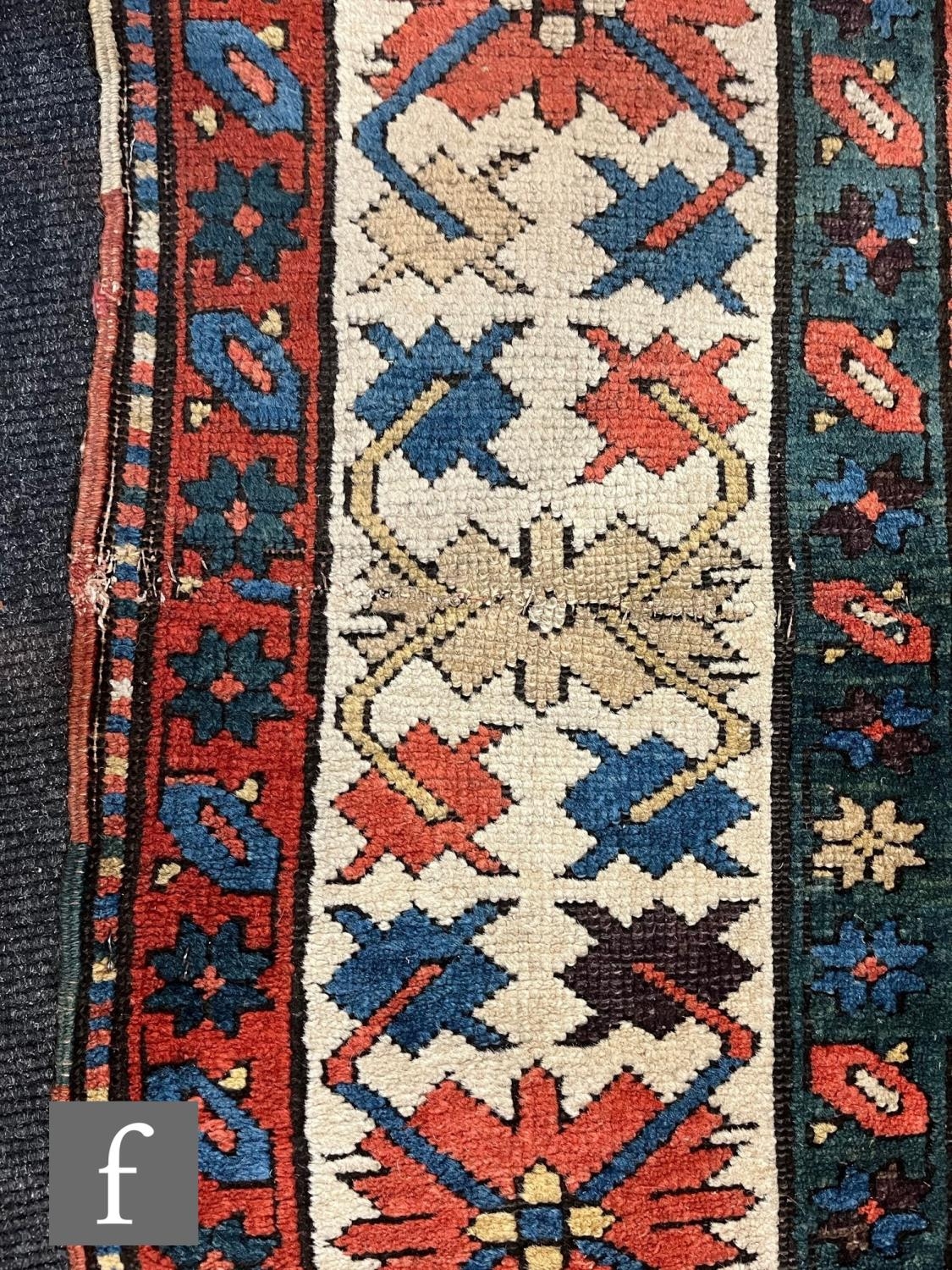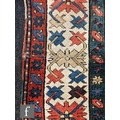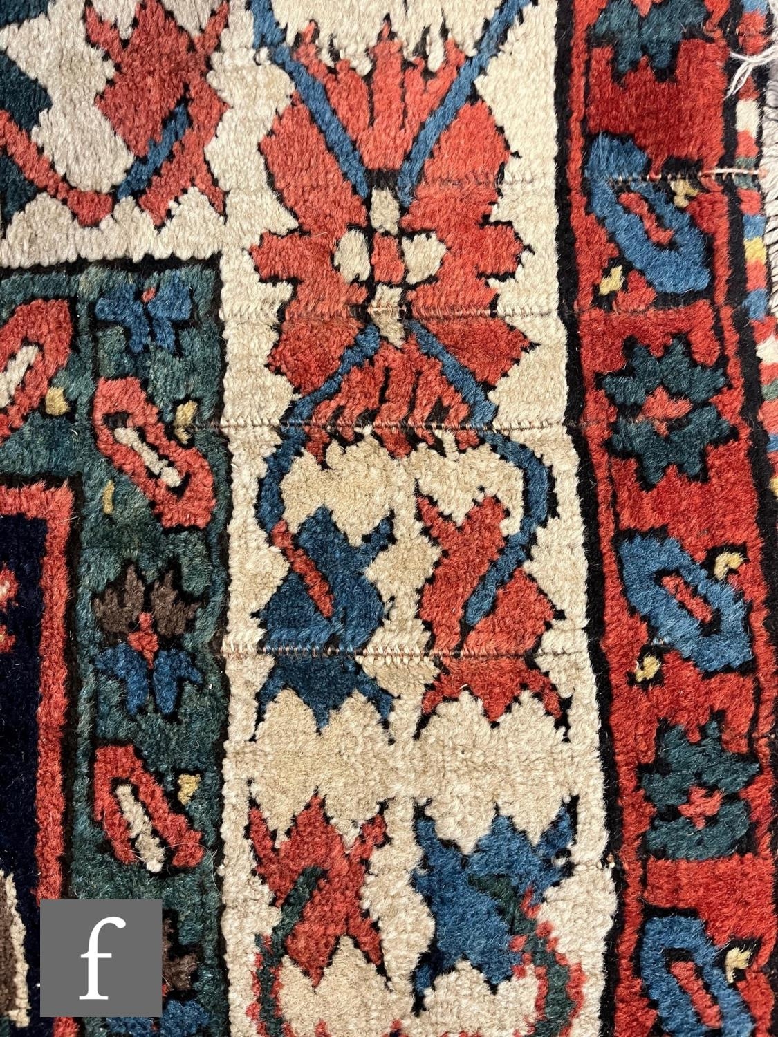 A mid 20th Century Kazak runner, the rug with repeat pattern medallions on a dark blue ground within oatmeal coloured geometric patterned borders, bears Anglo Persian Carpet Company label, 338cm x 118cm, some damage and repairs.