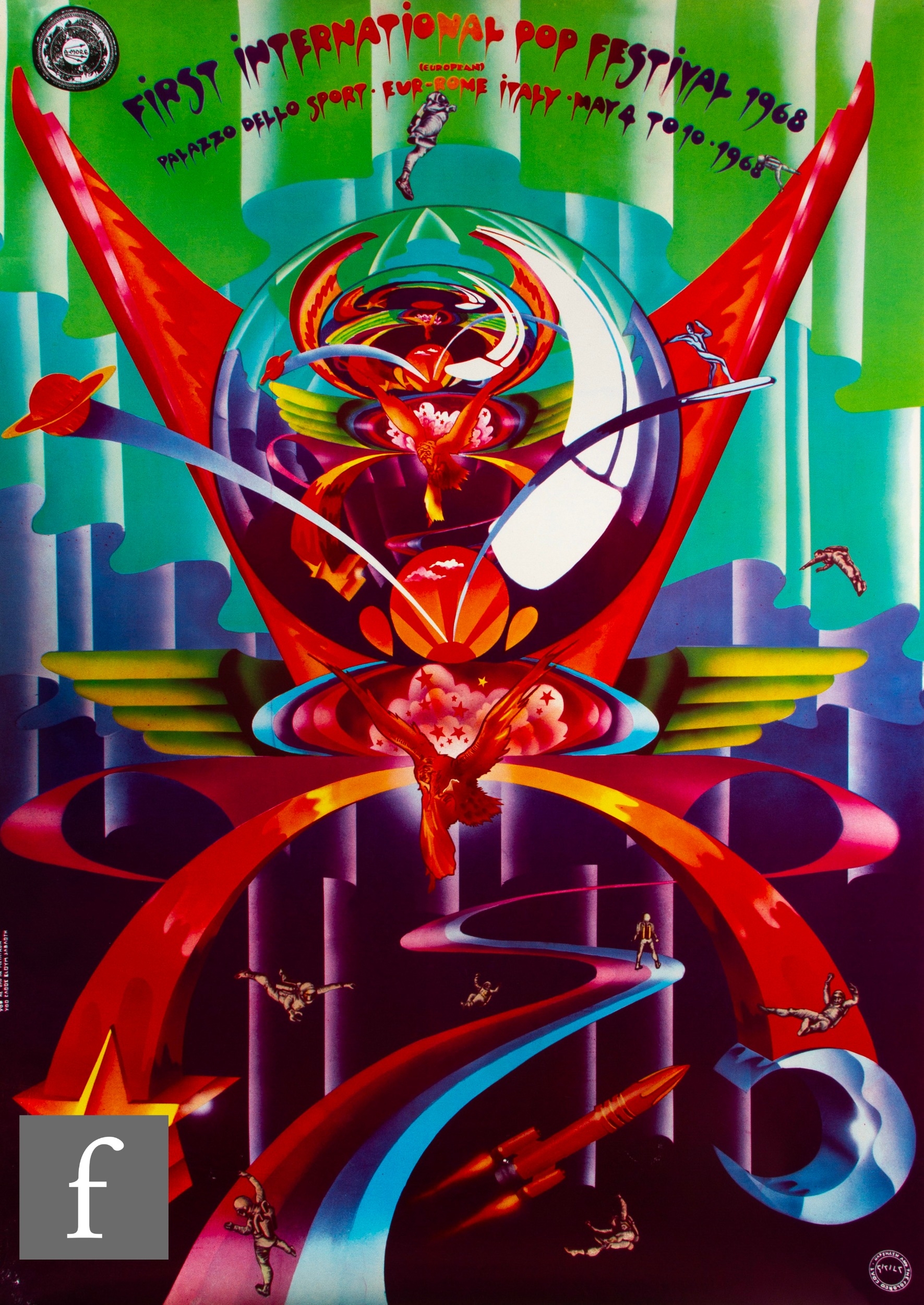 Michael English and Nigel Waymouth - (Hapshash and the Coloured Coat) - An original concert poster for the 'First International Pop Festival', held in Rome in May of 1968, performers included Pink Floyd, Captain Beefheart, Donovan and The Move, unframed, rolled, 73.5cm x 52cm.