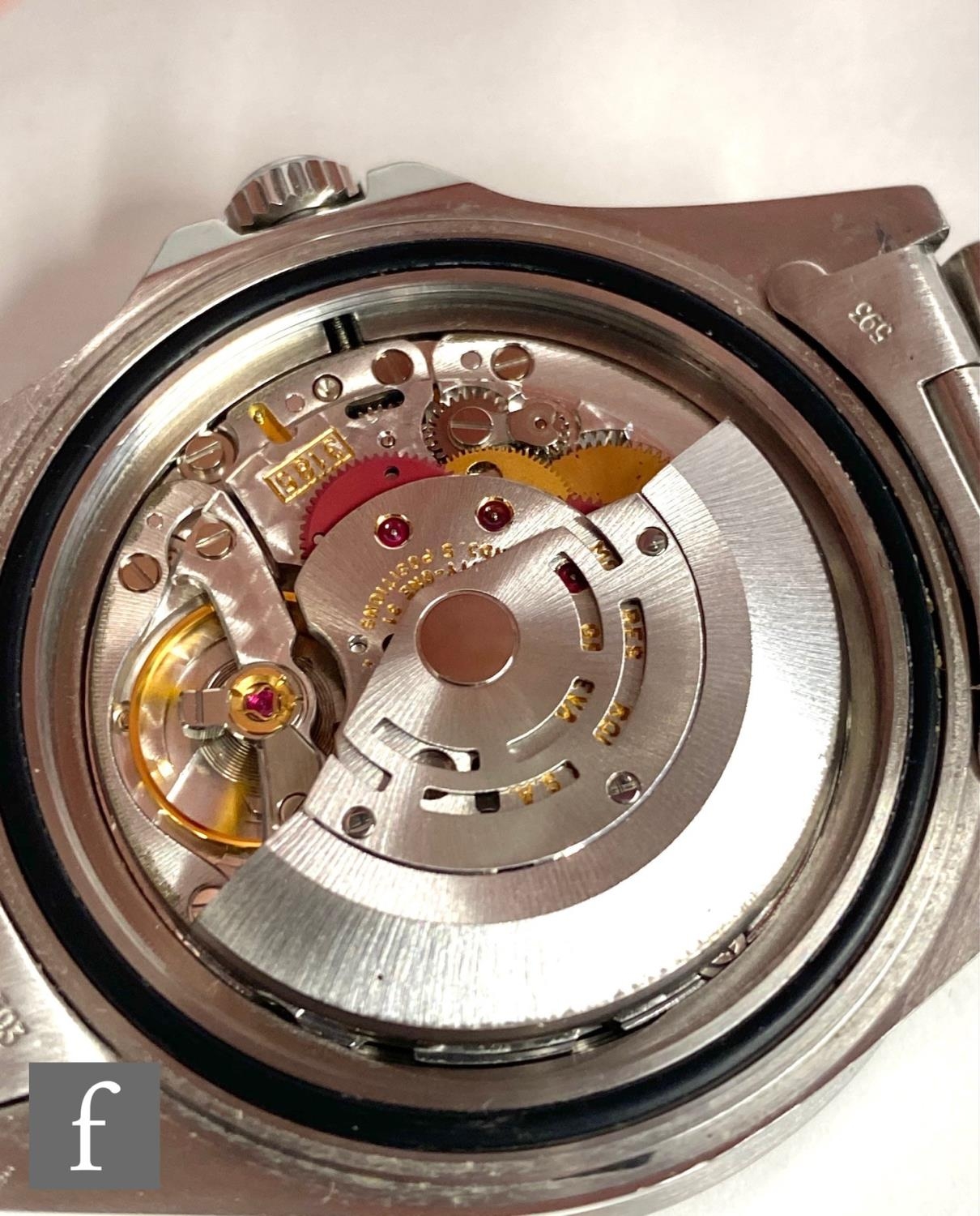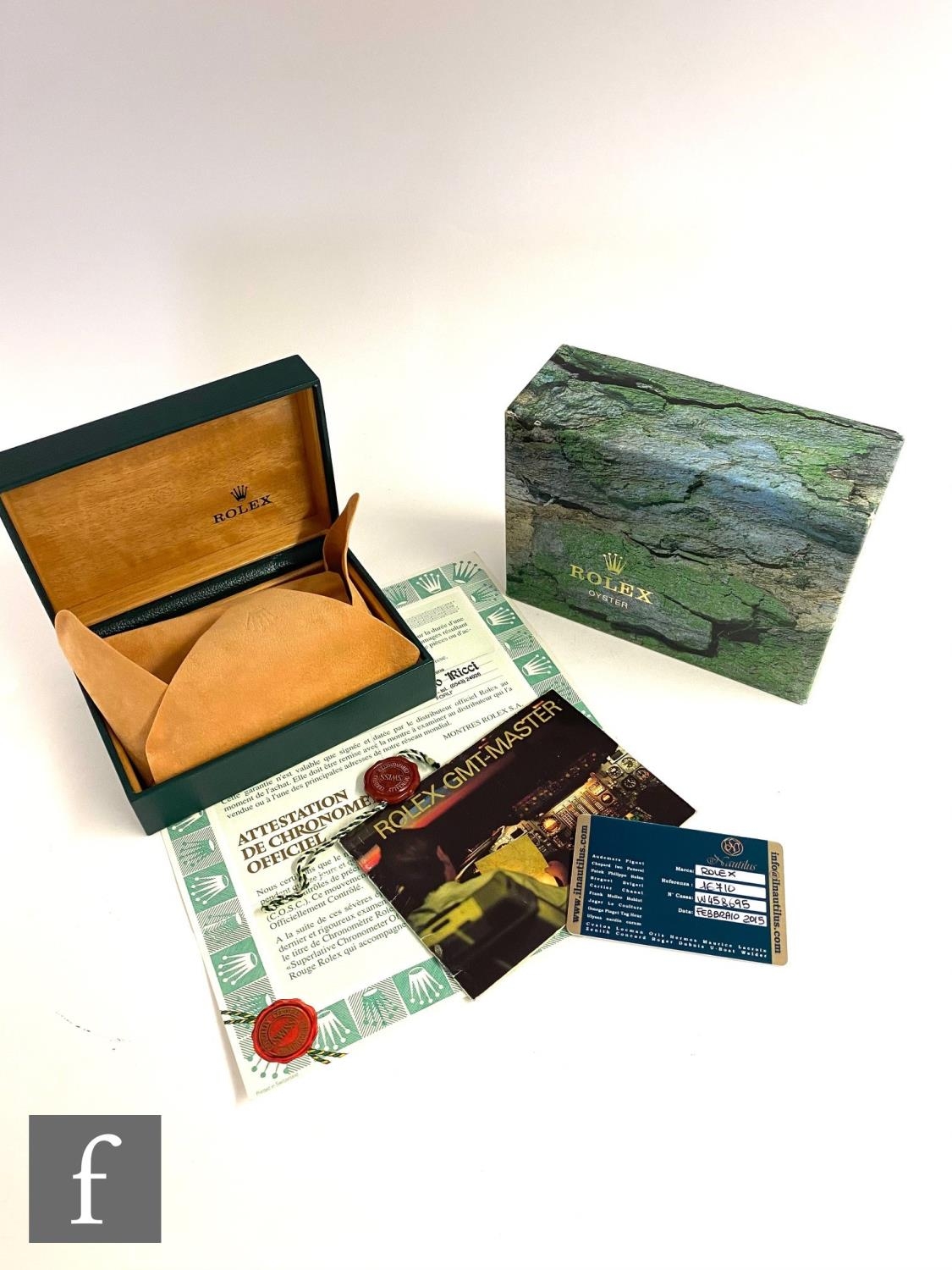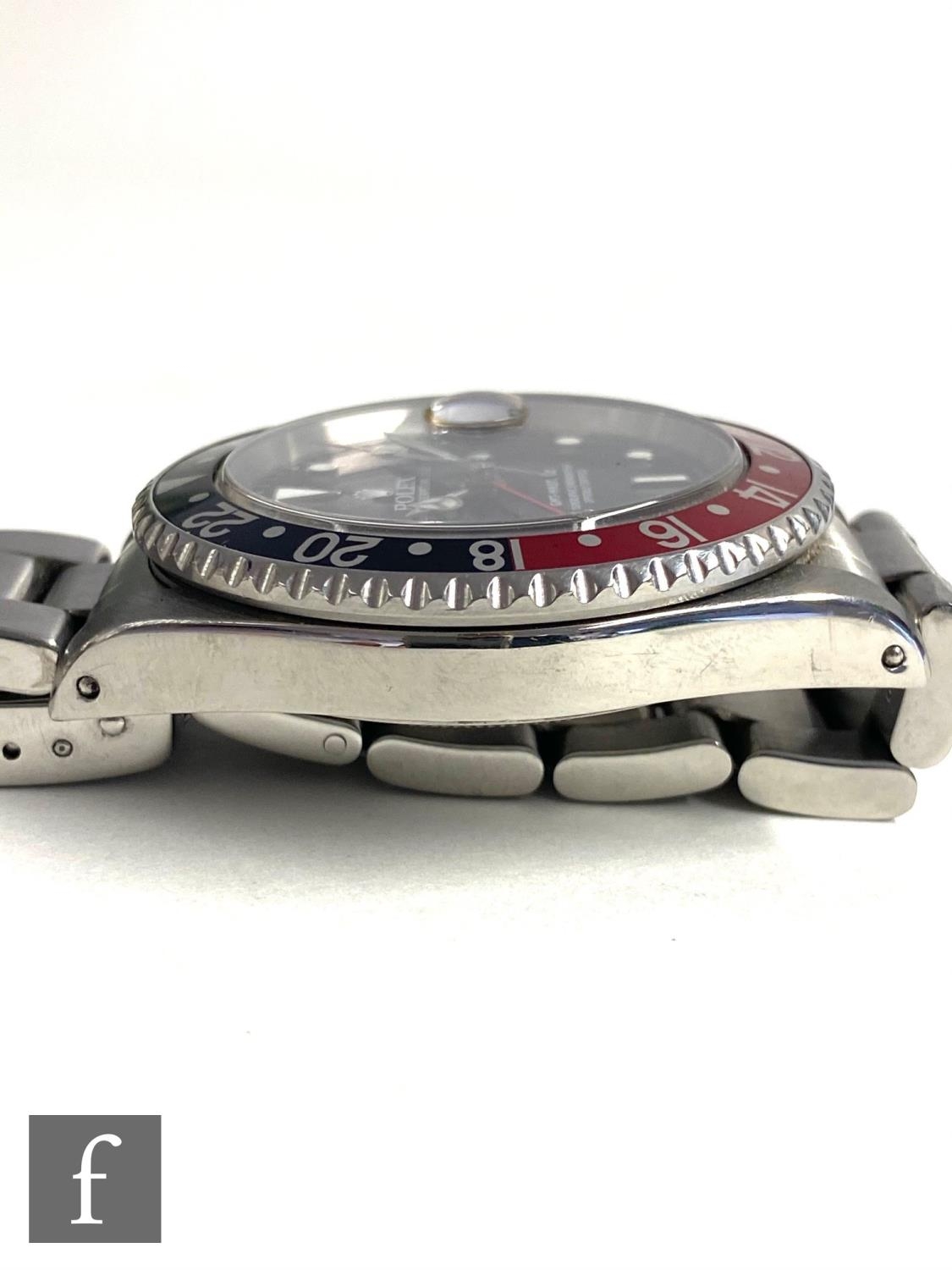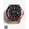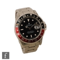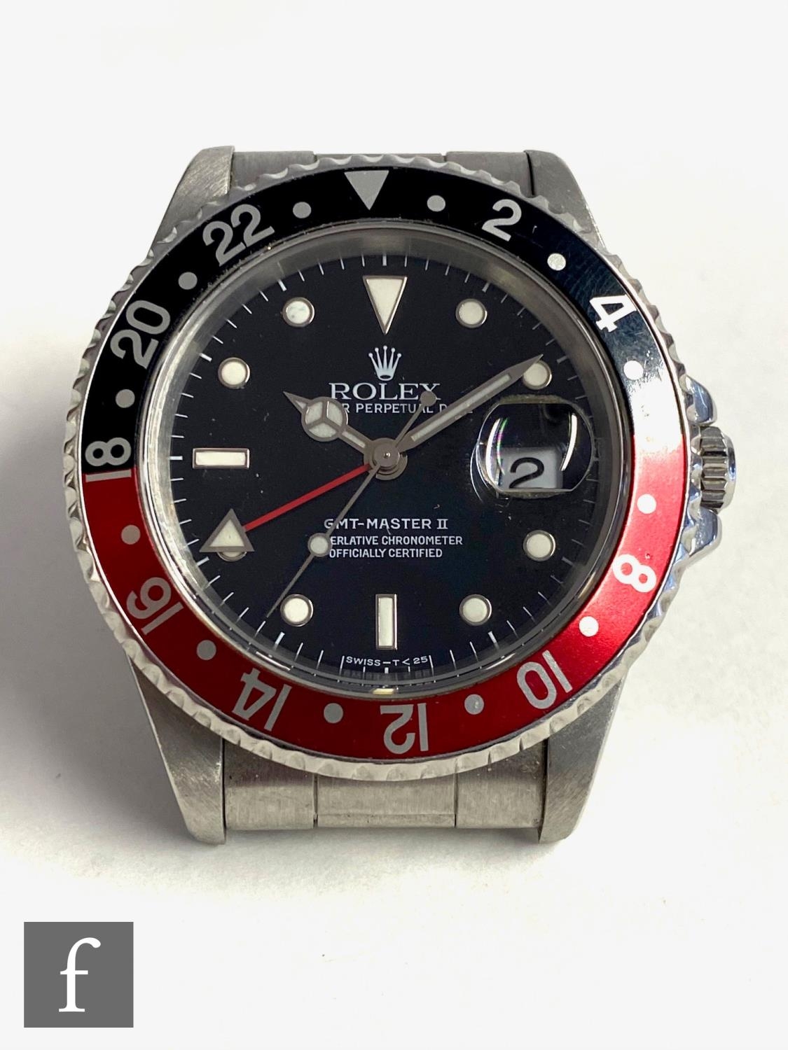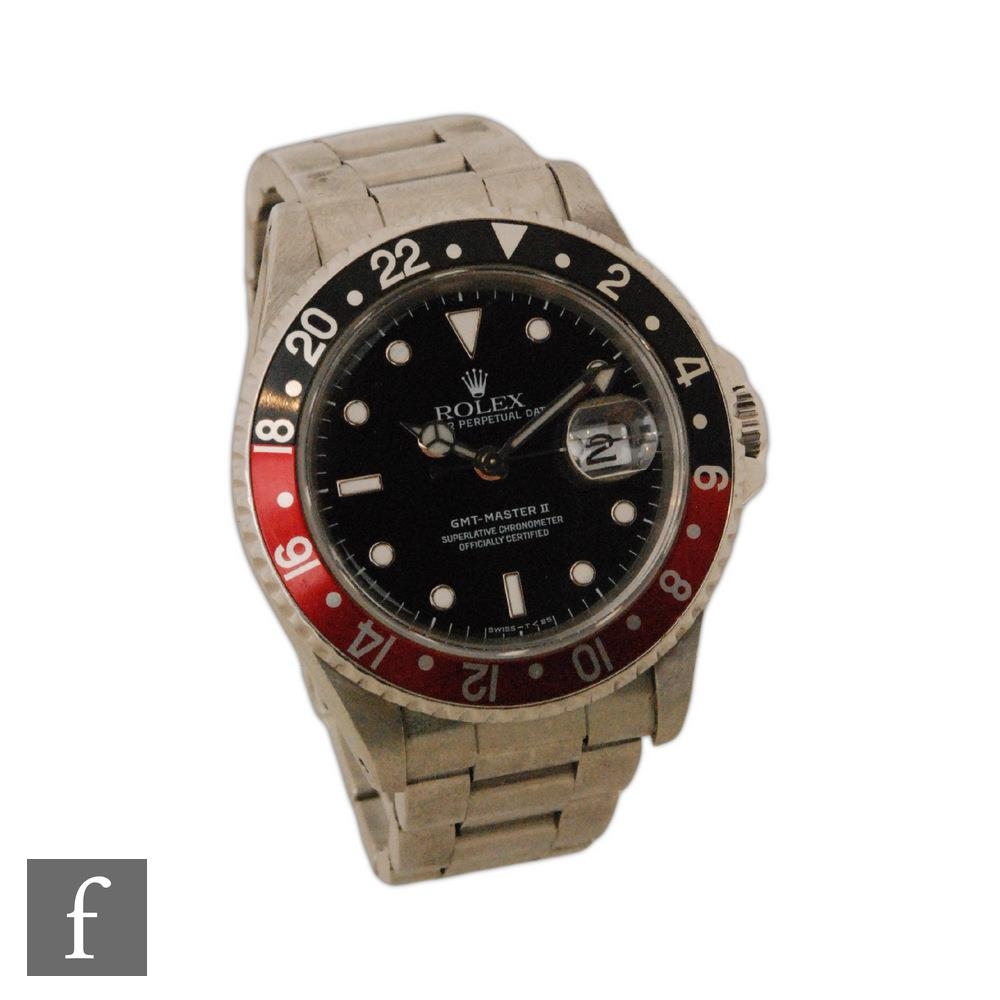 A gentleman's stainless steel wrist watch, Rolex GMT Master II, 16710, 'Coke' bezel, black dial with sweep second hand, case diameter 40mm, movement numbered 7141***, date aperture, screw down crown, steel bracelet numbered 78360, with receipt dated 2015, booklet, guarantee, card and inner and outer boxes.