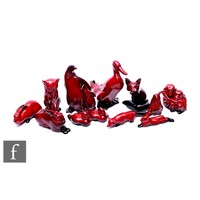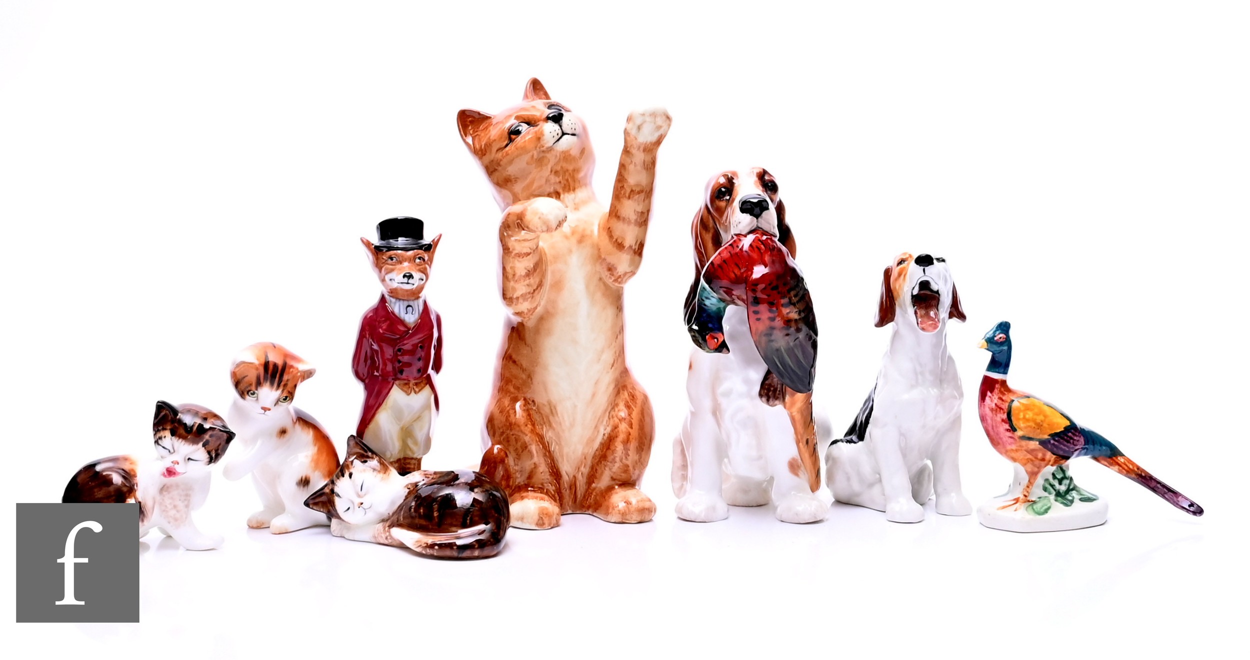 A collection of animal figures, to include a Beswick 'Ginger Cat', impressed no.1883 and printed marks, height 15cm, three Royal Doulton kittens, HN2580 - HN2582, a Royal Doulton figure of a spaniel with game bird HN1028, a Royal Doulton fox, modelled standing and dressed in hunting attire No.D6445, a small earthenware pheasant and a yawning beagle, unmarked. (9)