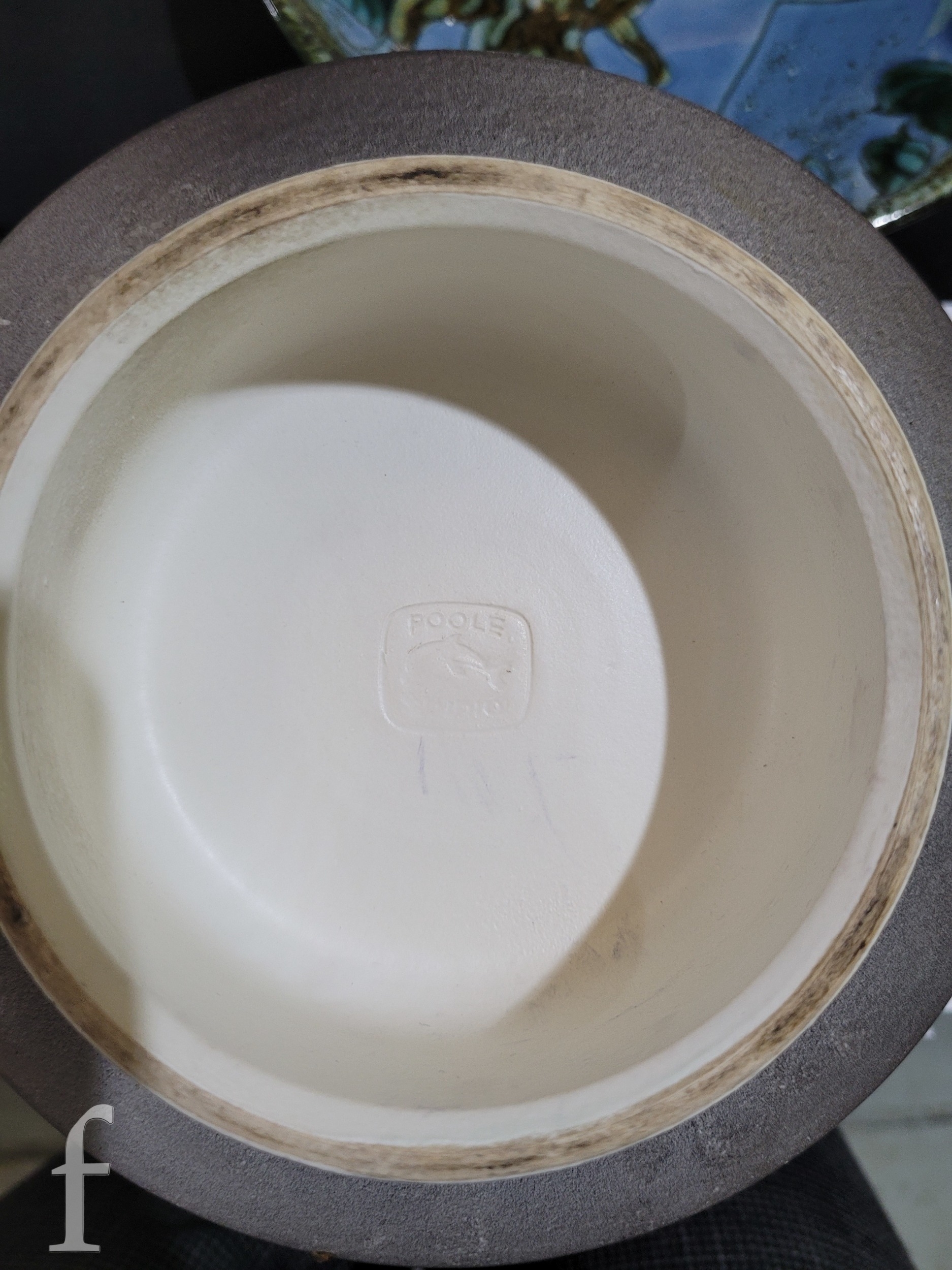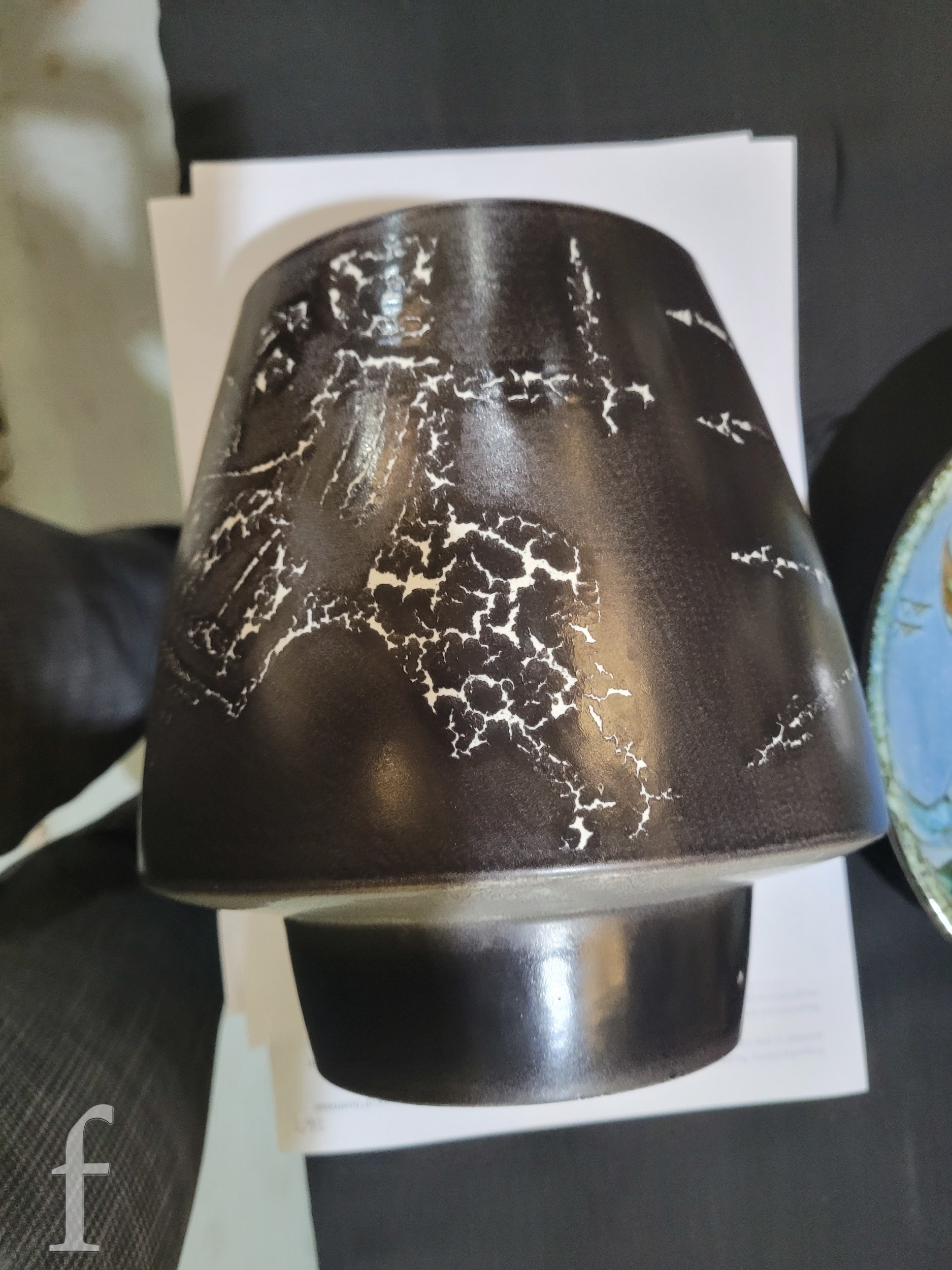 A Poole Studio pottery vase, of tapered conical form on circular foot, craquelure en grisaille stylised hunting figures on horseback over charcoal ground, impressed TV mark to base, height 20cm.