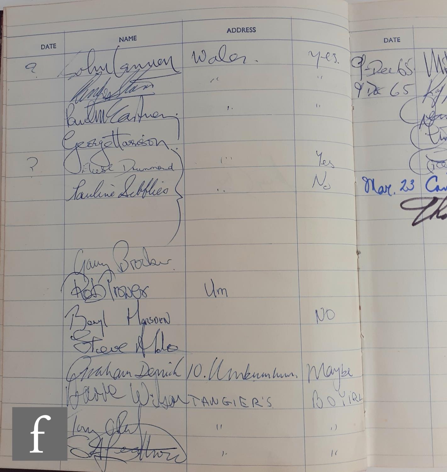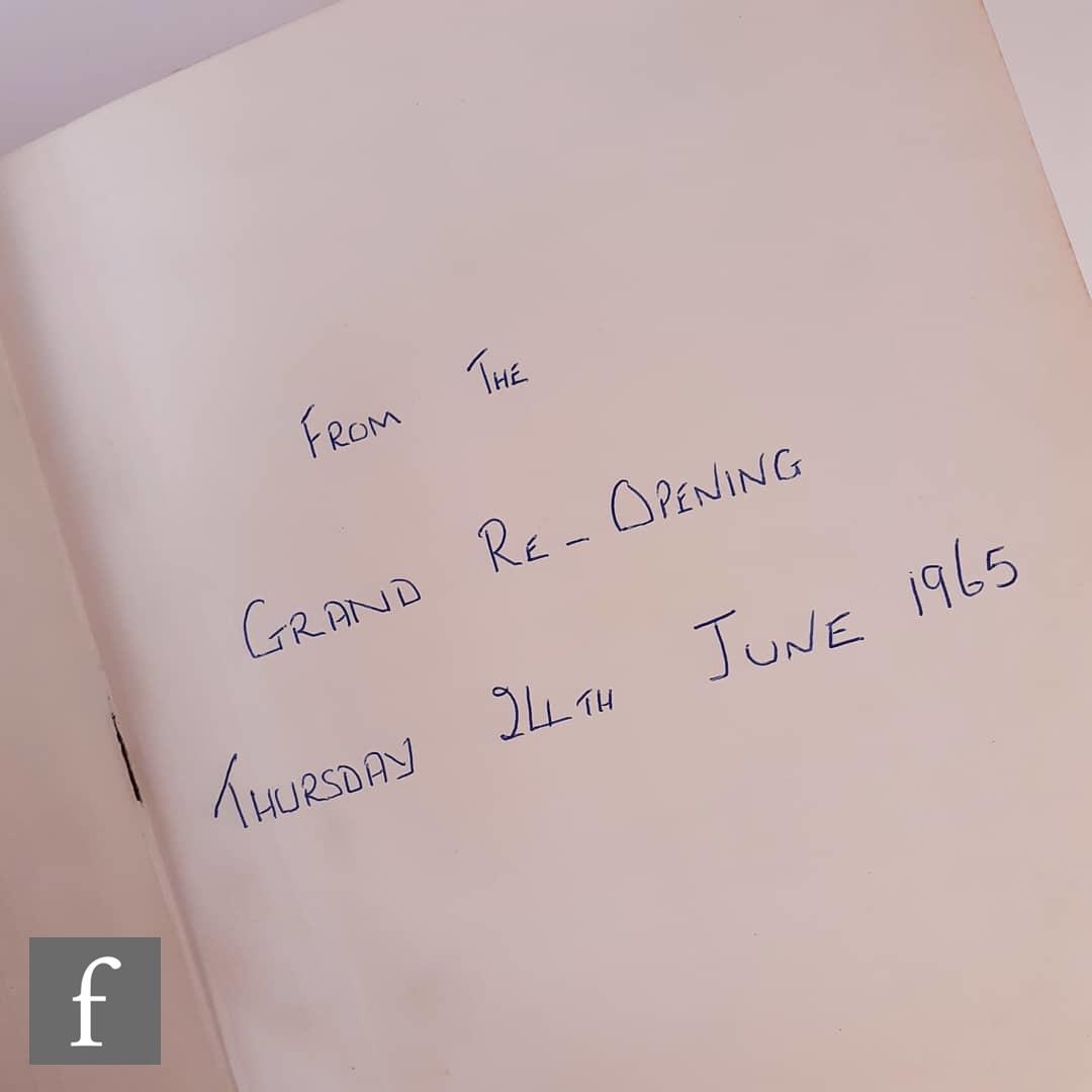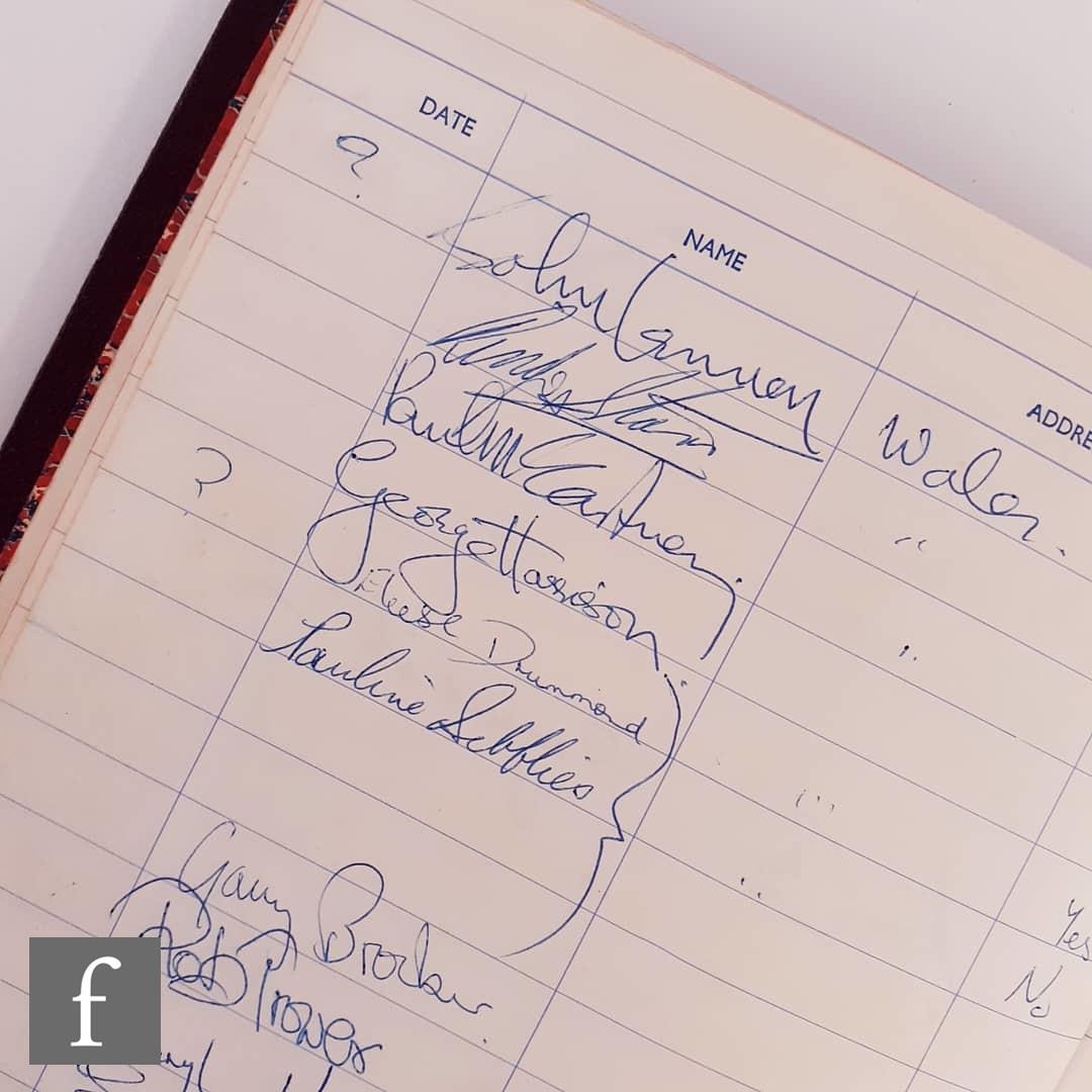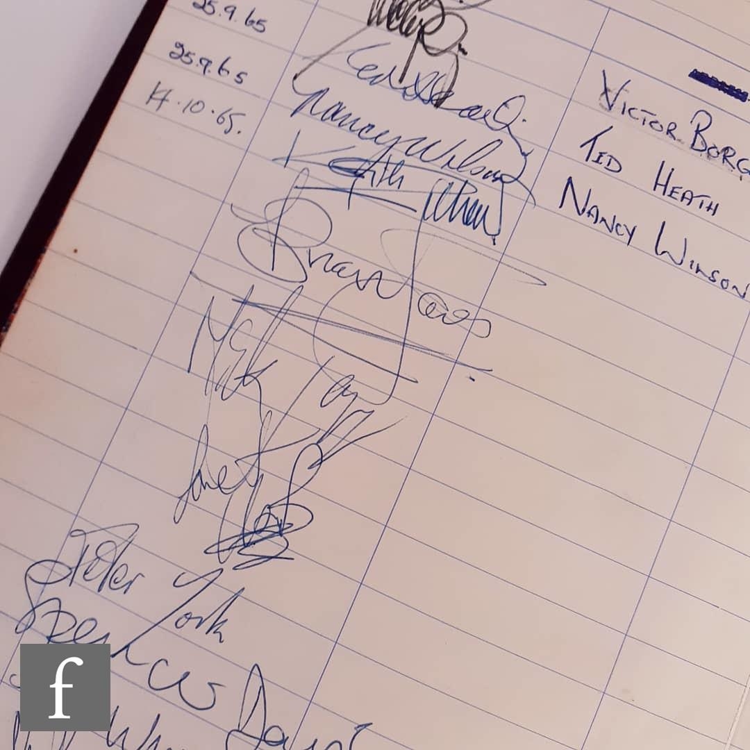 A 1965 autographed visitor book, this book was used for the Grand Hotel, Birmingham re-opening on 24th June 1965, signatures include The Rolling Stones - dated 14-10-65, Keith Richards, Brian Jones, Mick Jagger, Charlie Watts, Bill Wyman, The Beatles - John Lennon, Paul McCartney, George Harrison and Ringo Starr, Victor Borge, Ted Heath, Nancy Wilson, Spencer Davies, Steve Winward, Muff Winward, Pam Smith, Andy Williams, Diane Clayton, Perry Como, Pauline Sibblies, Garry Brooker, Robin Trower, Beryl Marsden, Steve Aldo, Graham Derrick, Barry Wilson, Tony Olaf, Mike Pinder, Ray Thomas, Denny Lane, Clint Warwick, Graeme Edge, Candy Clarke. PROVENANCE: This visitor book was acquired in the 1970s in Birmingham and has been in the family's possession since that time and thence by descent.