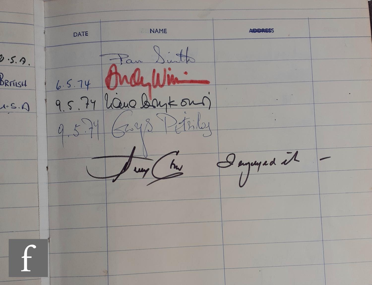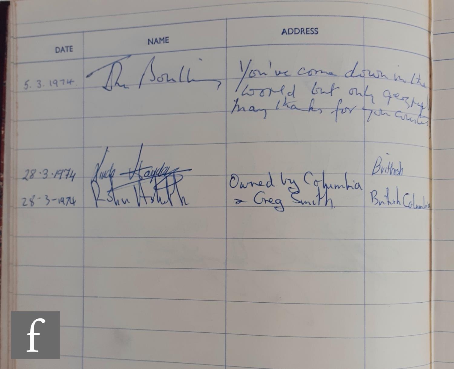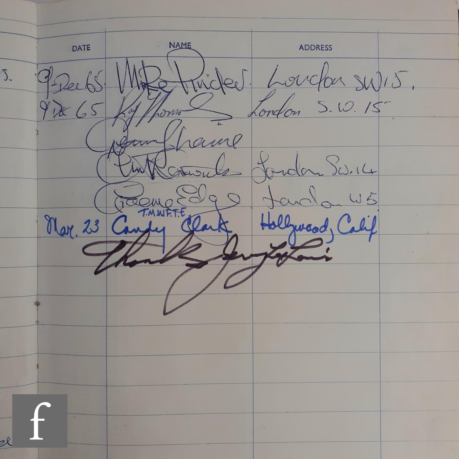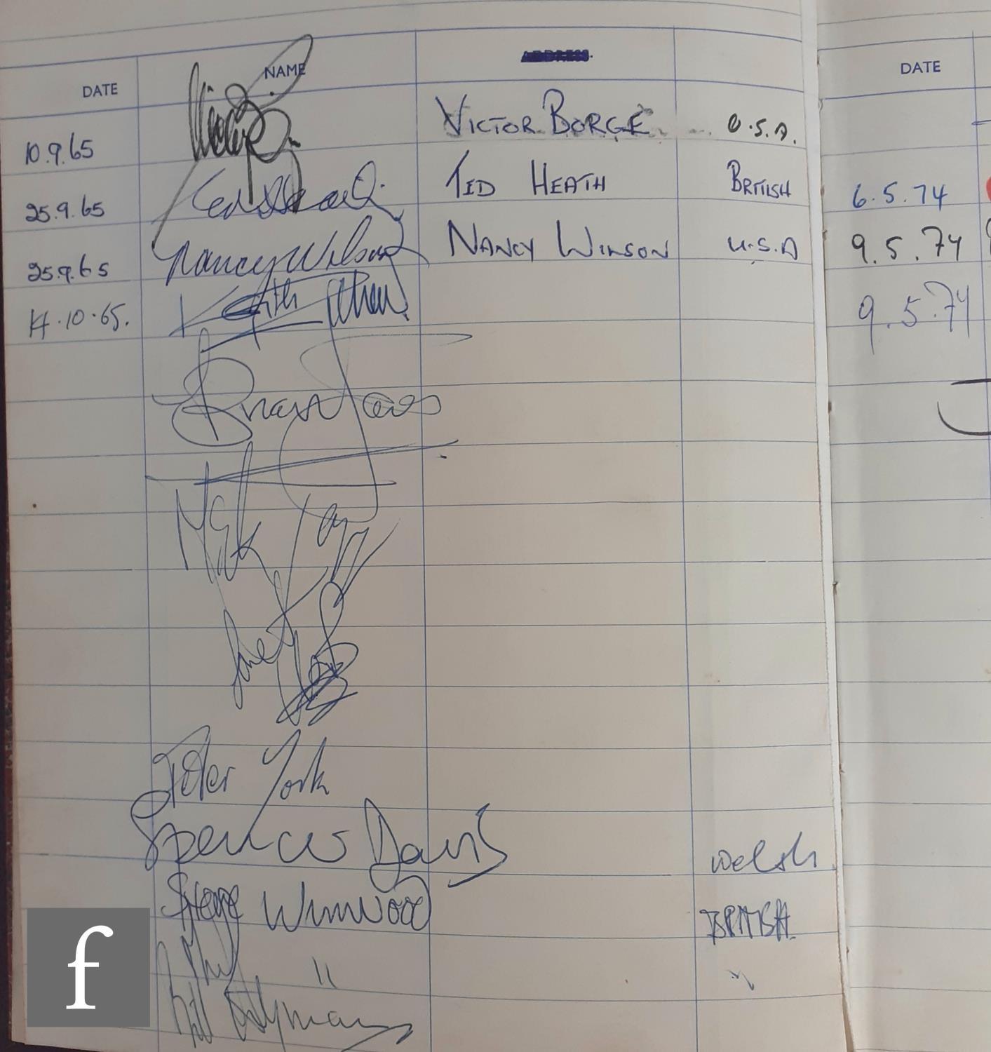 A 1965 autographed visitor book, this book was used for the Grand Hotel, Birmingham re-opening on 24th June 1965, signatures include The Rolling Stones - dated 14-10-65, Keith Richards, Brian Jones, Mick Jagger, Charlie Watts, Bill Wyman, The Beatles - John Lennon, Paul McCartney, George Harrison and Ringo Starr, Victor Borge, Ted Heath, Nancy Wilson, Spencer Davies, Steve Winward, Muff Winward, Pam Smith, Andy Williams, Diane Clayton, Perry Como, Pauline Sibblies, Garry Brooker, Robin Trower, Beryl Marsden, Steve Aldo, Graham Derrick, Barry Wilson, Tony Olaf, Mike Pinder, Ray Thomas, Denny Lane, Clint Warwick, Graeme Edge, Candy Clarke. PROVENANCE: This visitor book was acquired in the 1970s in Birmingham and has been in the family's possession since that time and thence by descent.