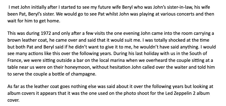We have further found a black and white promo image from 1972 with John Bonham wearing an identical photo and further images with John Bonham and Led Zeppelin. In these photographs John Bonham is wearing an identical leather Jacket, which we strongly believe is the same leather coat, however we have no further confirmation.