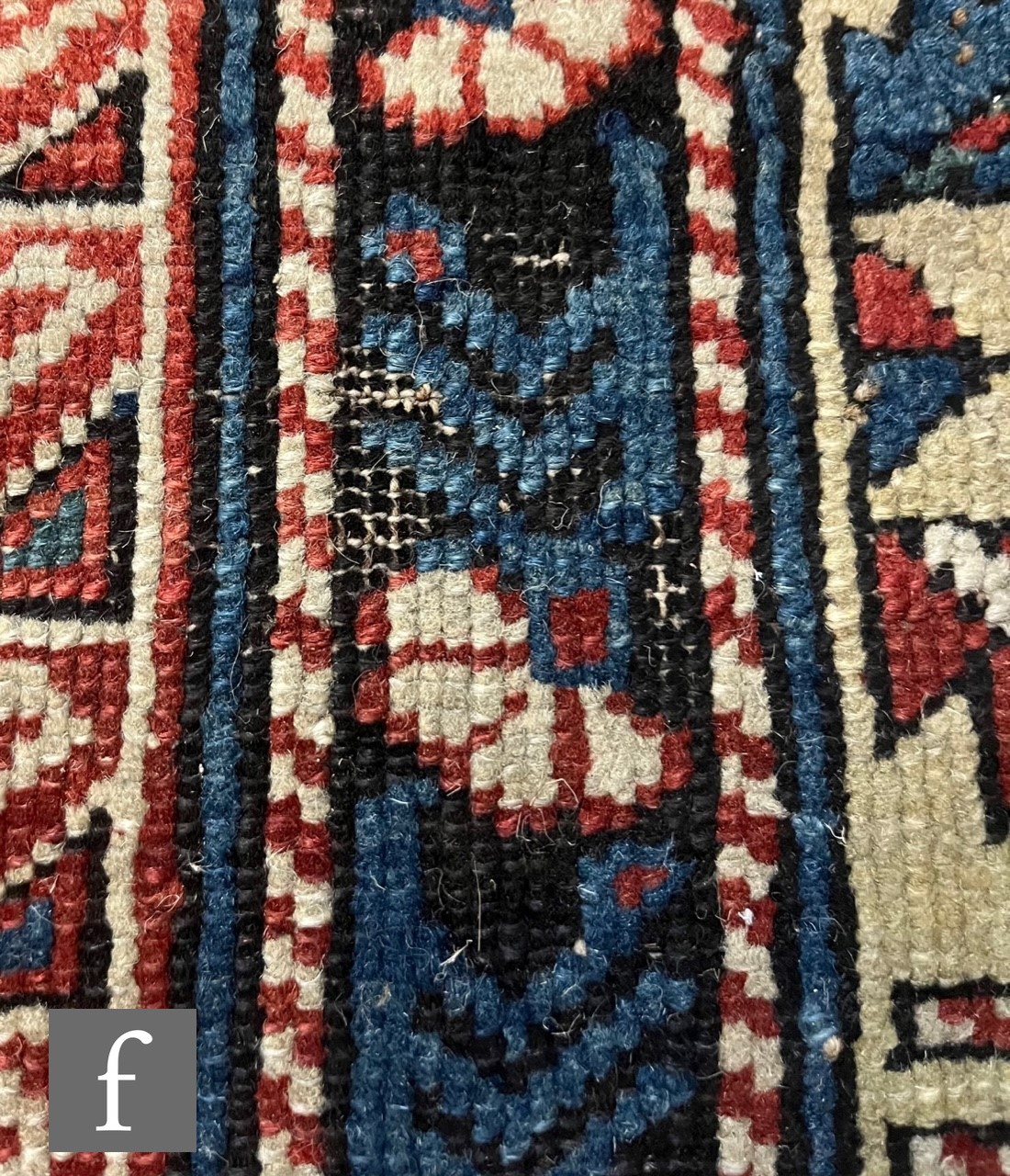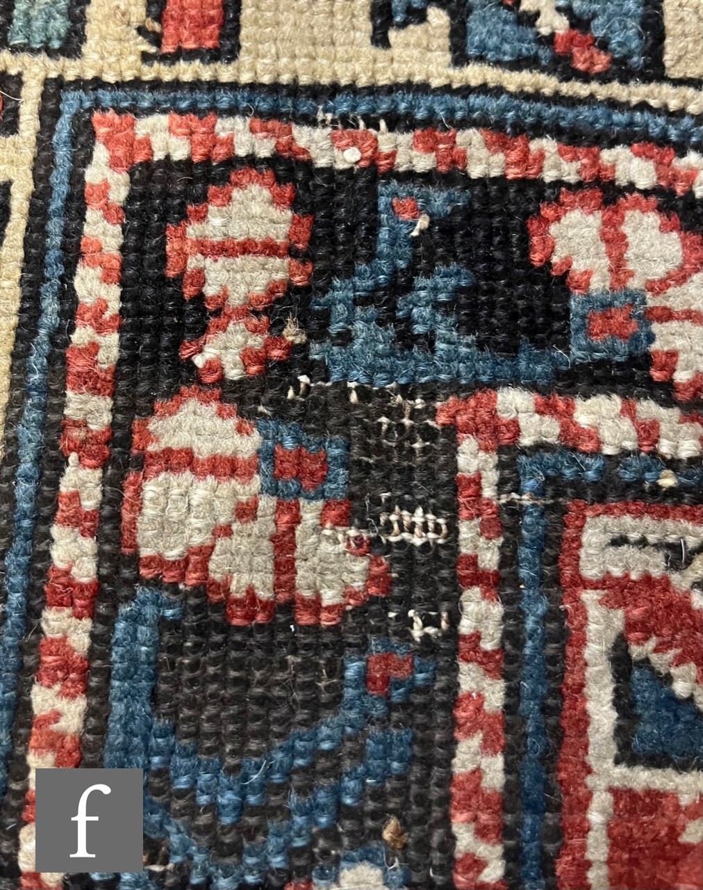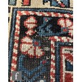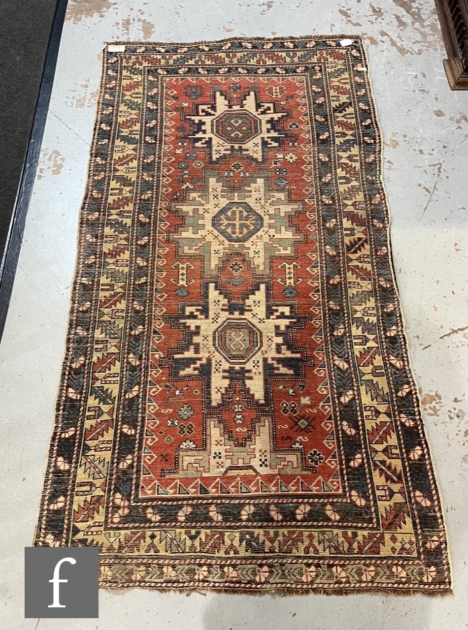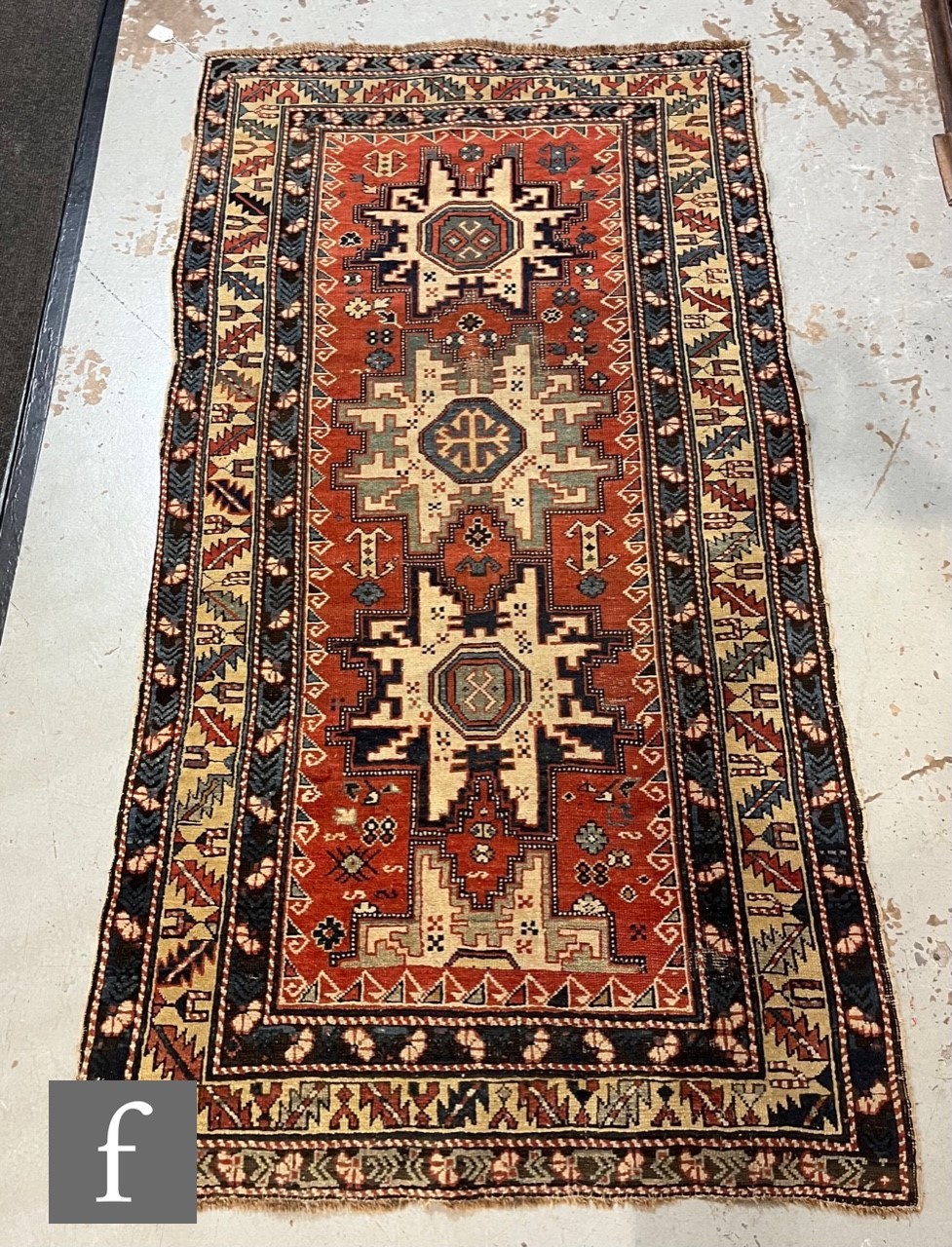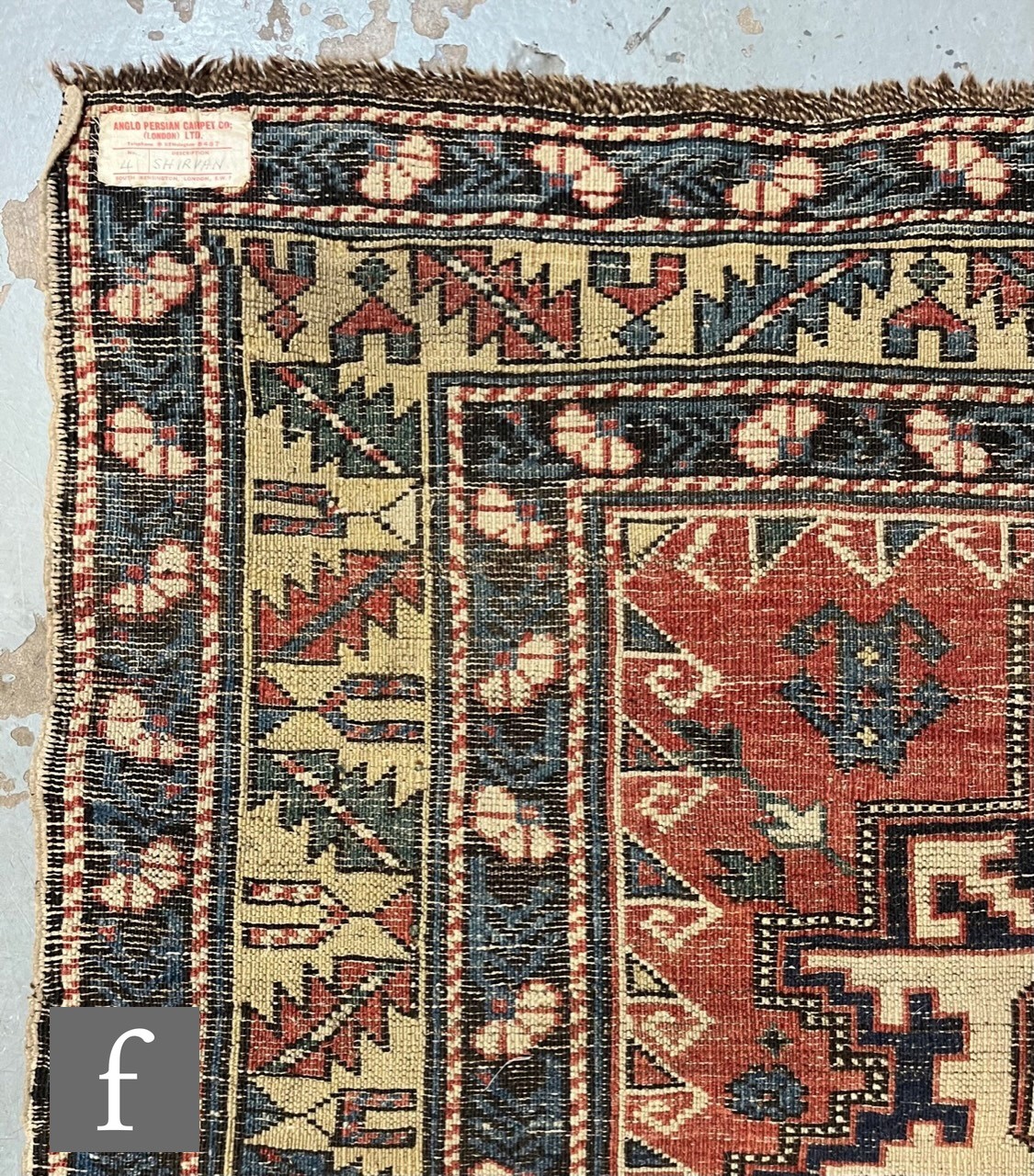 A Shirvan flat woven rug of deep blue, rust and oatmeal ground colours, with triple medallions to the central field within repeat pattern borders, bearing Anglo Persian Carpet Company label, 190cm x 100cm, some damage and repair