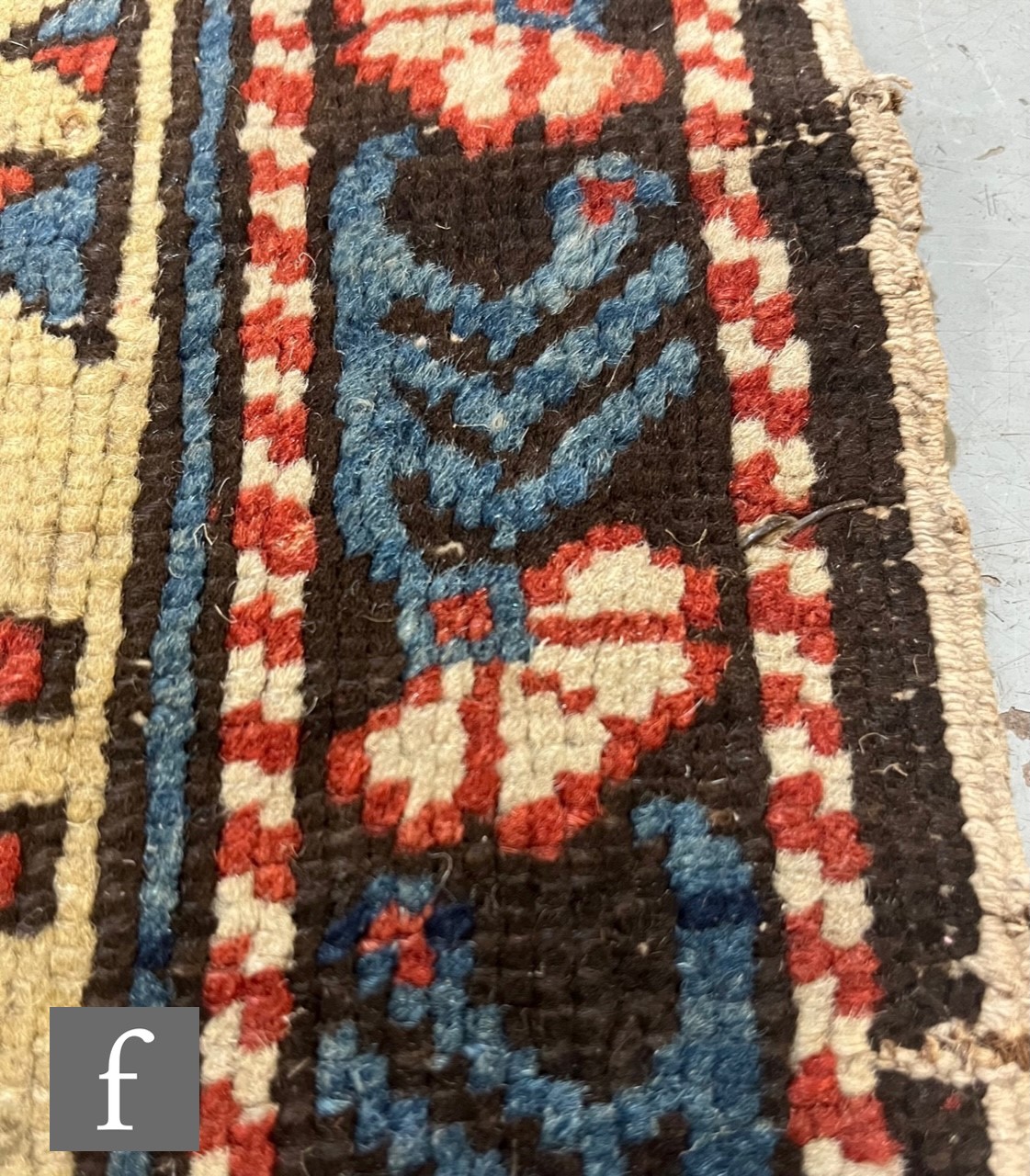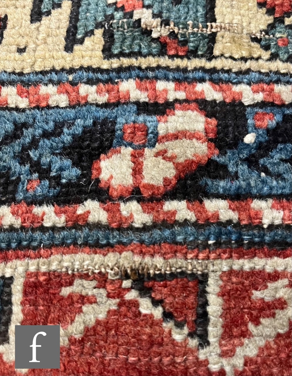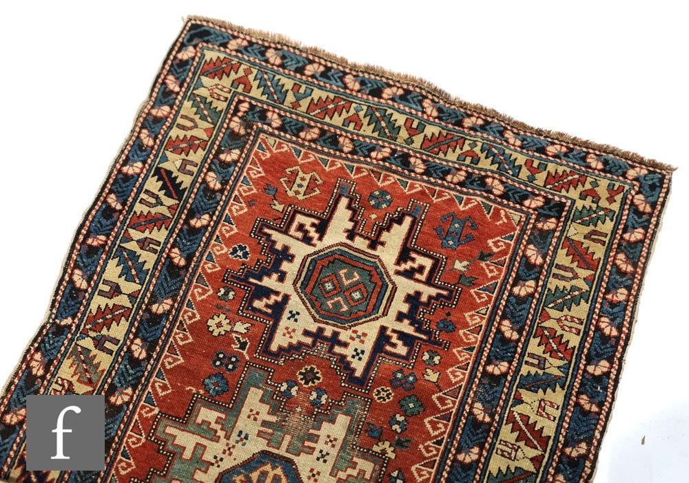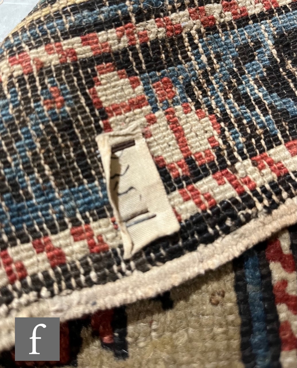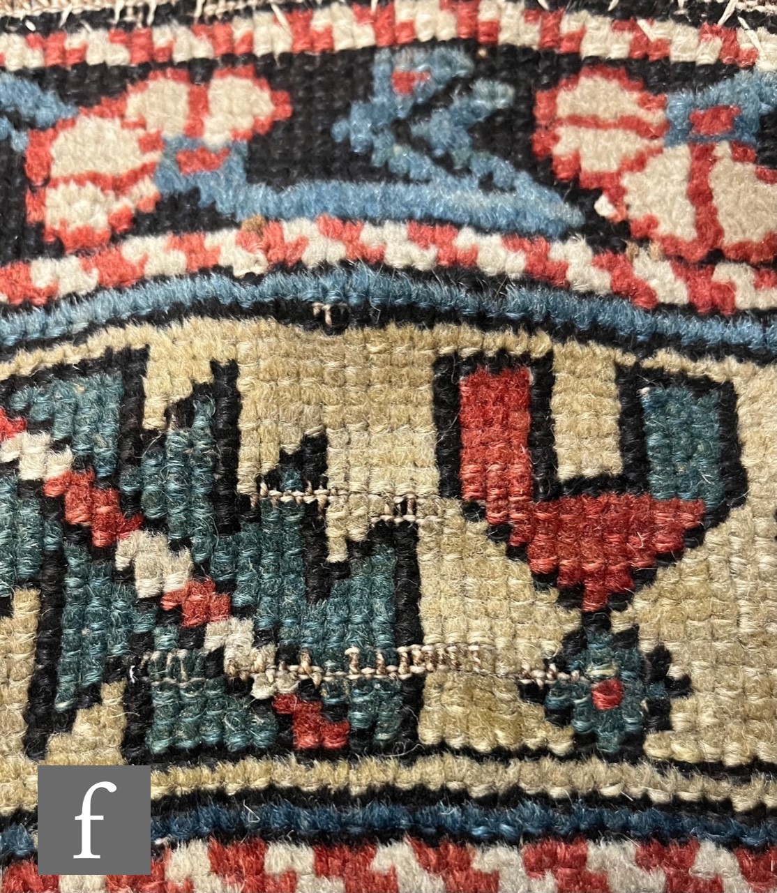 A Shirvan flat woven rug of deep blue, rust and oatmeal ground colours, with triple medallions to the central field within repeat pattern borders, bearing Anglo Persian Carpet Company label, 190cm x 100cm, some damage and repair