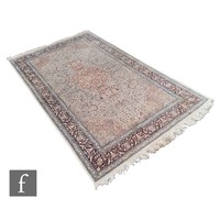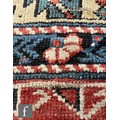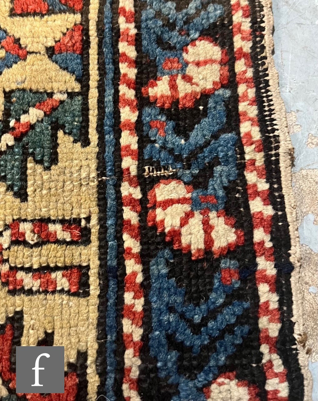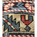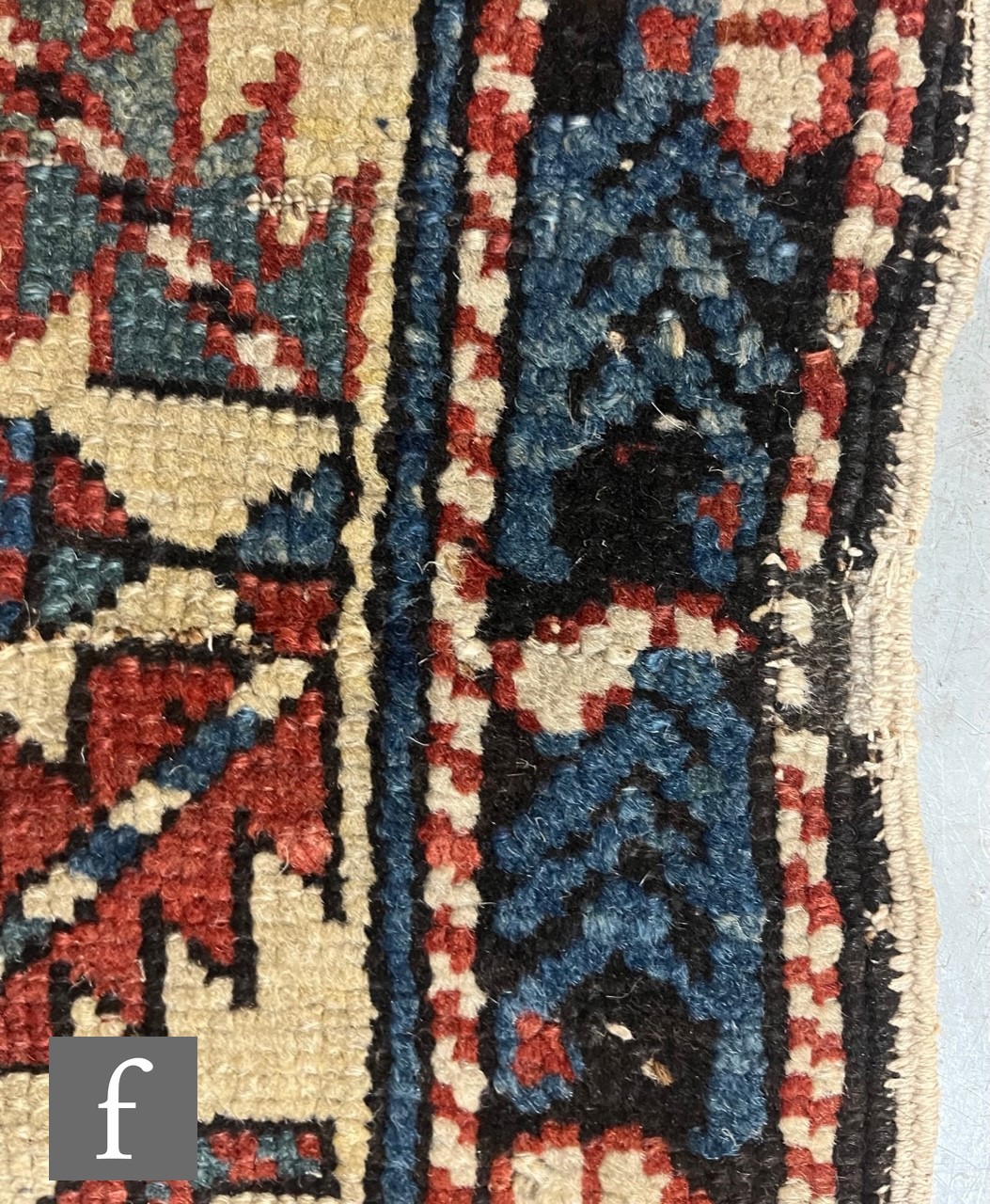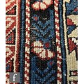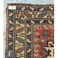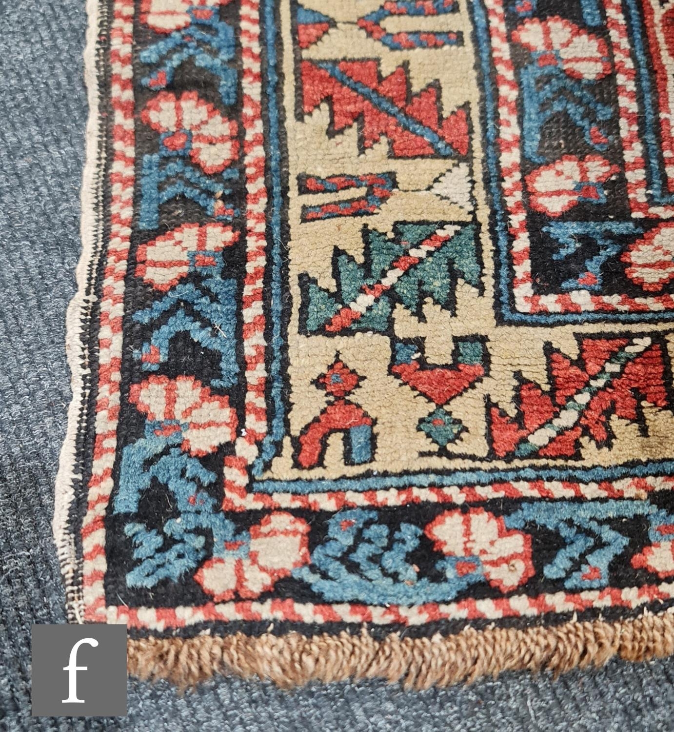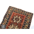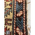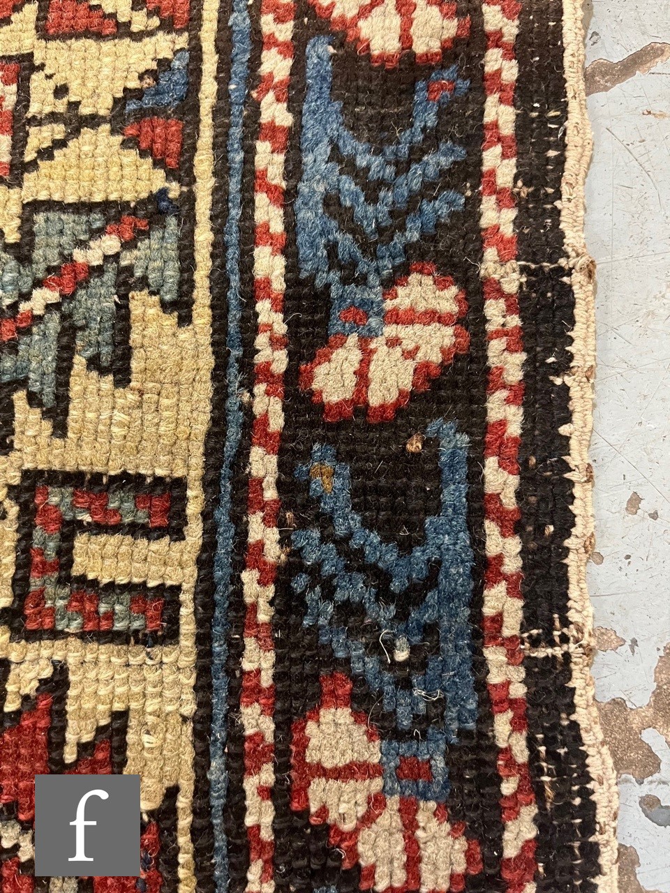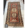 A Shirvan flat woven rug of deep blue, rust and oatmeal ground colours, with triple medallions to the central field within repeat pattern borders, bearing Anglo Persian Carpet Company label, 190cm x 100cm, some damage and repair