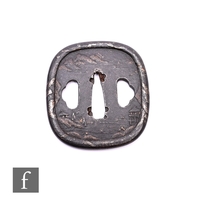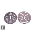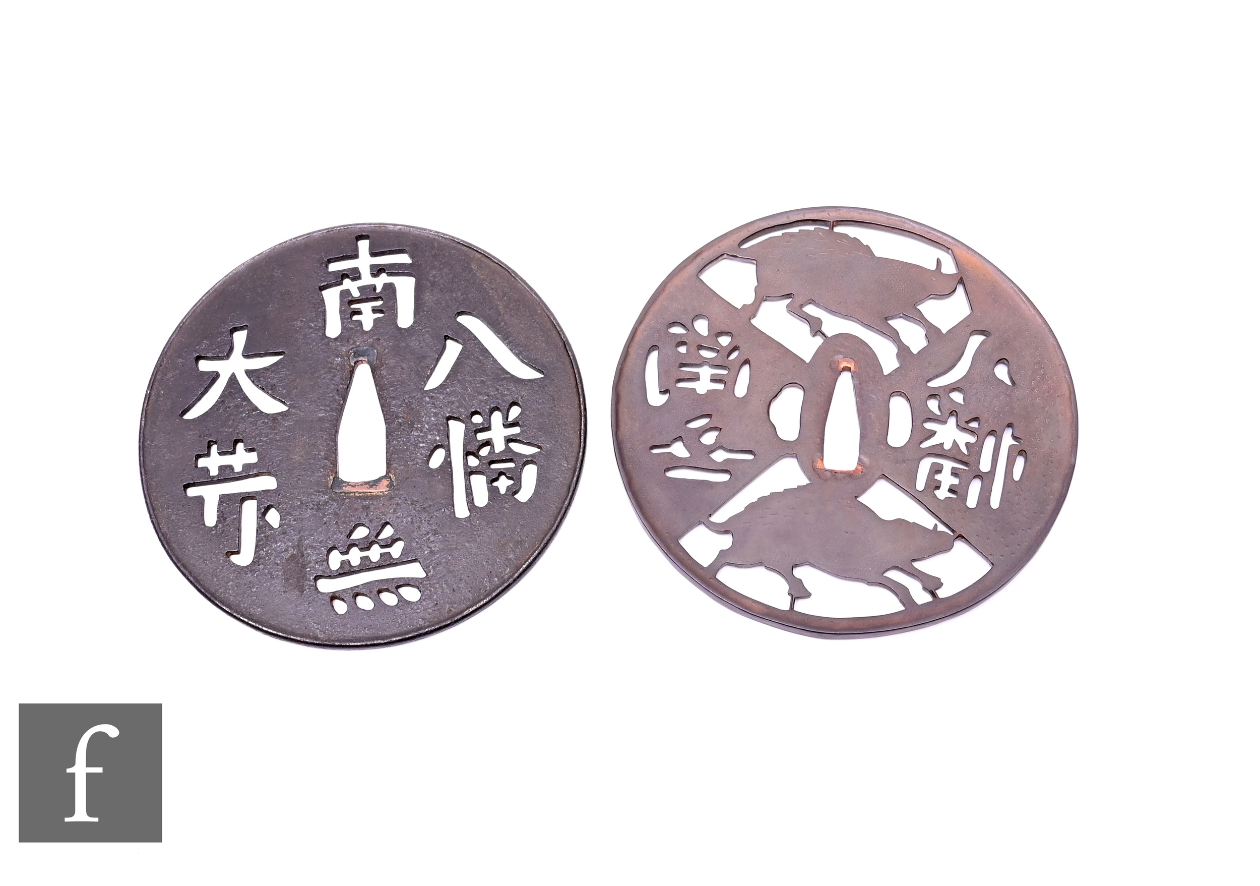 Two Japanese iron Tsuba plaques, the first with auspicious characters and the accompanying plaque with boar designs, both diameters 11cm. (2)