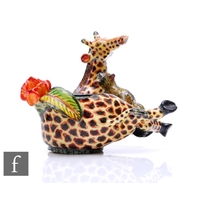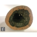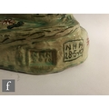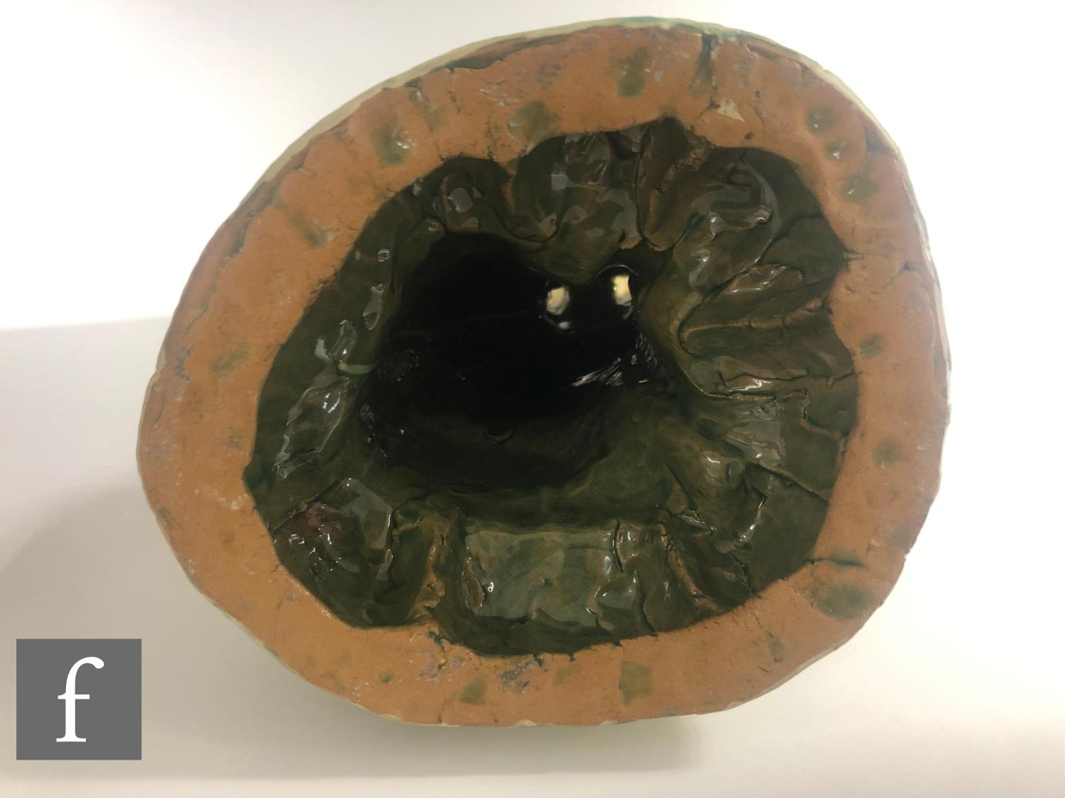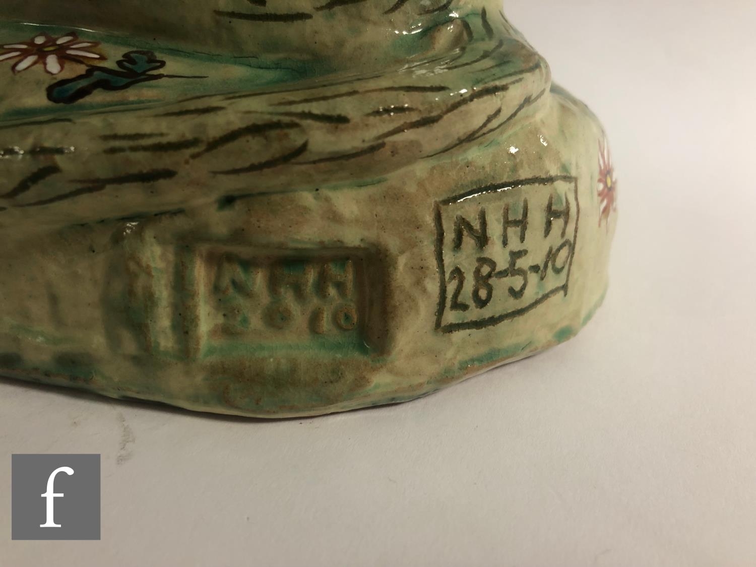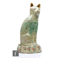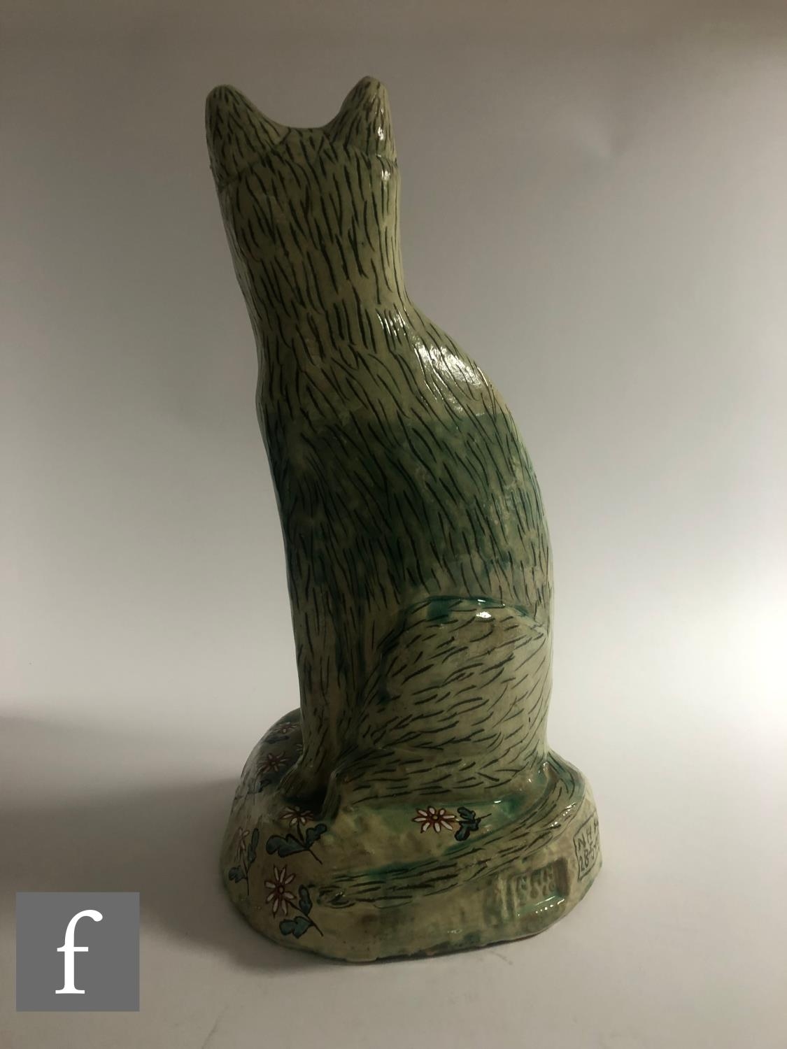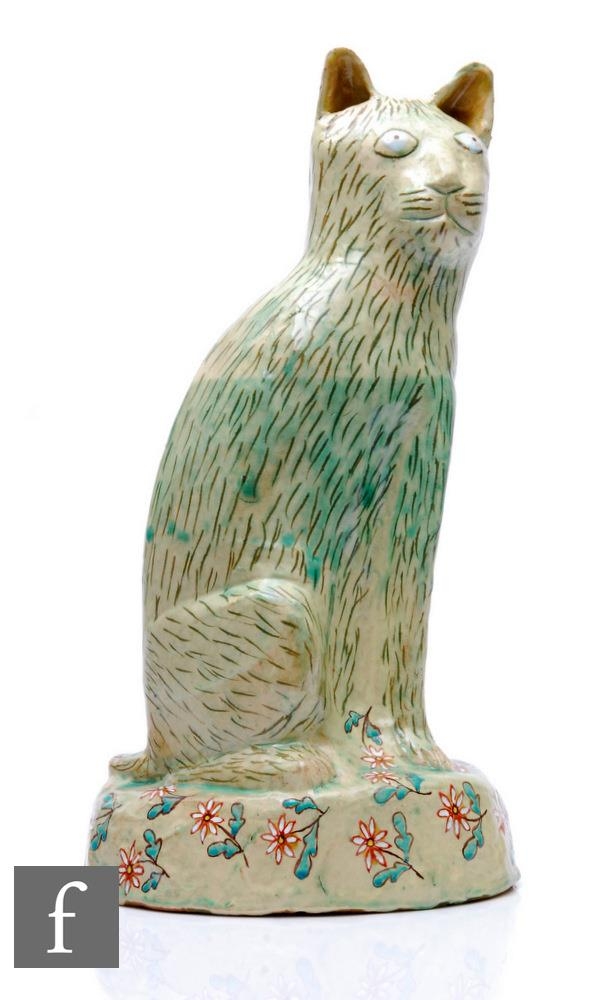 Hylton Nel - A large hand crafted studio pottery figure of a large seated cat with upright ears, decorated with a tonal mottled green glaze over the terracotta ground with incised decoration, mounted to a domed base, enamel decorated with daisies, impressed stamp and incised mark with a date for 28-5-10, height 41cm.