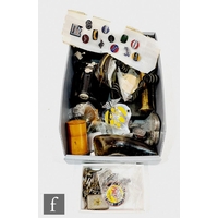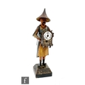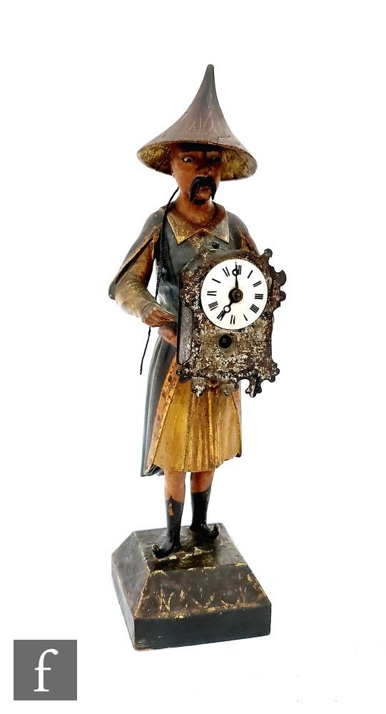 An early 20th Century clock automaton of a Chinese man wearing a hat and traditional clothes and holding a clock with spring driven barrel movement, standing on a plinth, height 43cm, A/F.
