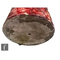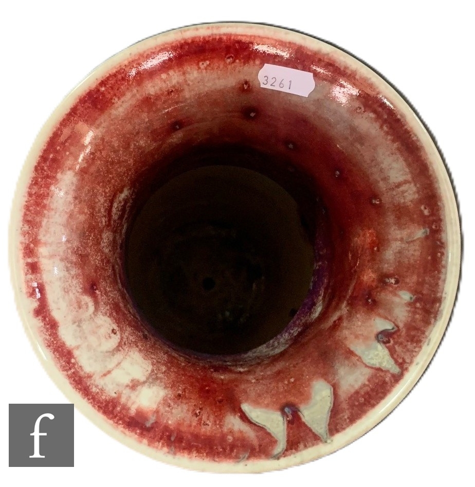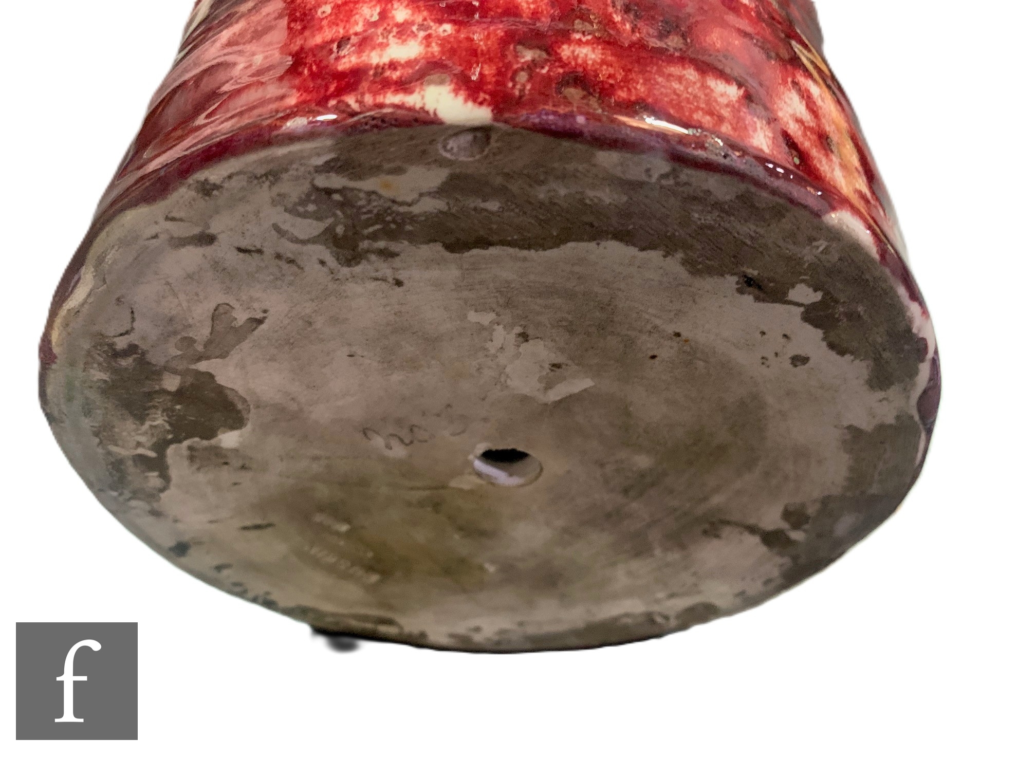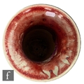 Ruskin Pottery - A High Fired vase and stand, circa 1925, slender shouldered sleeve form with everted rim, Sang De Boeuf and lavender curtained glazed with green oxide speckles, impressed marks to base, height 59cm, the stand, of stepped circular form, modelled in the Chinese style, with penwork band, and geometric borders, on four feet, overall height 67cm.