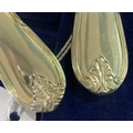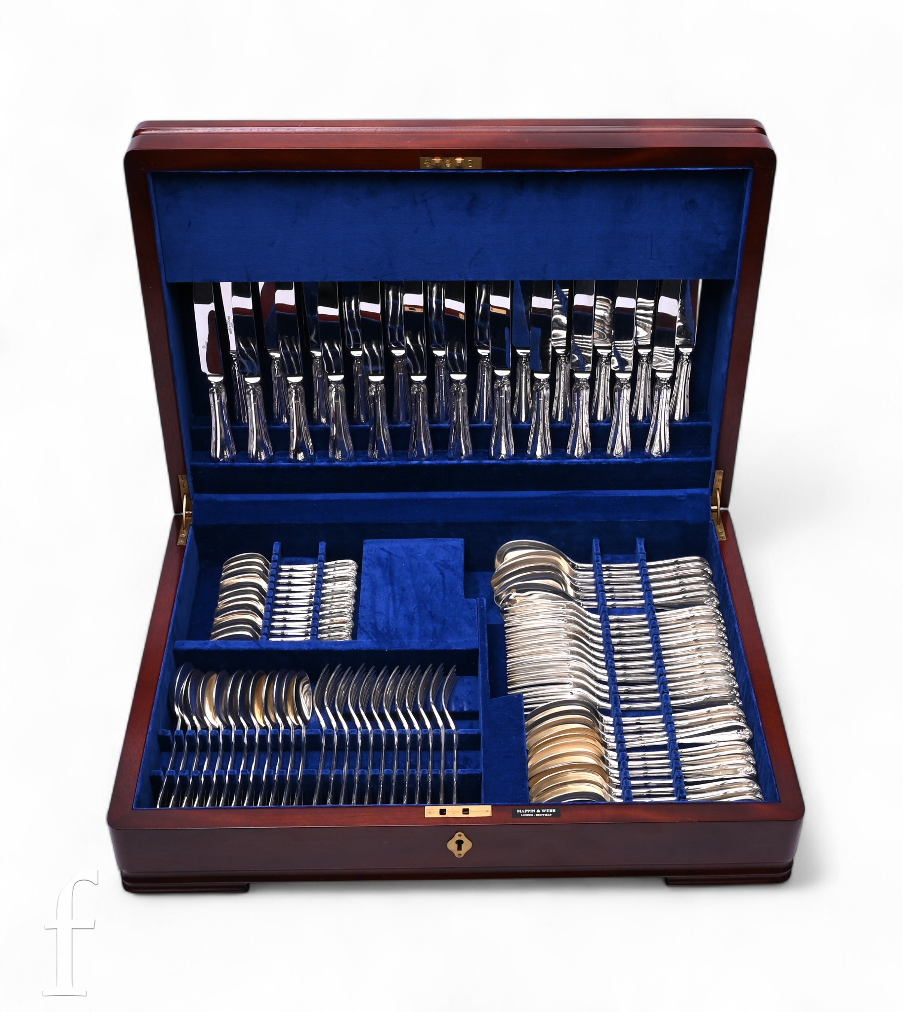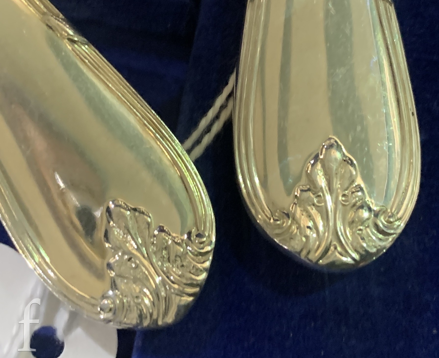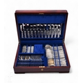 An Elizabeth II silver canteen of cutlery, Mappin & Webb, Sheffield 1997, twelve place settings, comprising dinner knives and forks, entree knives and forks, soup spoons, dessert spoons, teaspoons, four table spoons and a pair of silver salad servers, in velvet lined wooden case, weight without knives 142.39ozt.