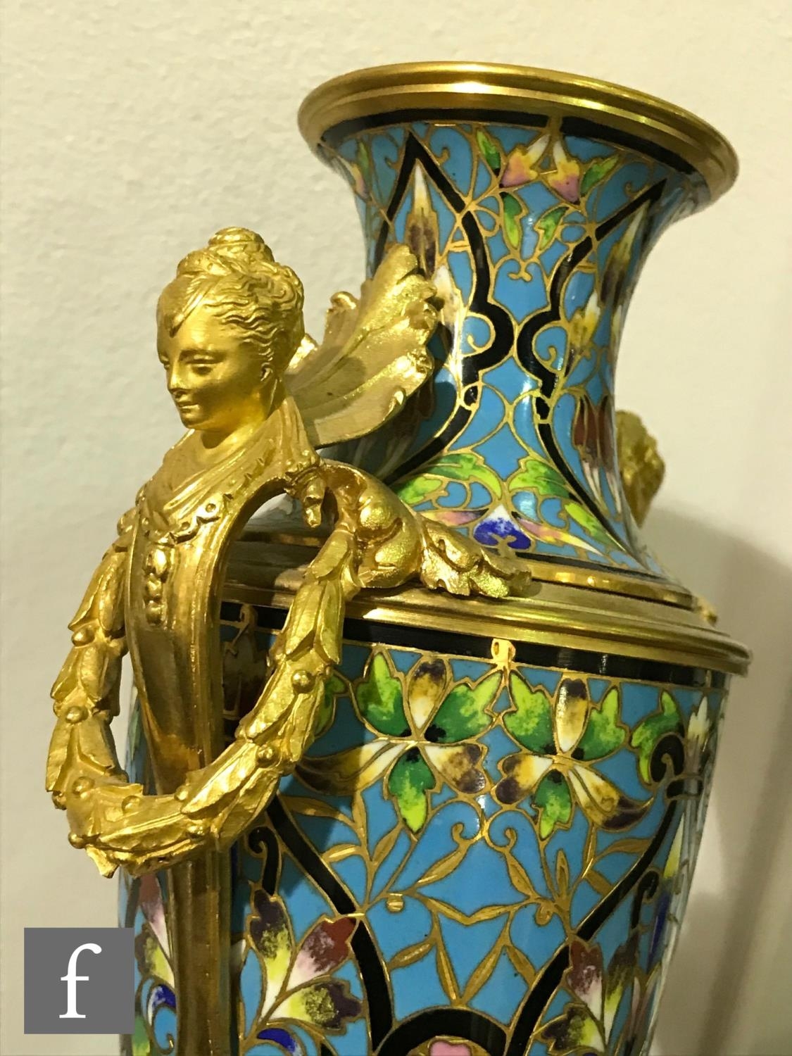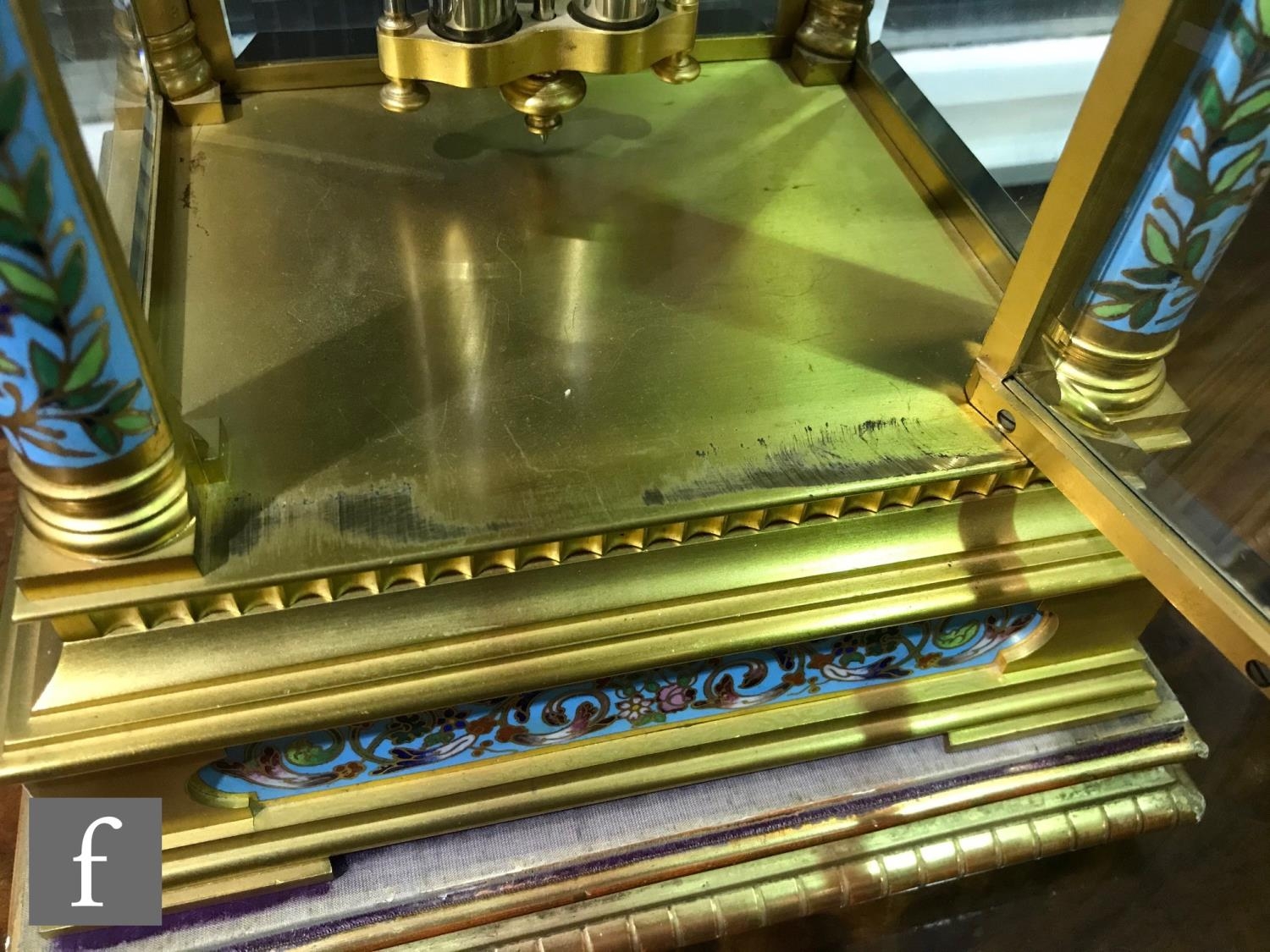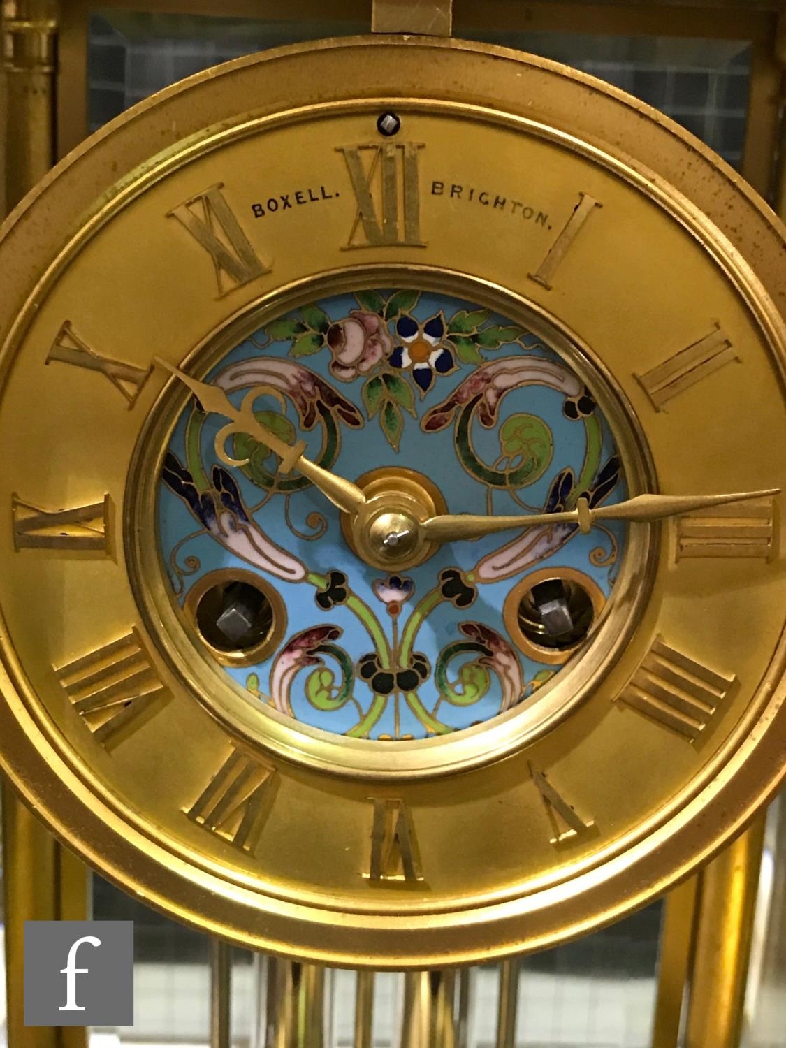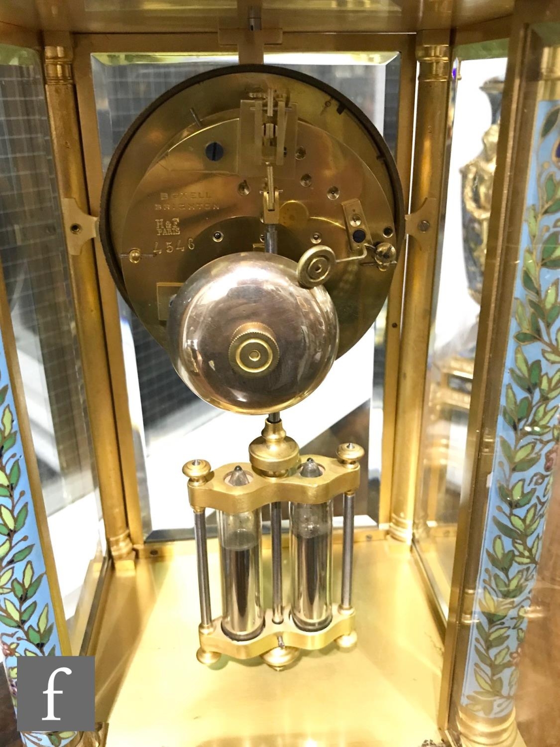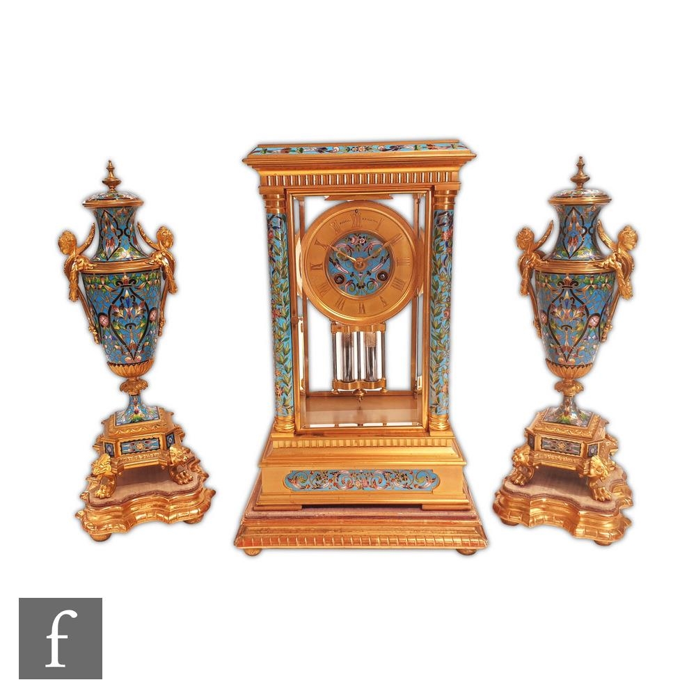 A late 19th Century French ormolu and champleve enamel clock garniture, the four sided glass panel clock with bevel-cut panels and four pillars decorated with floral and foliate enamel detail, raised to a stepped base and shallow foot, the gilded dial signed for the retailer Boxell, Brighton, with Roman chapters and an enamelled centre, the eight day movement with mercury compensated pendulum striking on a bell, further stamped Boxell Brighton and H&F Paris and numbered 4546, complete with a gilded wooden plinth, height excluding plinth 34.5cm and 38cm with, together with a pair of conforming lidded urn shaped vases, stamped Henry to the feet, with caryatid twin handles over stepped square bases and lion mask and paw feet, complete with cartouche shaped plinths, height excluding the plinths 33cm and 37cm, S/D (3)