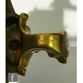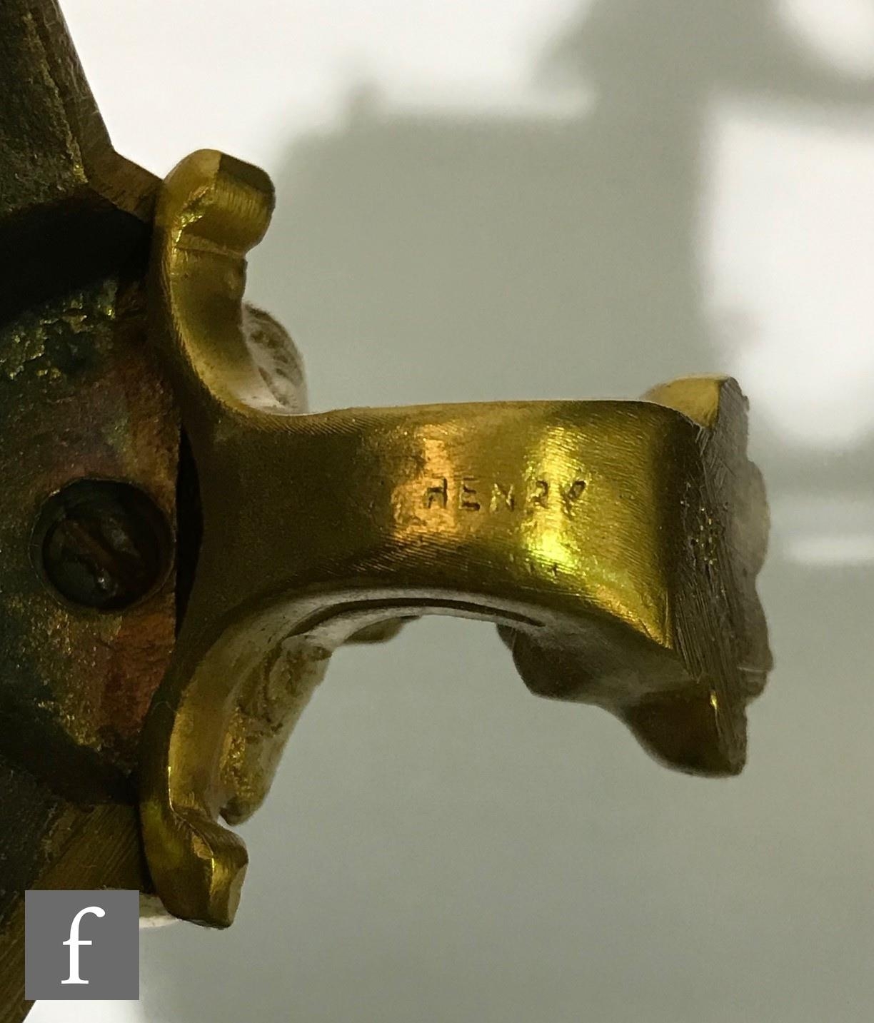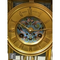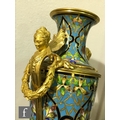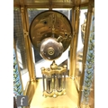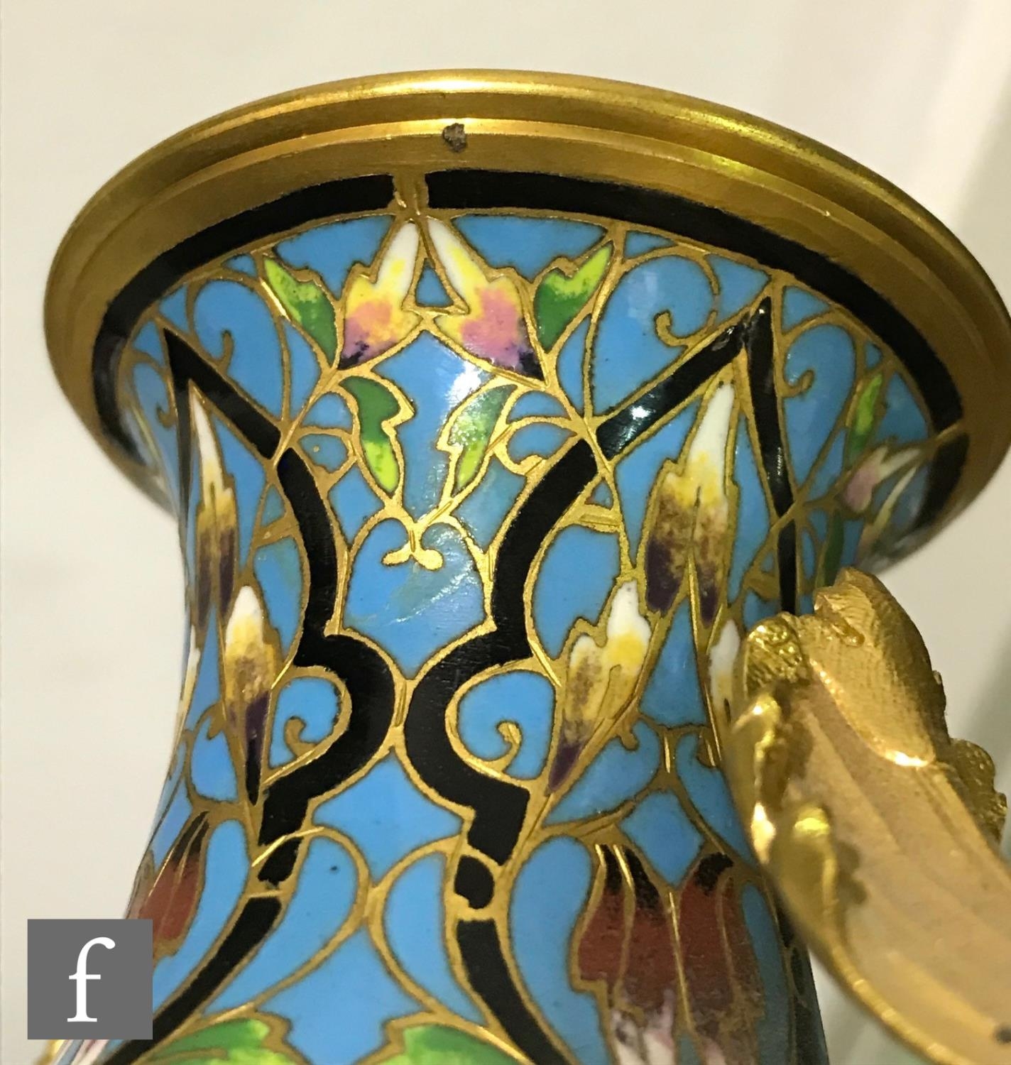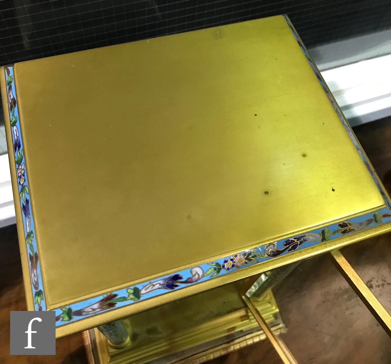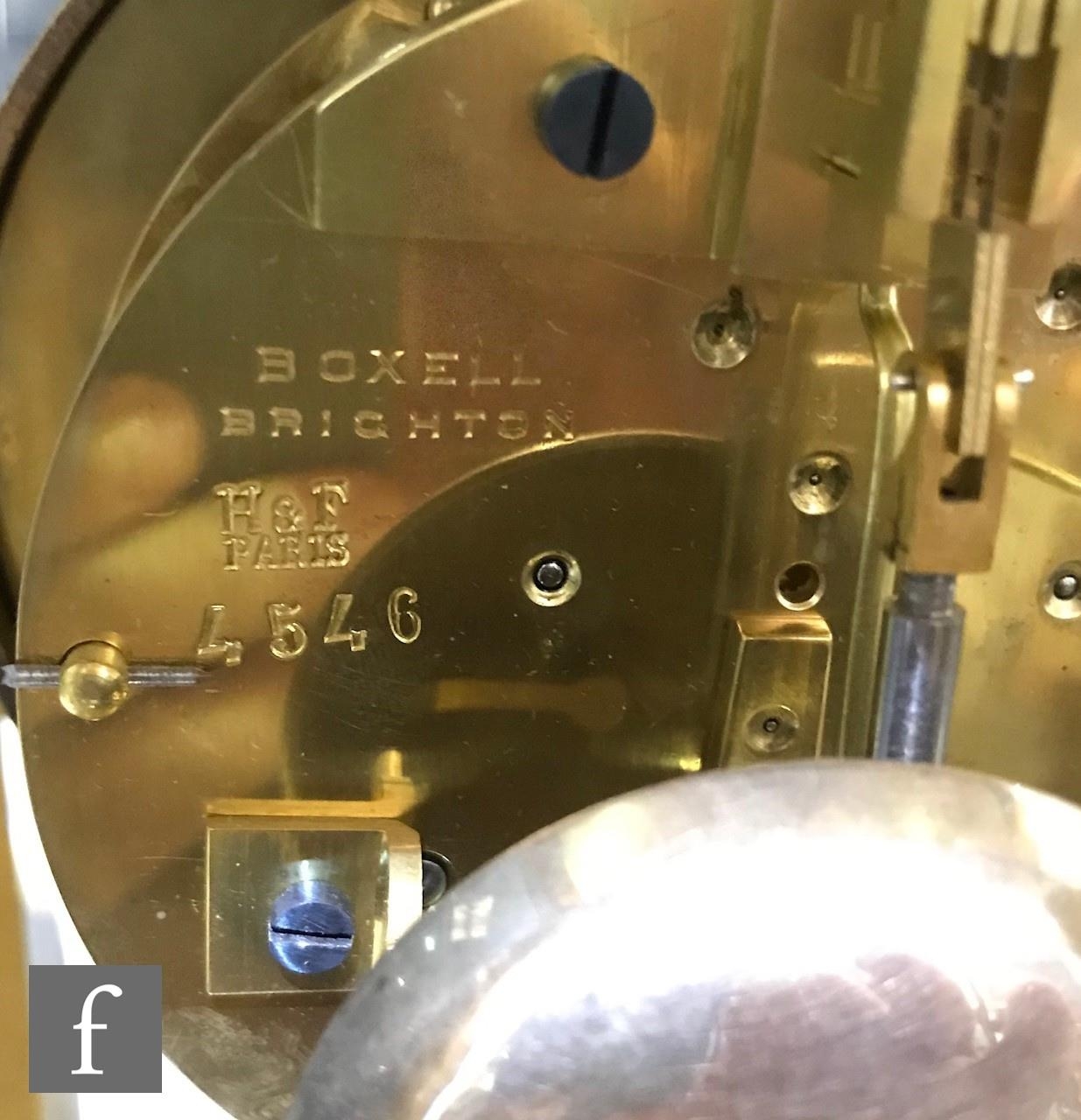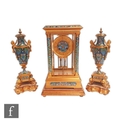 A late 19th Century French ormolu and champleve enamel clock garniture, the four sided glass panel clock with bevel-cut panels and four pillars decorated with floral and foliate enamel detail, raised to a stepped base and shallow foot, the gilded dial signed for the retailer Boxell, Brighton, with Roman chapters and an enamelled centre, the eight day movement with mercury compensated pendulum striking on a bell, further stamped Boxell Brighton and H&F Paris and numbered 4546, complete with a gilded wooden plinth, height excluding plinth 34.5cm and 38cm with, together with a pair of conforming lidded urn shaped vases, stamped Henry to the feet, with caryatid twin handles over stepped square bases and lion mask and paw feet, complete with cartouche shaped plinths, height excluding the plinths 33cm and 37cm, S/D (3)