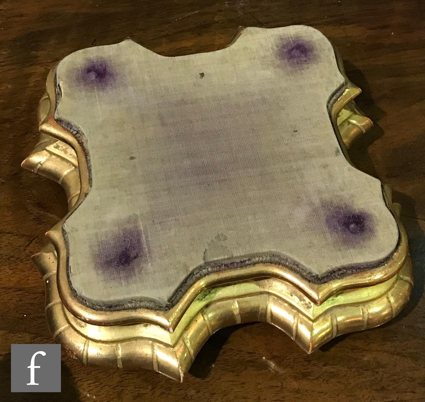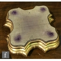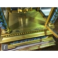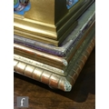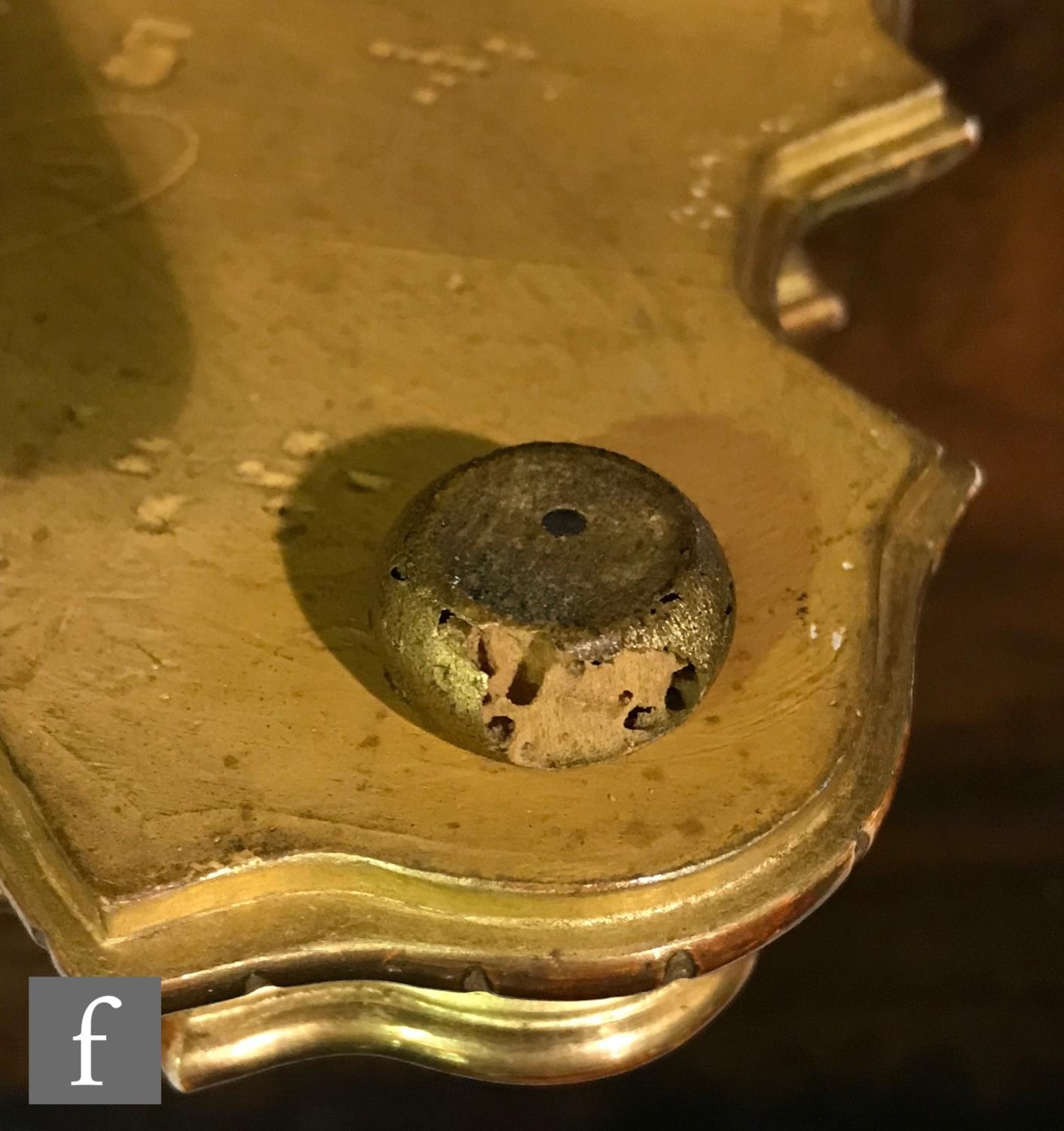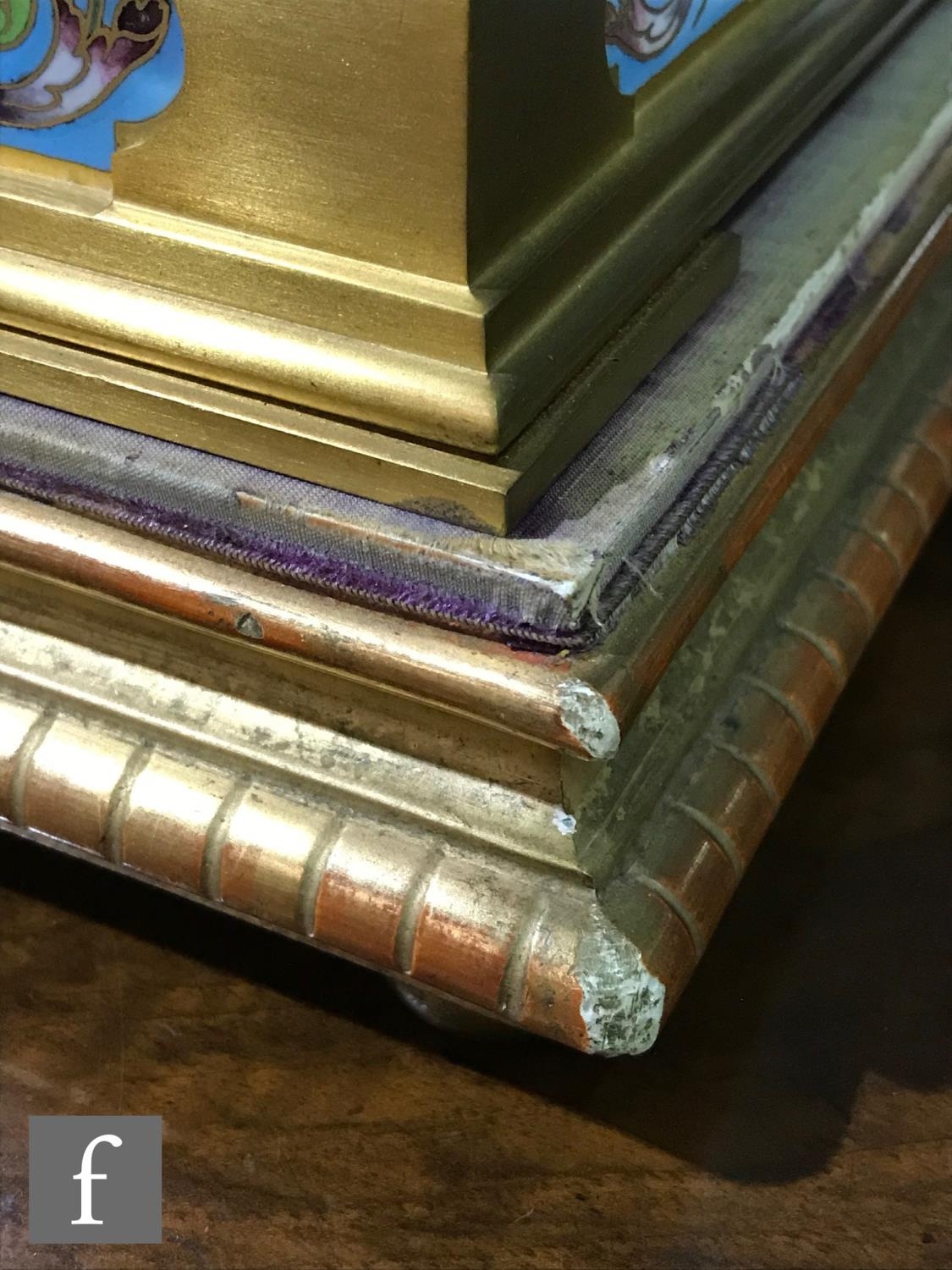 Clock - there are some tarnish spots to the top of the case. There is some scratching around the front of the case just beneath the door. There is some wear to the gilded finish of the wooden plinth and also fading and wear to the edges of the purple velvet top. There is no key.