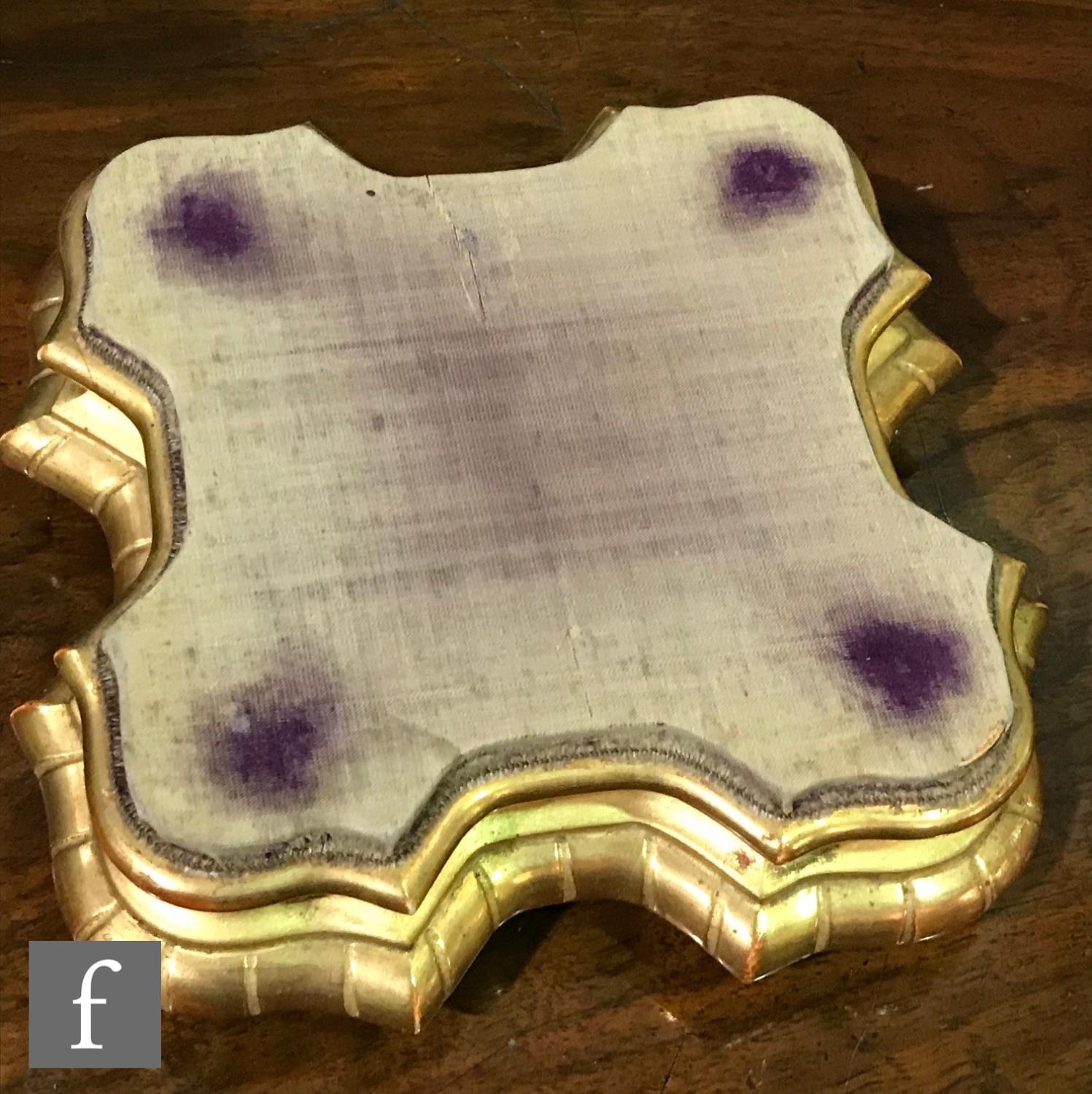 There is a pinhead sized blister or frit just beneath the rim of one of the vases. Both vases retain their covers. There is a chip to the gesso edge of one of the plinths. One of the bun feet is woodworm damaged. There is a chip to the edge of the gilding to the other plinth - this has been overpainted. There is general wear to the gilded finish of each of the plinths and the purple velvet tops are worn and faded.